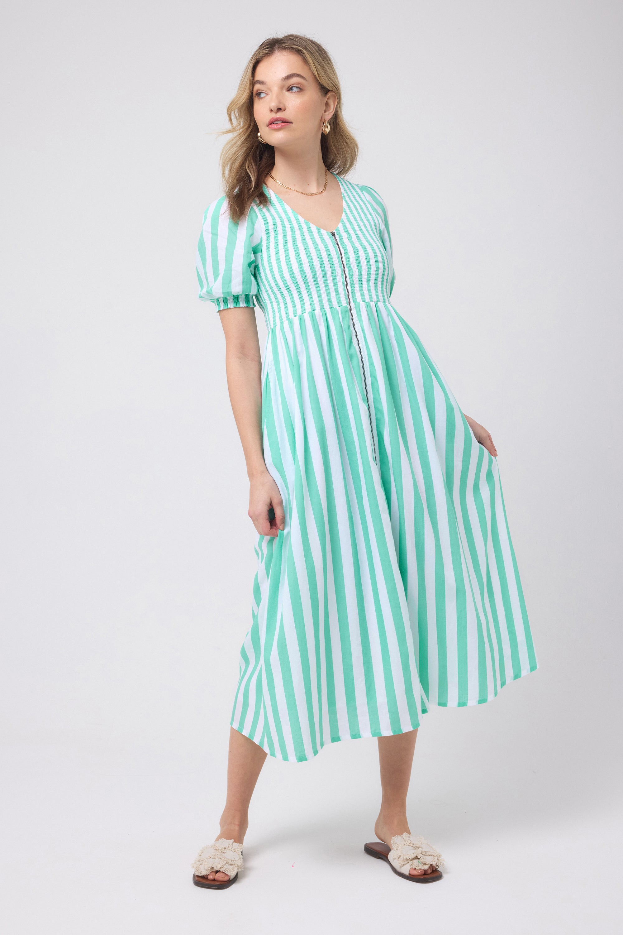 Green with White Stripe Shirred Zip Detail Midi Dress