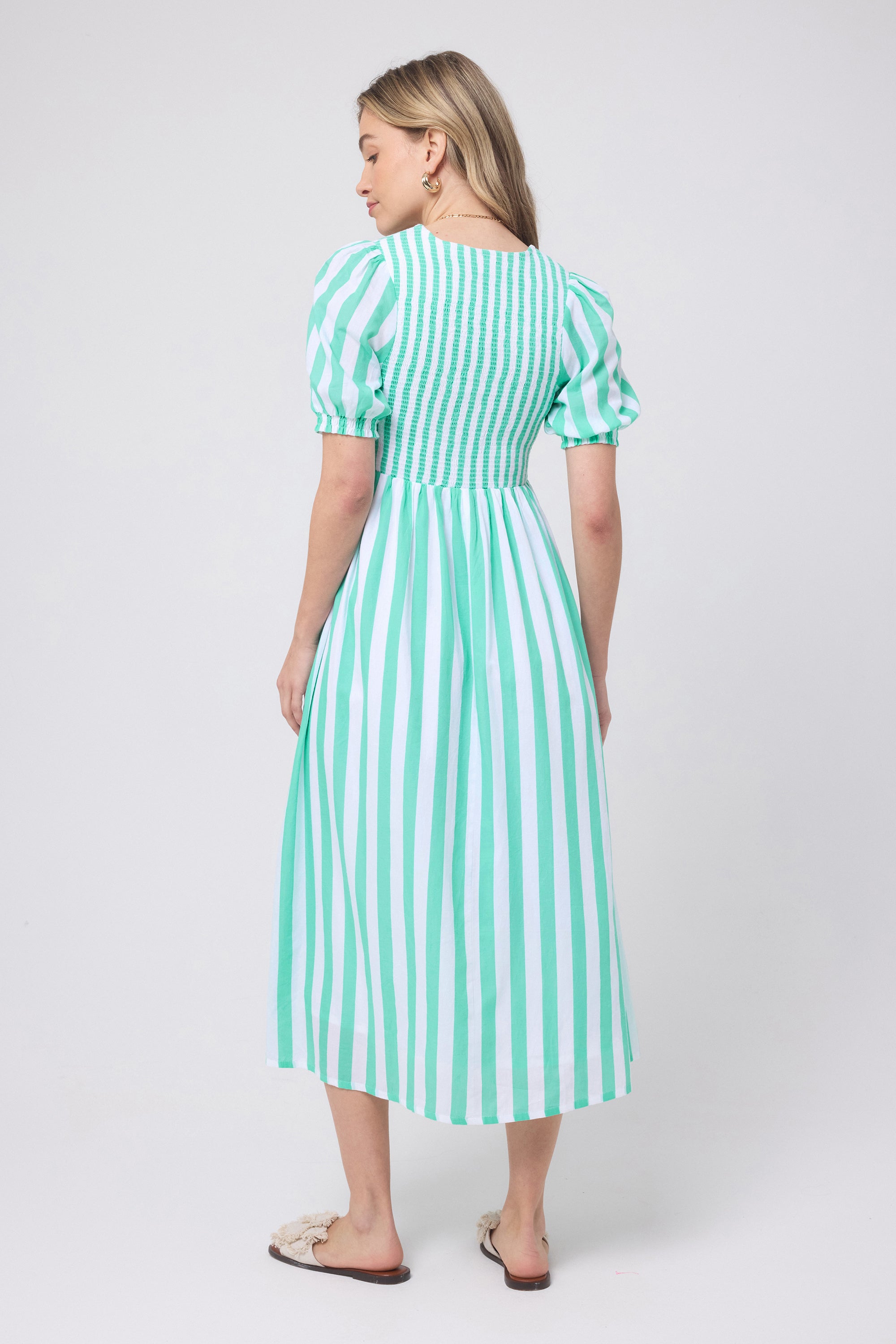 This green with white stripe midi dress is destined to be a favourite in your wardrobe. It's finished with pretty short blouson sleeves and a tiered skirt for an added touch of style.