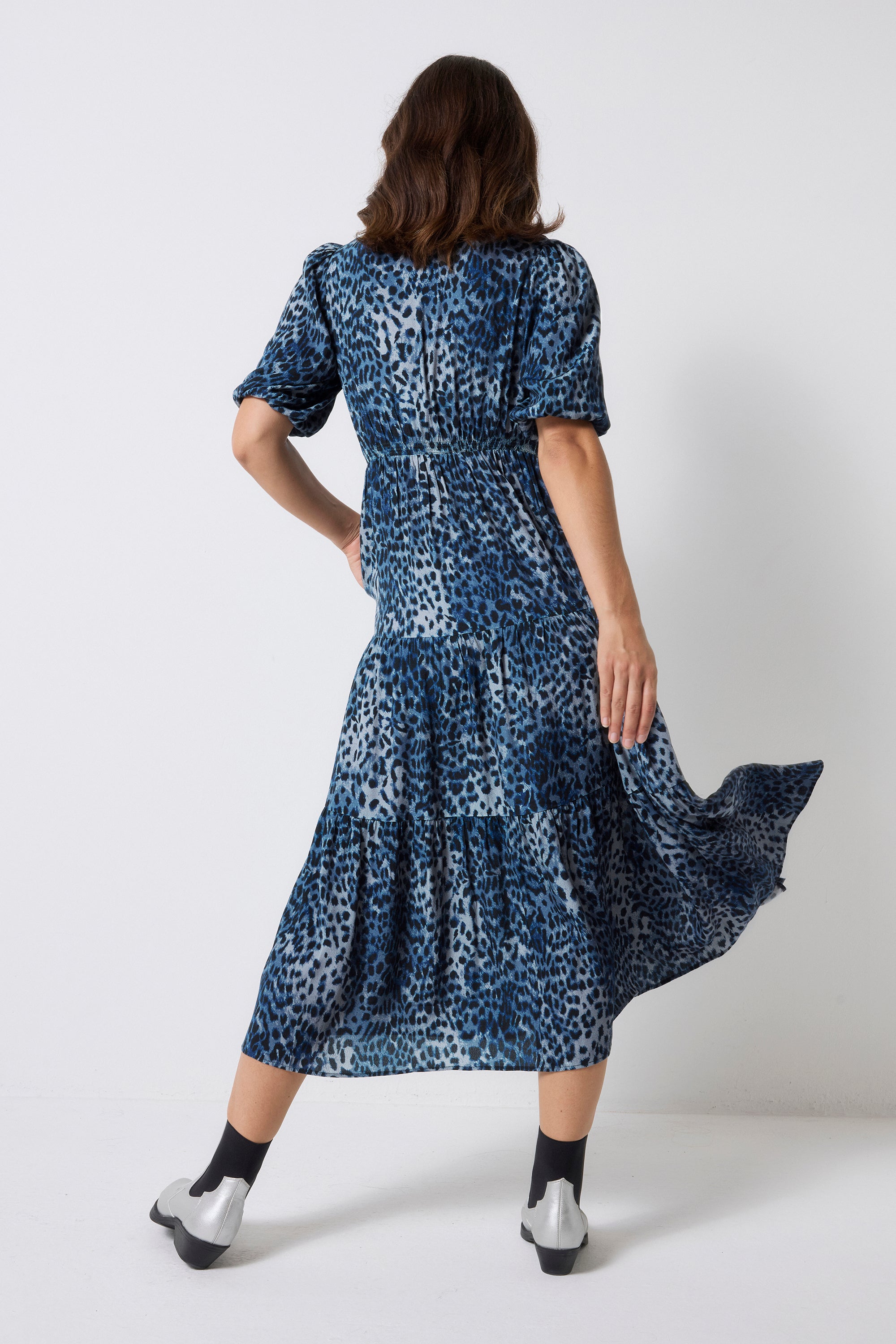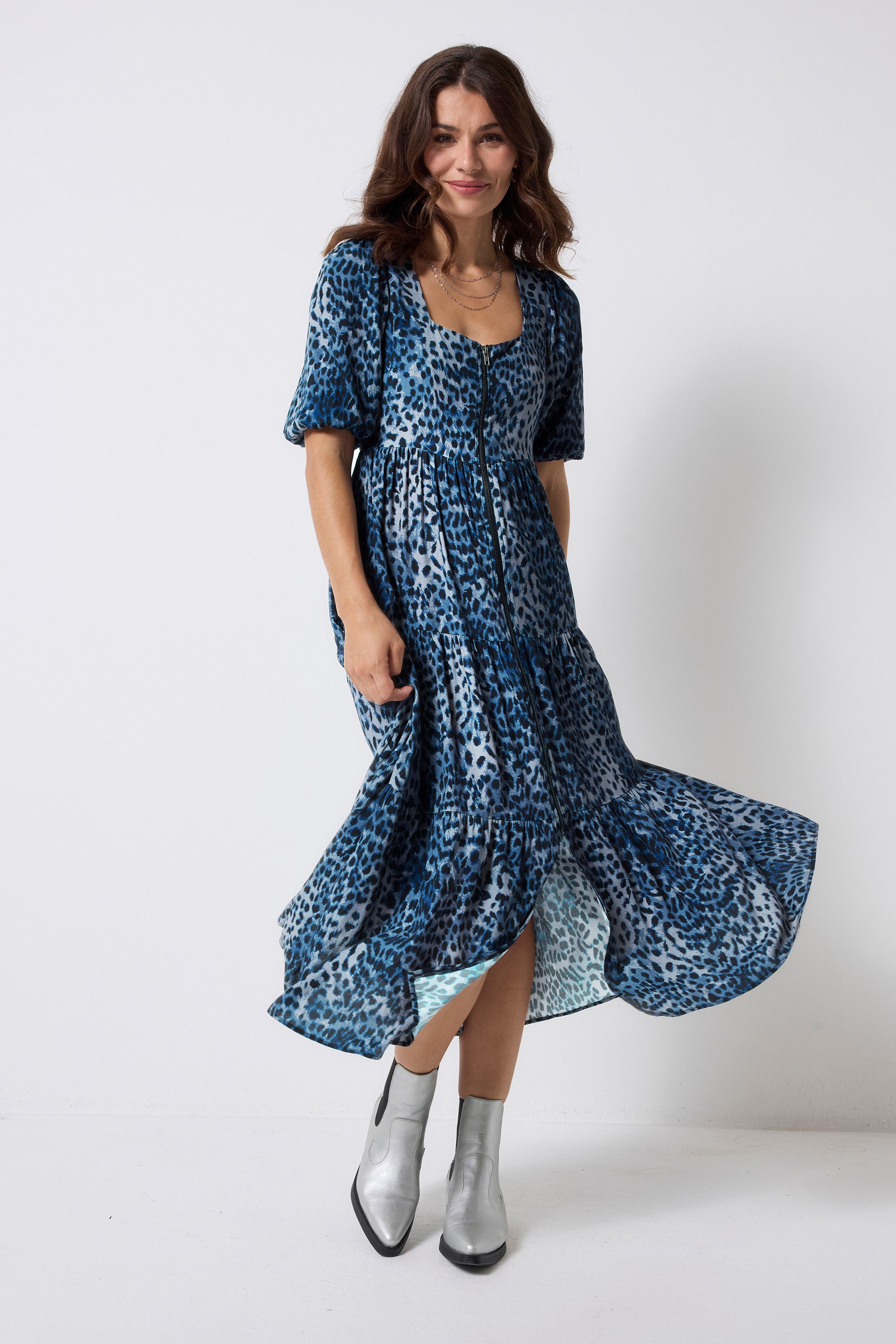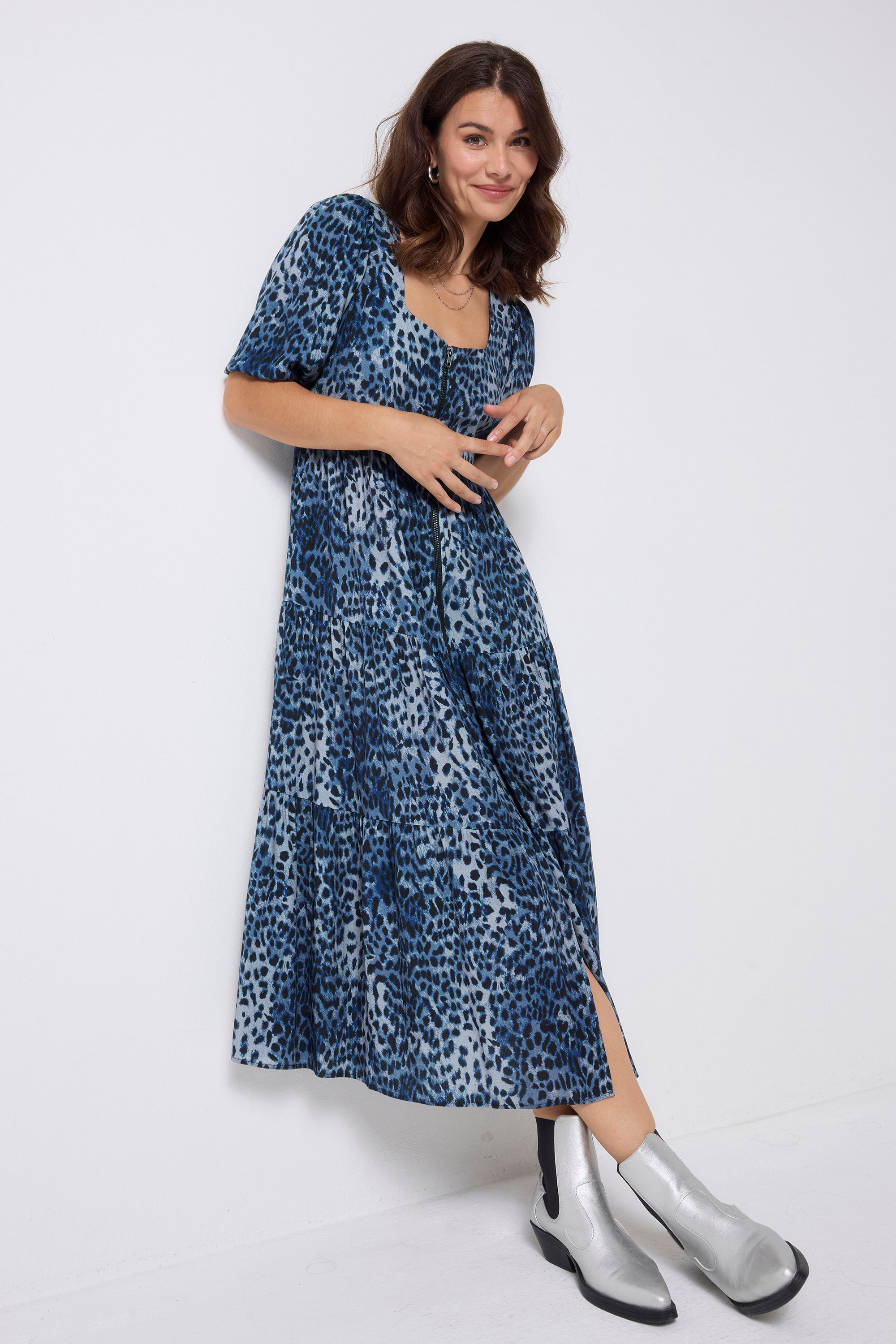 Navy Cheetah Square Neck Zip Detail Tiered Midi Dress