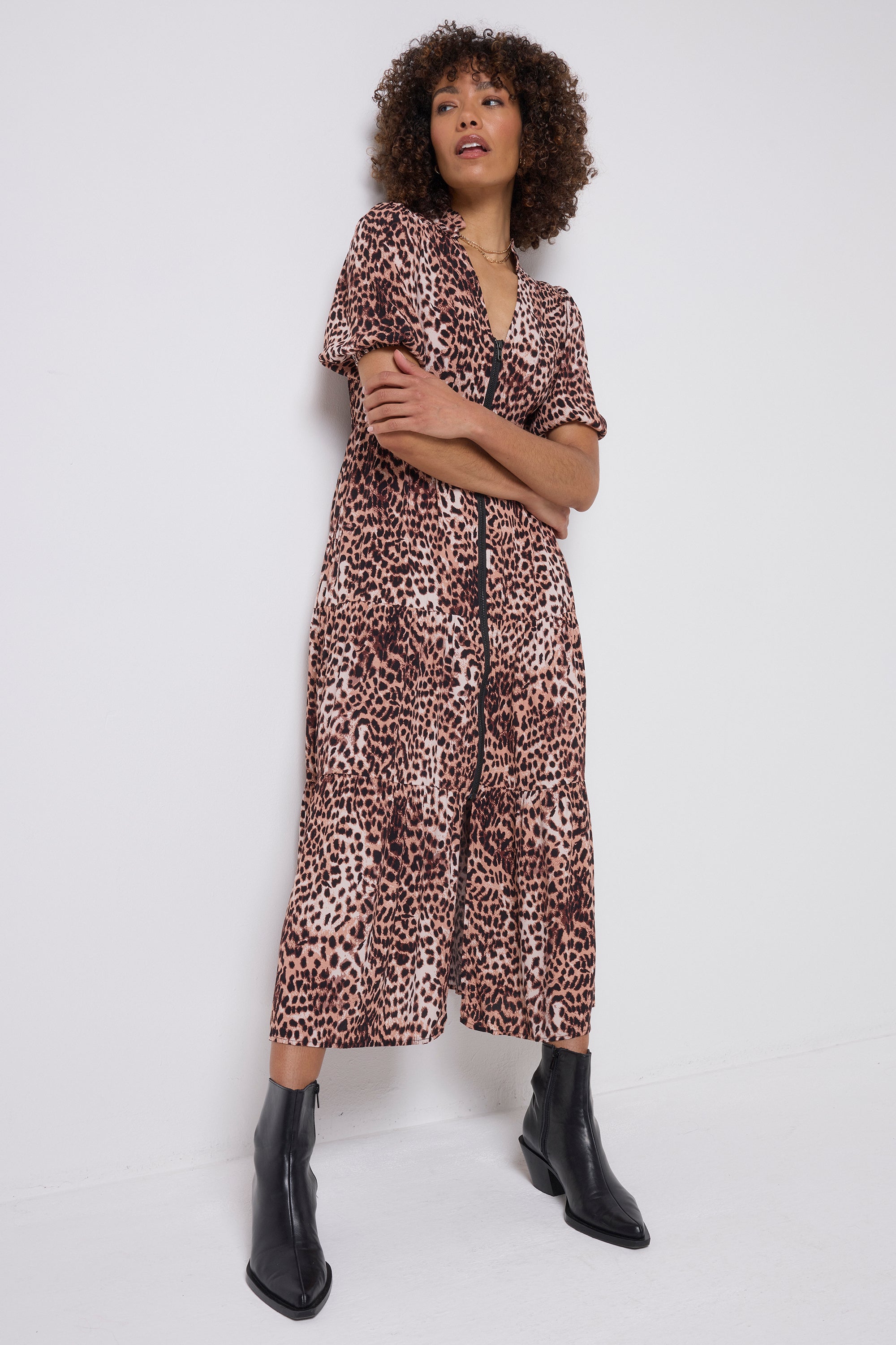 Neutral with Black Cheetah Zip Detail Tiered Midi Dress