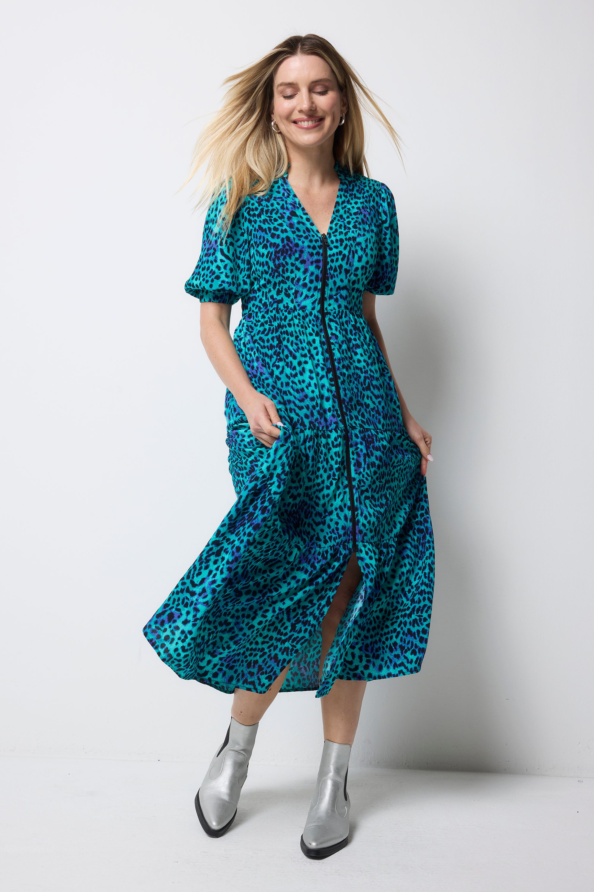 Crafted from soft viscose crepe this turquoise with blue cheetah zip detail tiered midi dress is all about off-duty charm. It's crafted with romantic short blouson sleeves, a smart v-neckline and a contrast zip fastening. For a flattering silhouette, the piece is elasticated around the waist while the midi length skirt fall in tiers in a flattering fit and flare style.