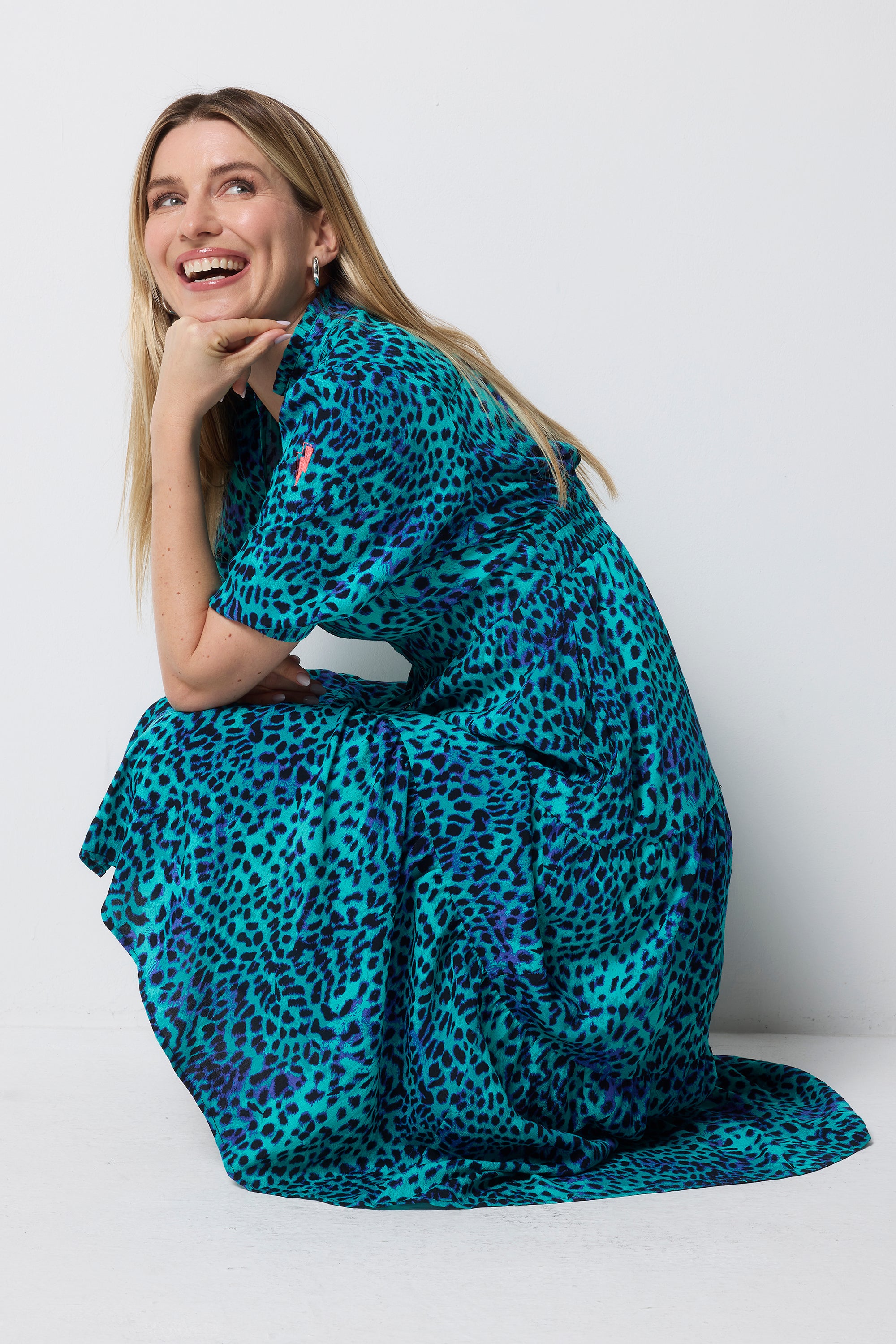 Turquoise with Blue Cheetah Zip Front Midi Tiered Dress