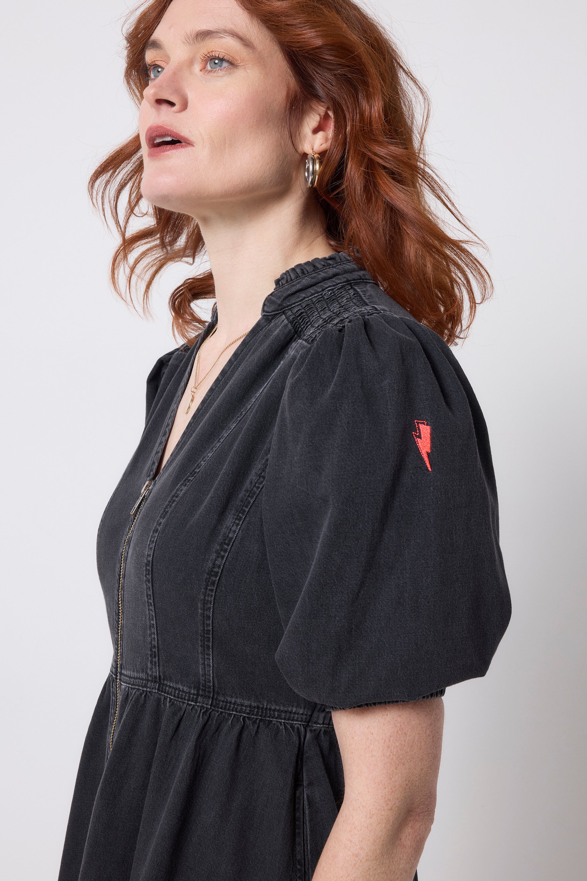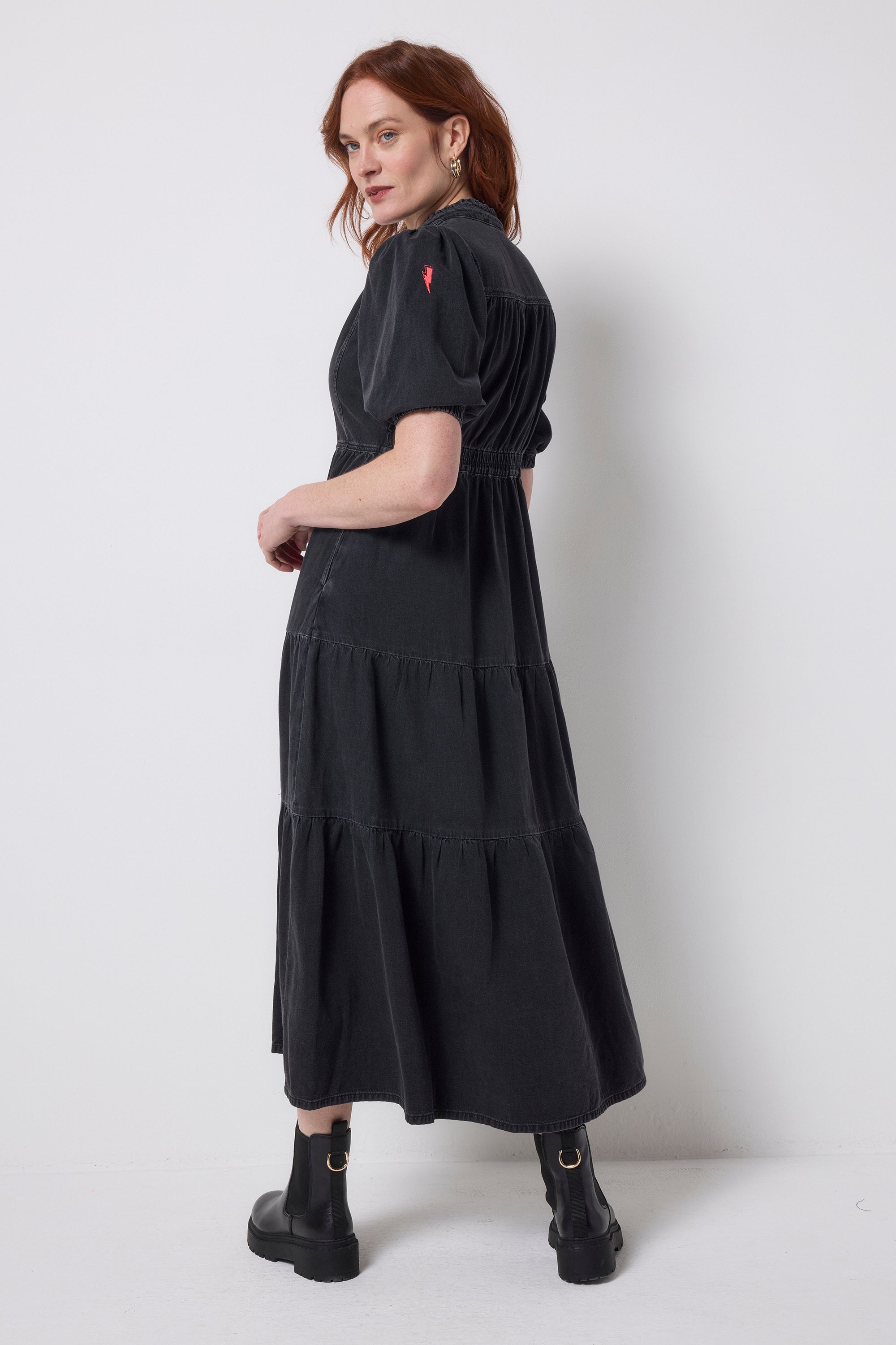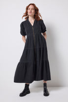 Crafted from responsibly sourced cotton this washed black zip detail tiered midi dress is all about off-duty charm. It's crafted in denim, complete with romantic short puff sleeve sleeves, a smart v-neckline and a contrast zip fastening. For a flattering silhouette, the piece is elasticated around the waist while the midi length skirt fall in tiers in a flattering fit and flare style.