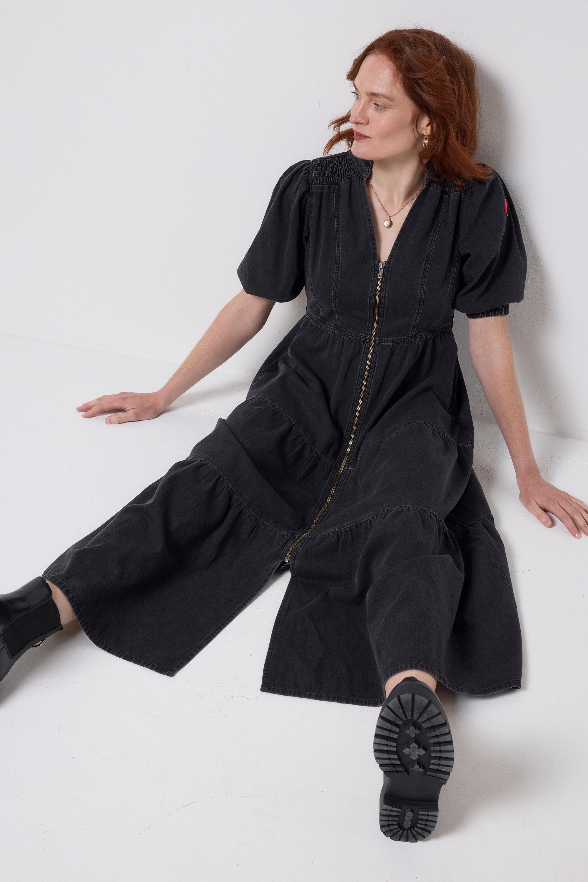 Washed Black Denim Zip Front Midi Tiered Dress