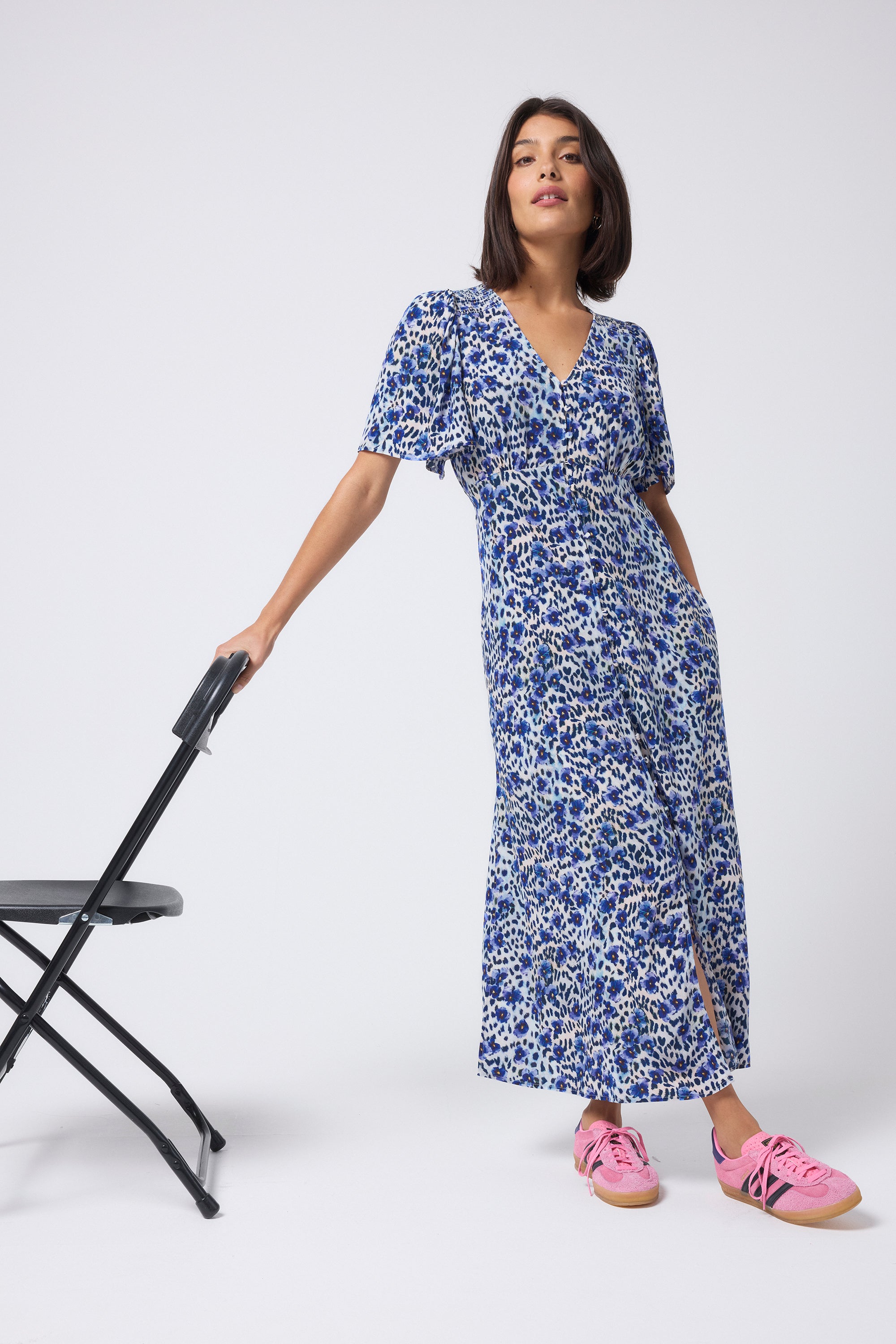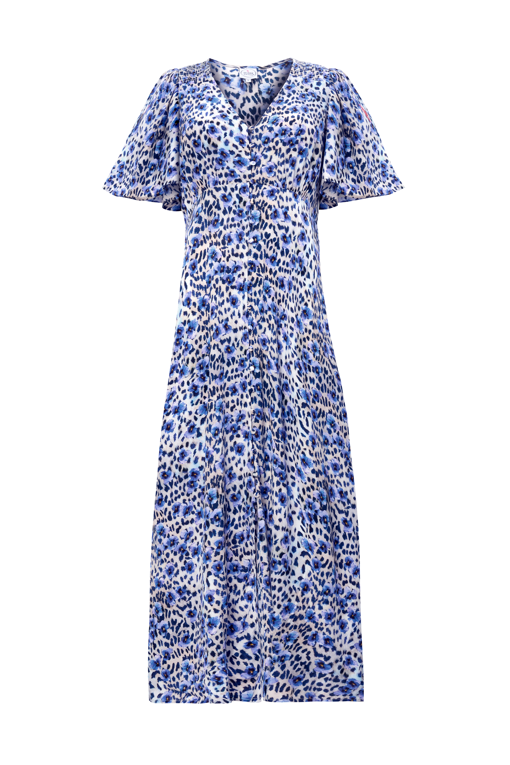 Bold and beautiful, this white with blue floral cheetah print and lightning bolt midi tea dress will make a joyful addition to your wardrobe. Made in a soft viscose crepe fabric, the midi length dress features a universally flattering v-neckline and short angel sleeves.
