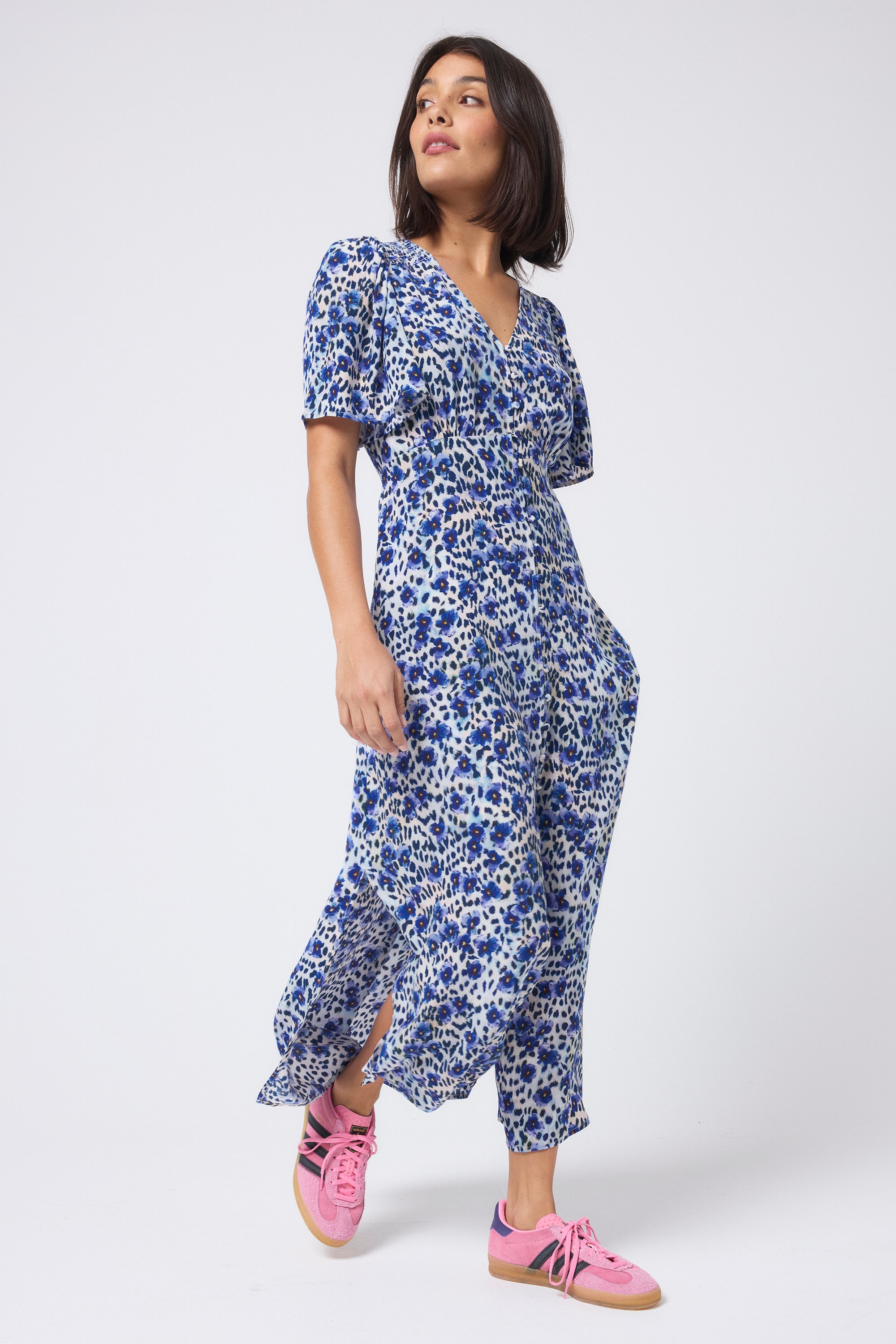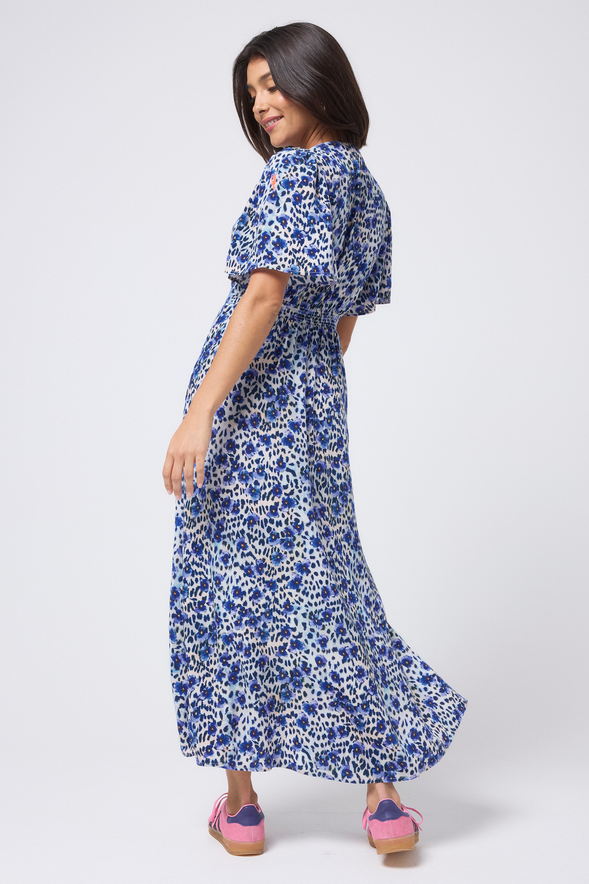White with Blue Floral Cheetah Print Angel Sleeve Midi Tea Dress