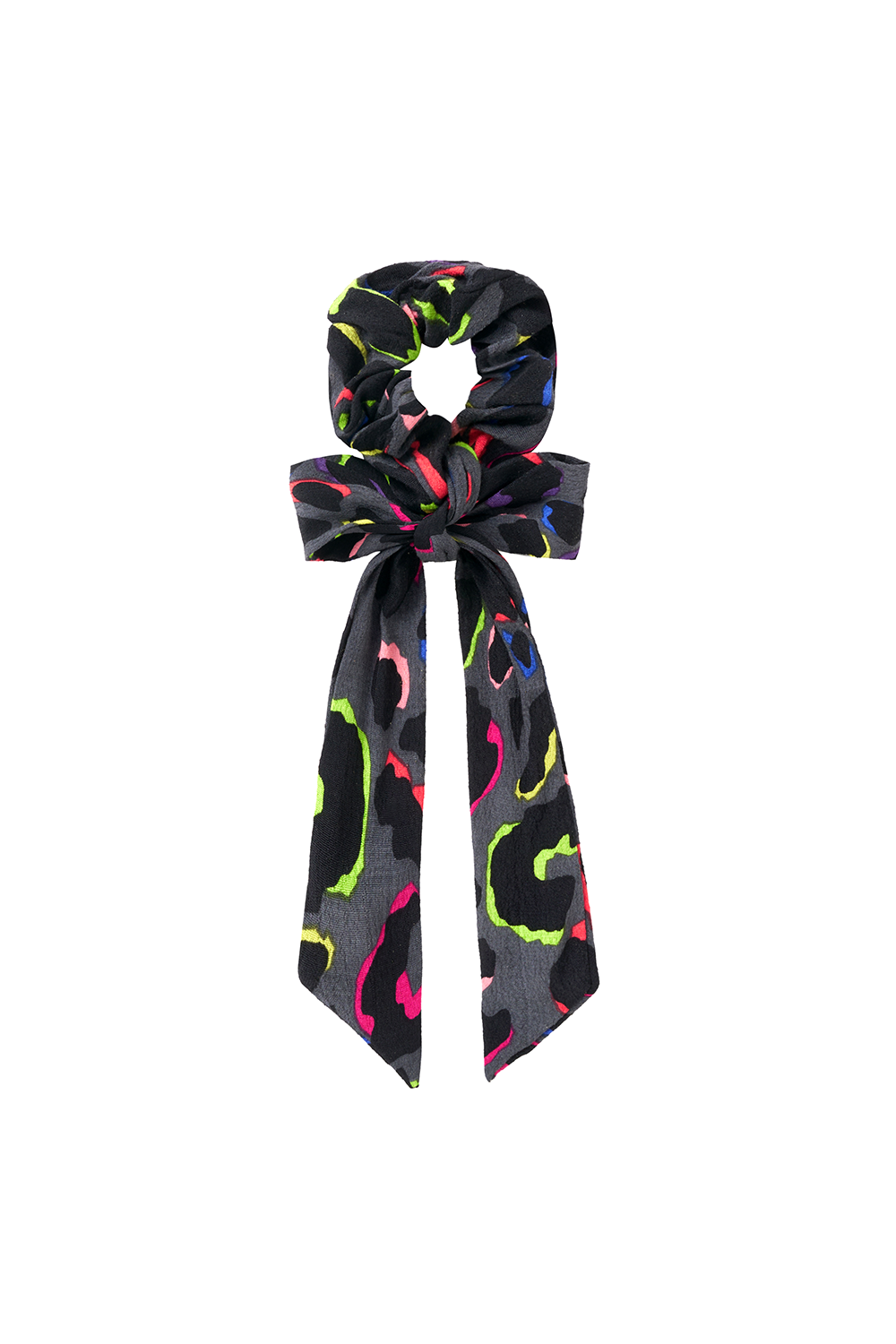 - Bow Scrunchie in Grey with Rainbow Shadow Leopard & Lightning Bolt Print