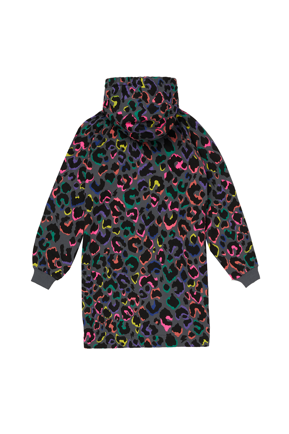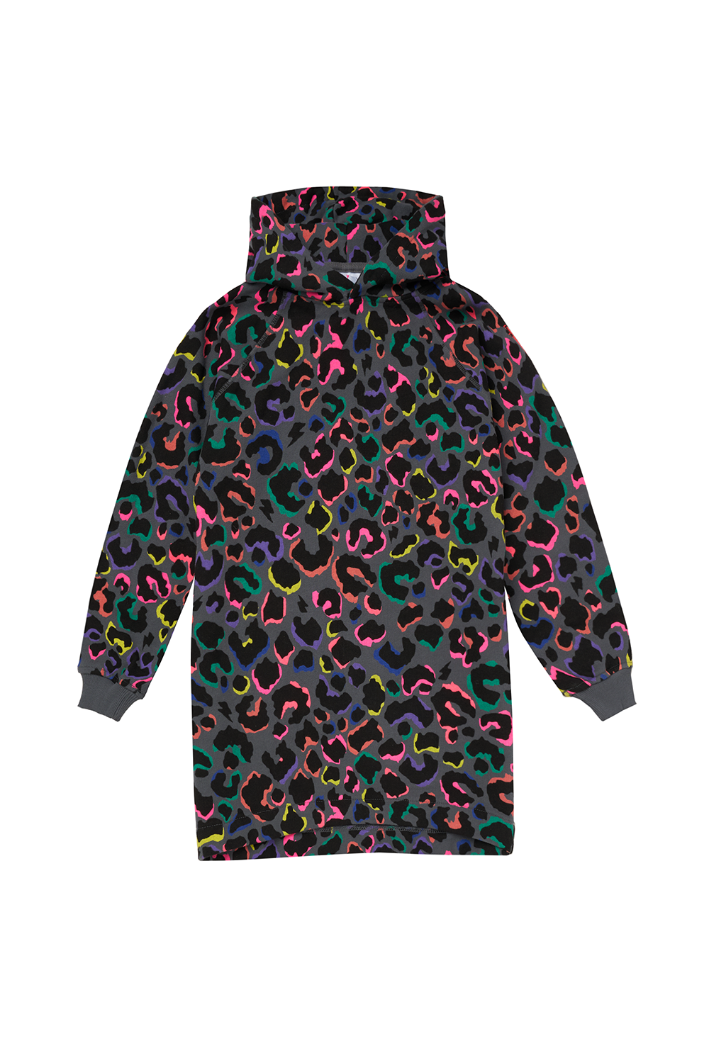 Our popular grey with rainbow shadow leopard and lightning bolt print is back in our kids longer line hoodie. Perfect for little ones to climb, twirl and race in, while keeping cosy and looking cool. The bright animal print is sure to add a dash of delight to their day.