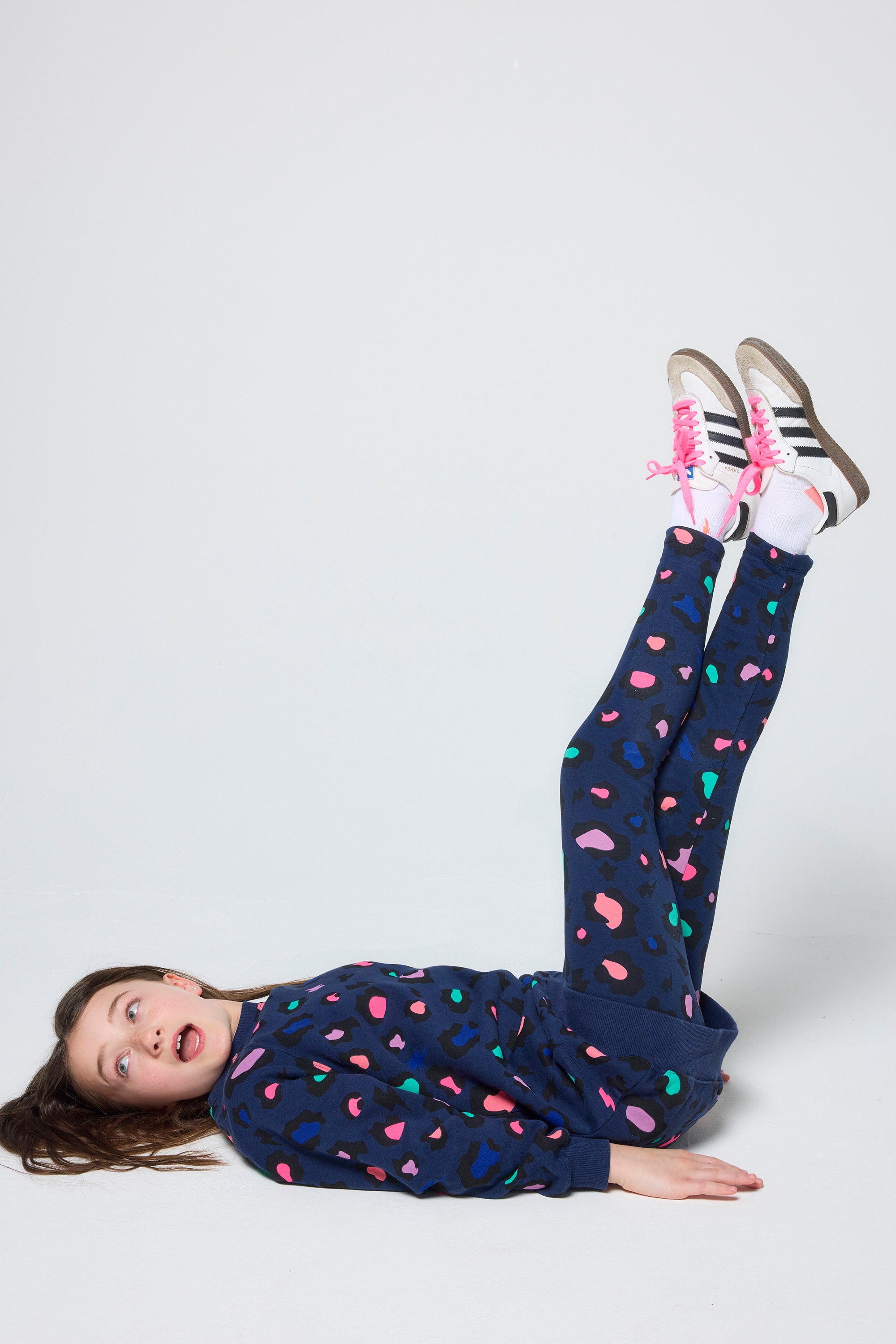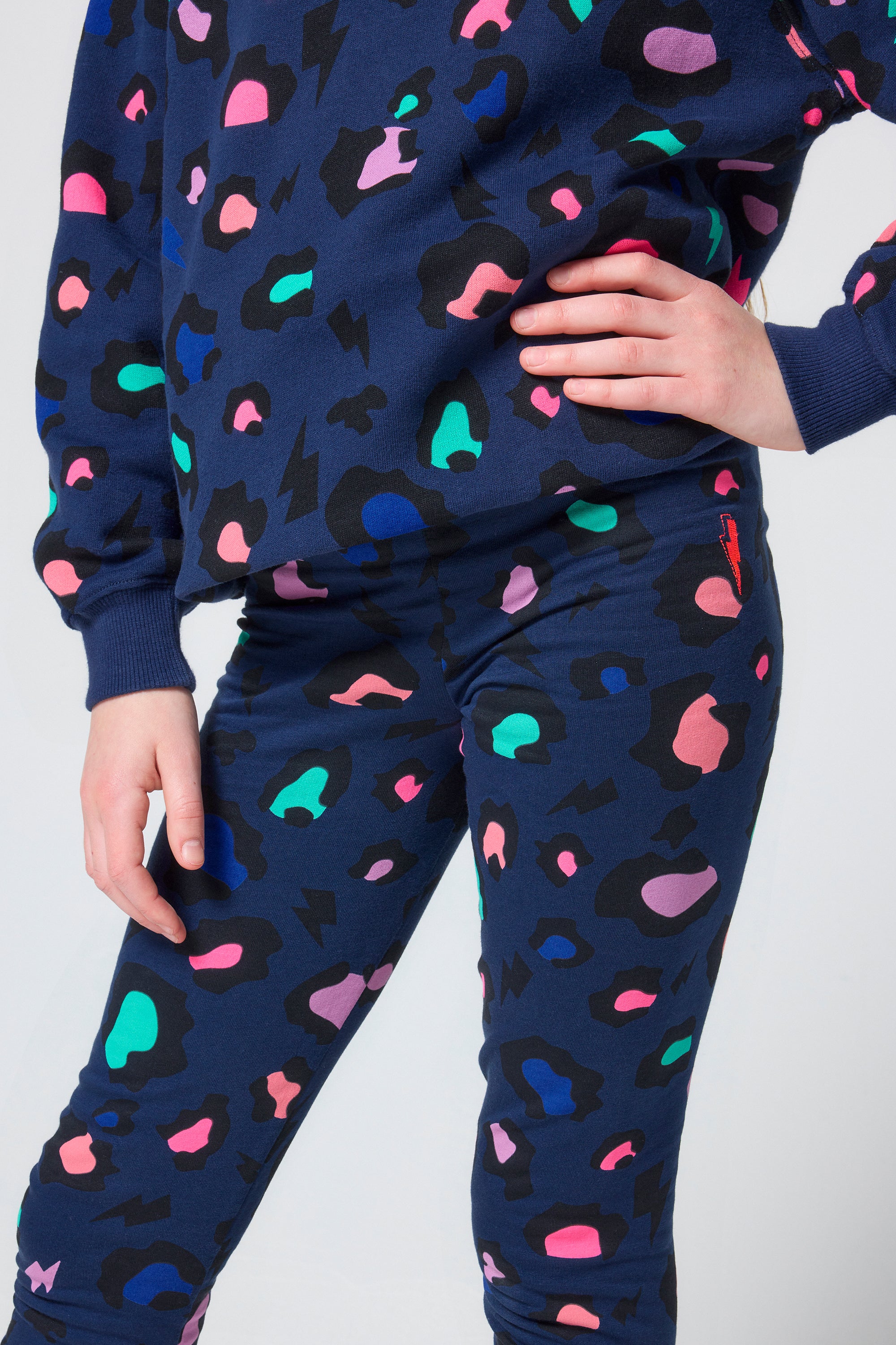 Our kids navy with rainbow snow leopard and lightning bolt print leggings were made to move with your little one for dynamic play dates, climbing, running and twirling. They also make a great layer on chillier days.
