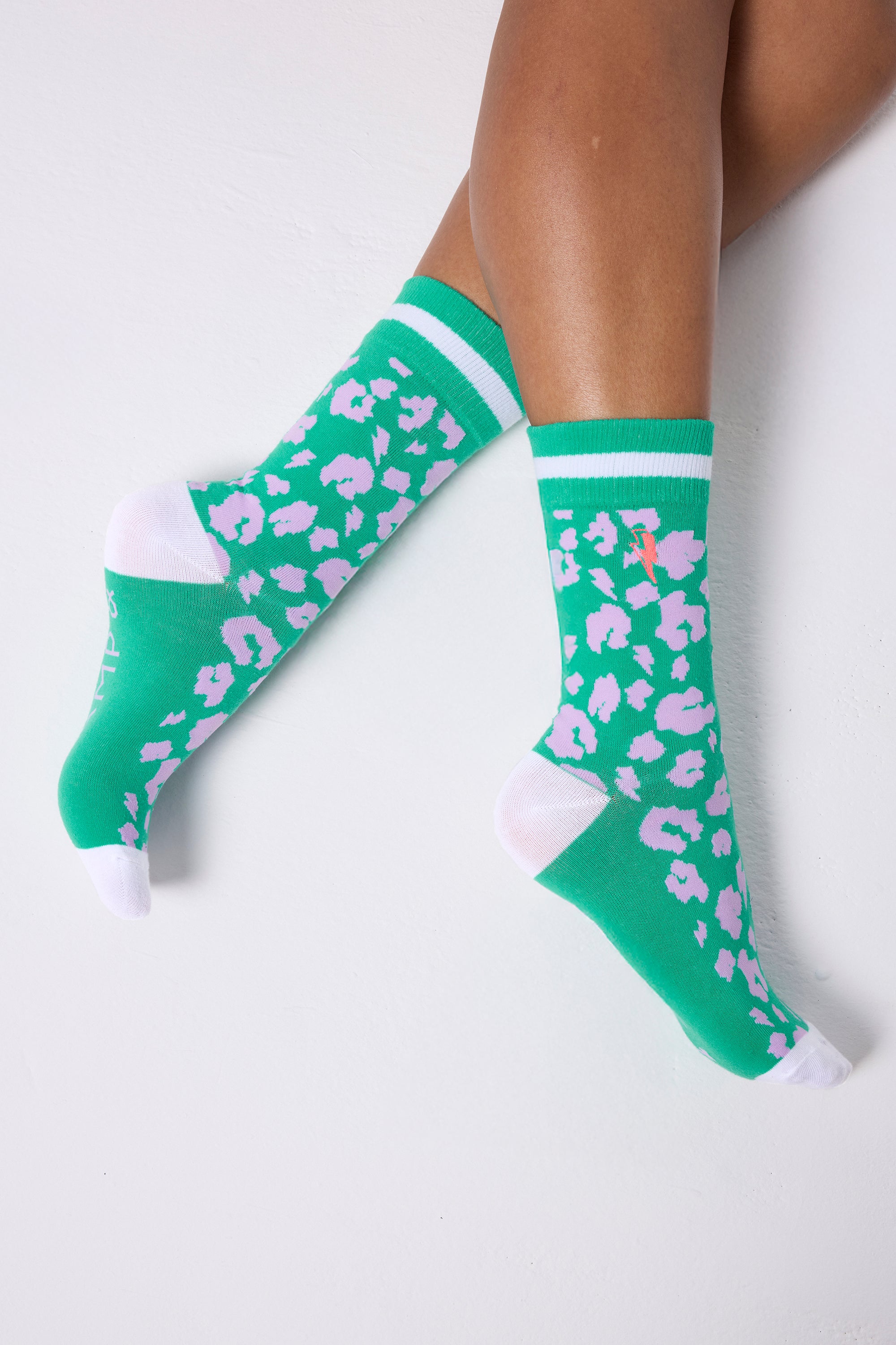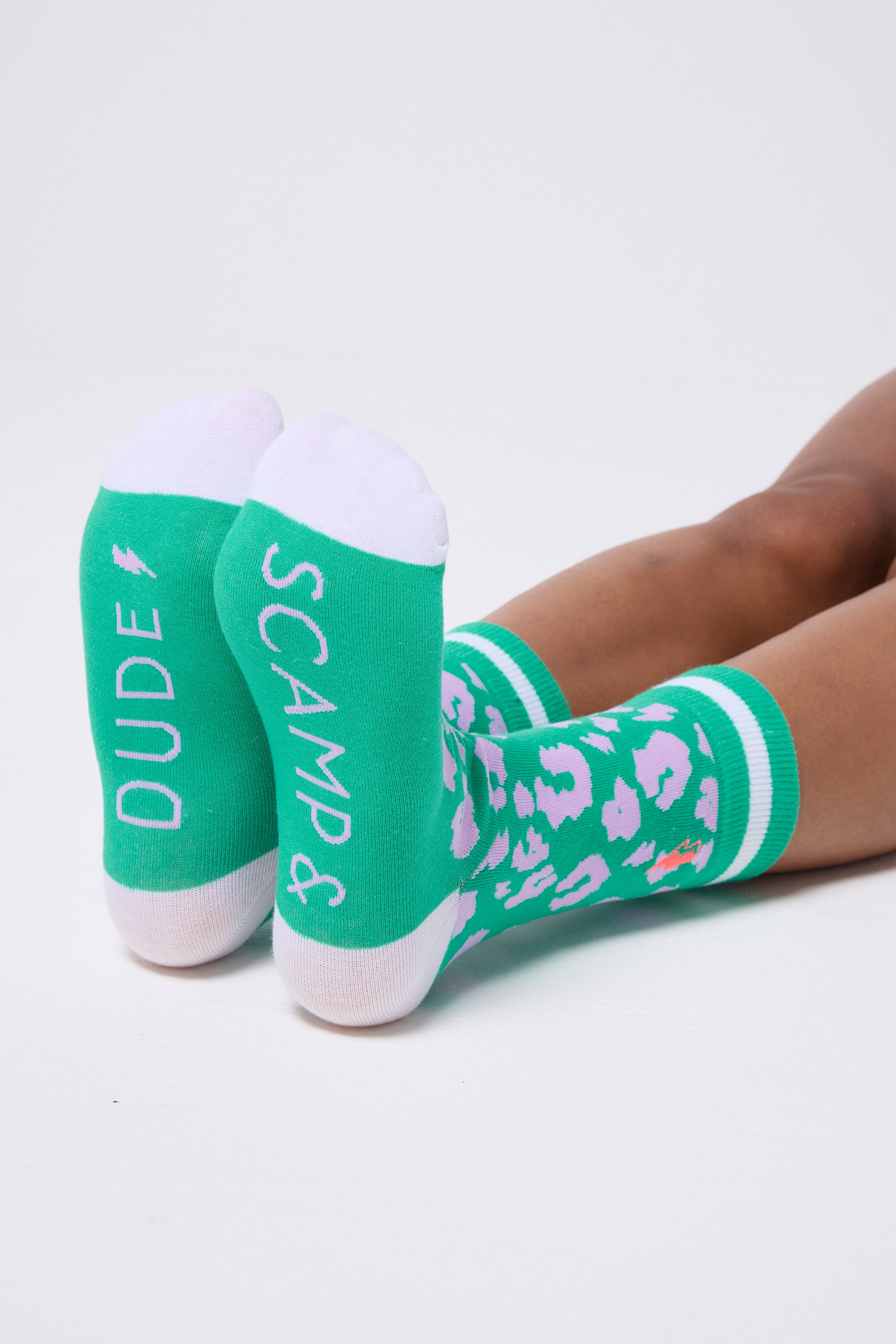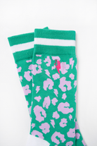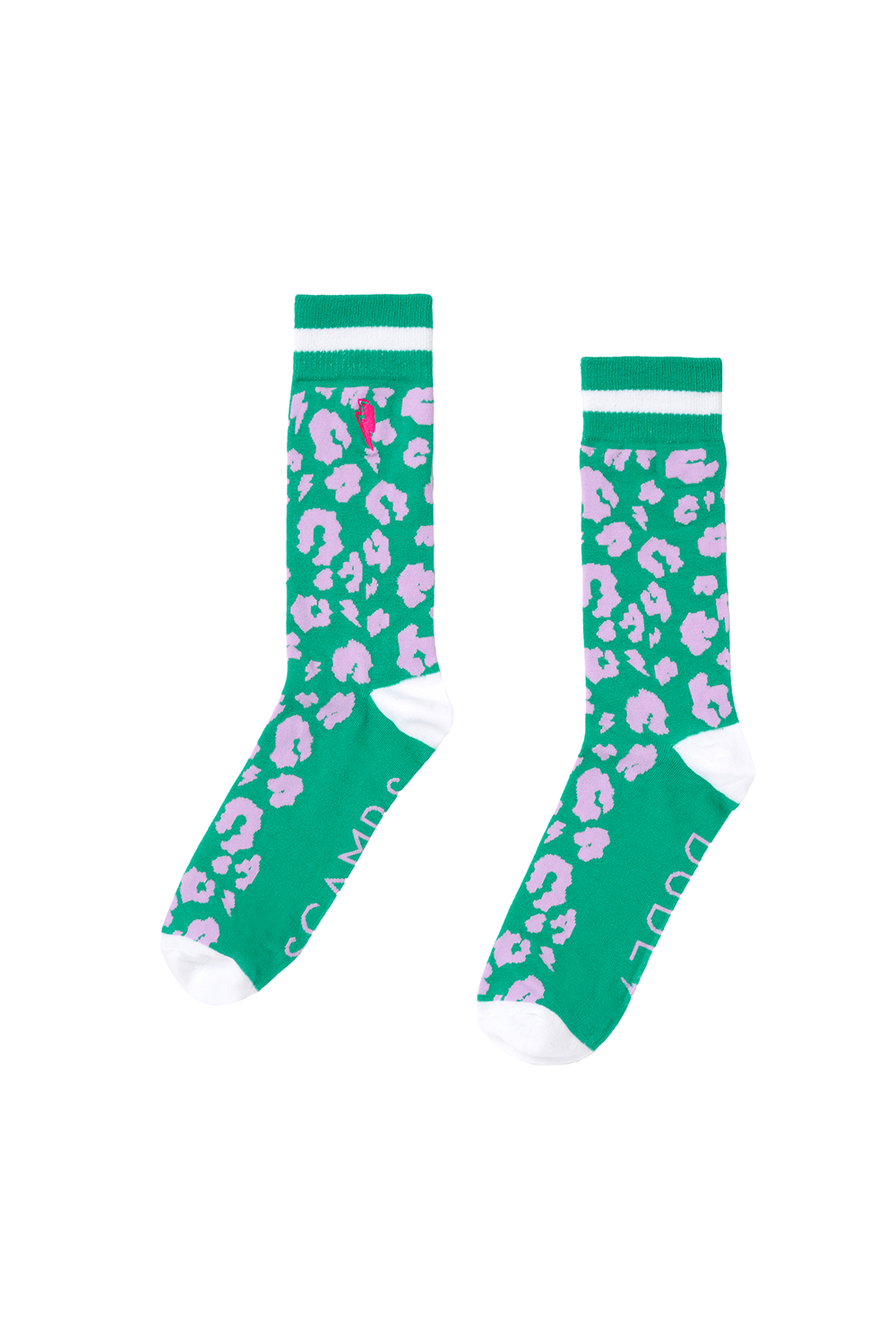 Put your best foot forward in our super soft and cosy socks. With a pink leopard print on a turquoise base, this pair features a contrasting white heel and toe and our signature Superpower Button.