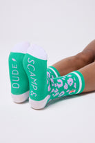 - Adults socks in Turquoise with pink leopard and lightning bolt pattern