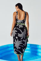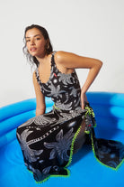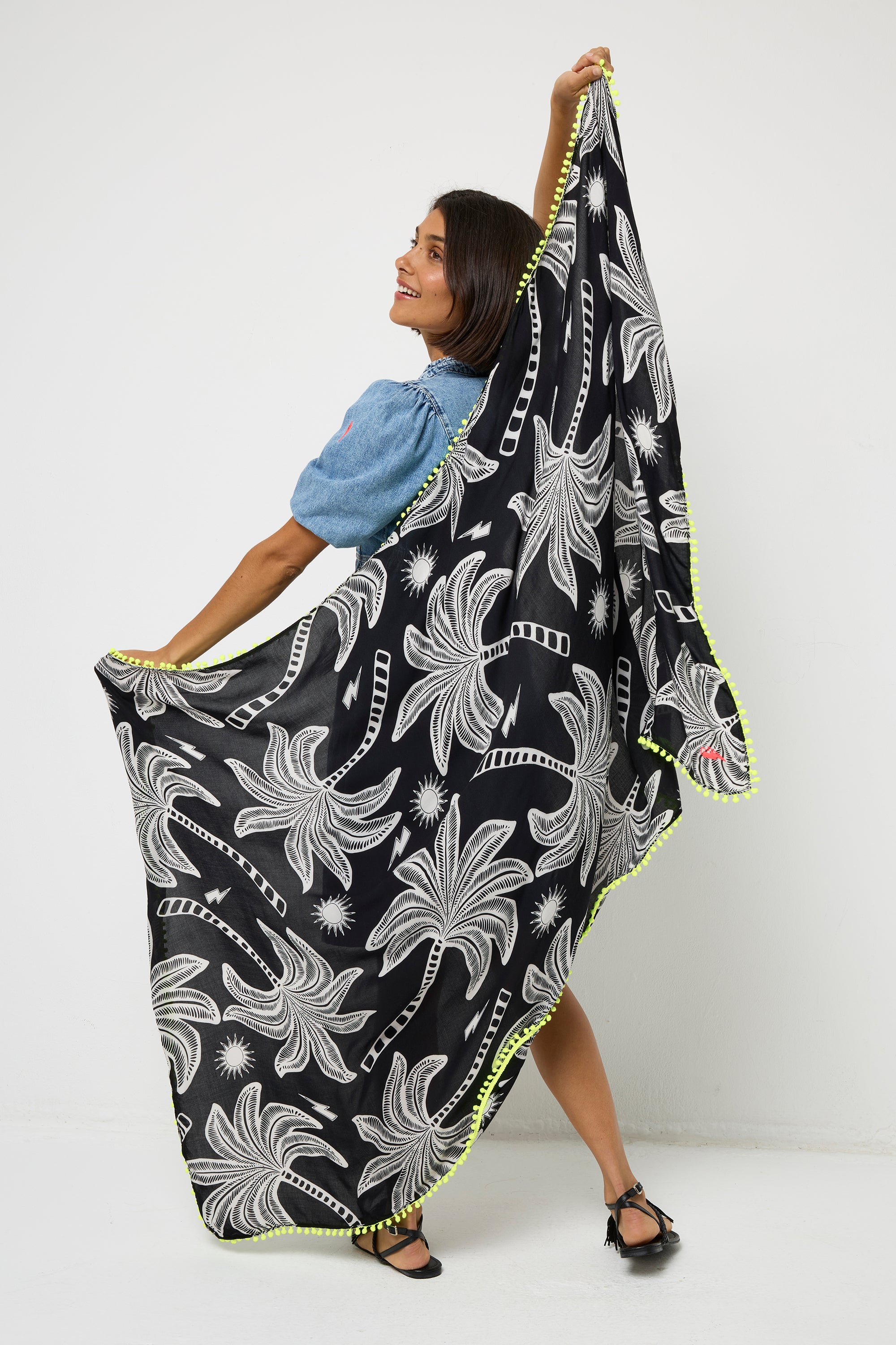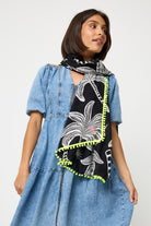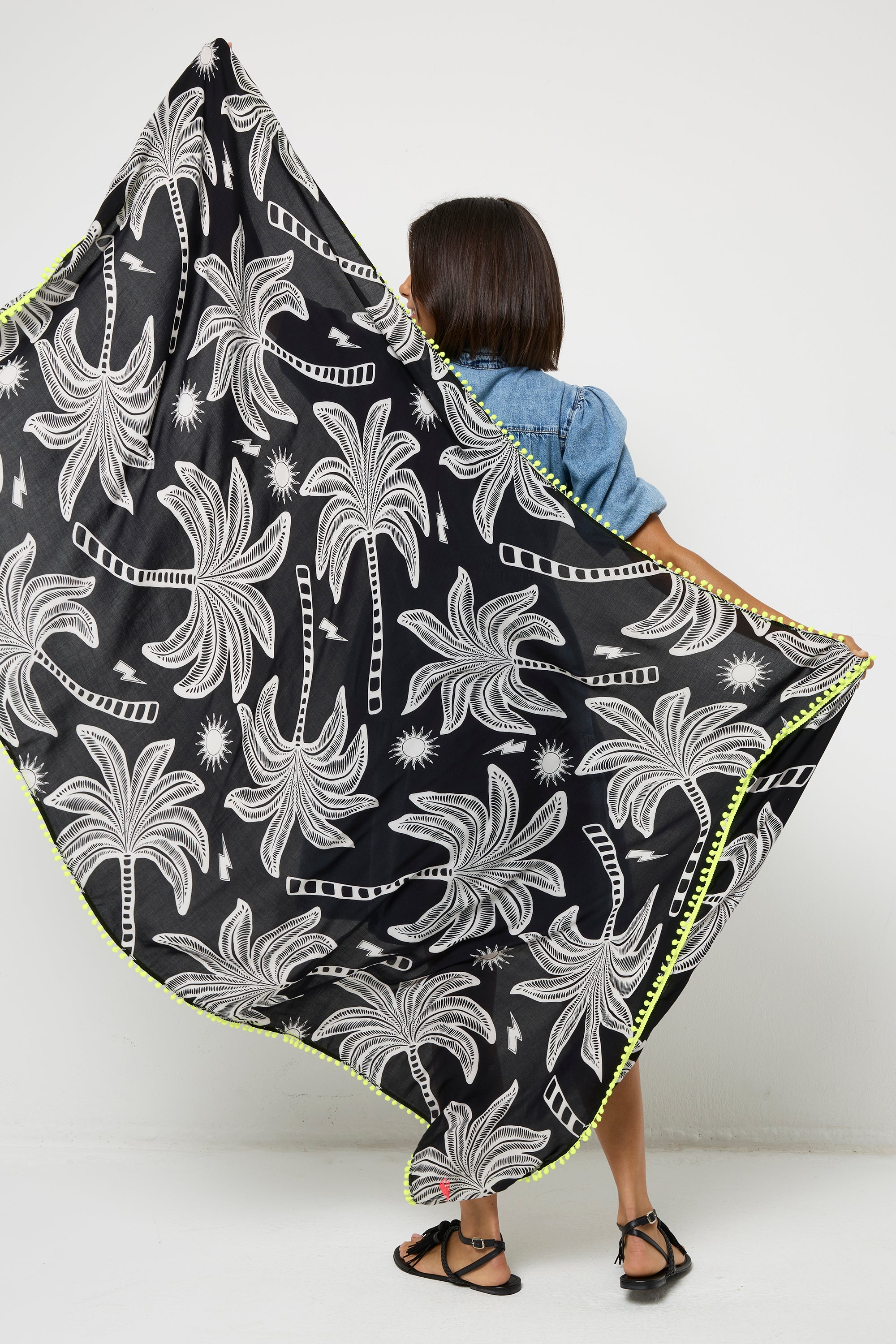 A super-soft, superpower-infused scarf in our black palm spring and lightning bolt print. Featuring a neon yellow pom pom trim and neon pink embroidered lightning bolt.