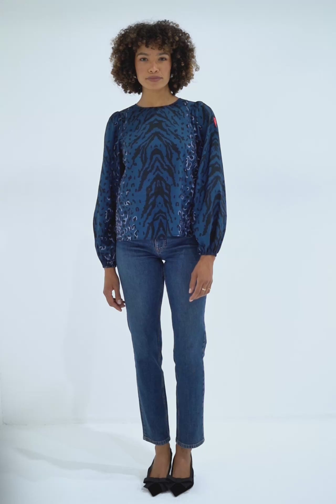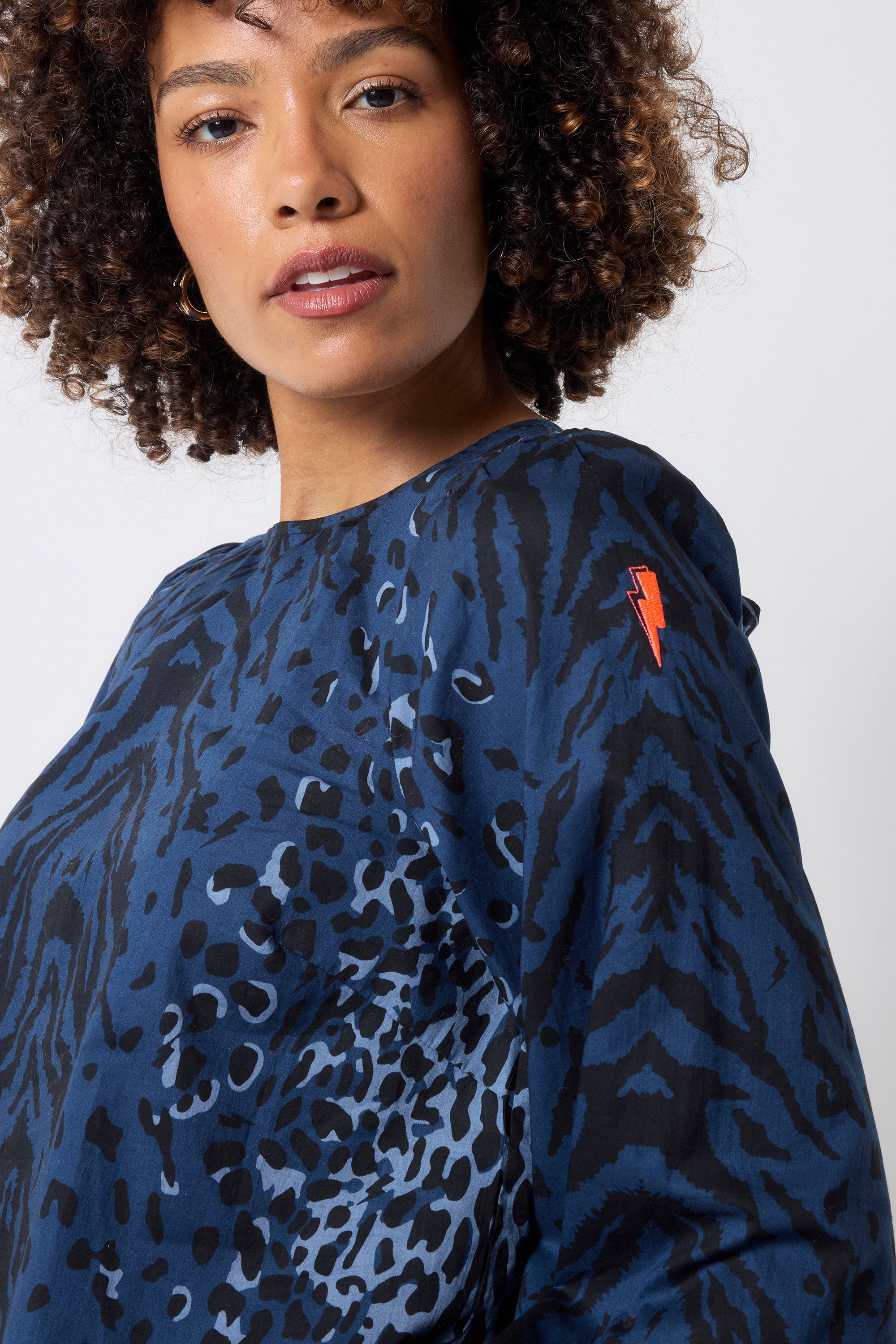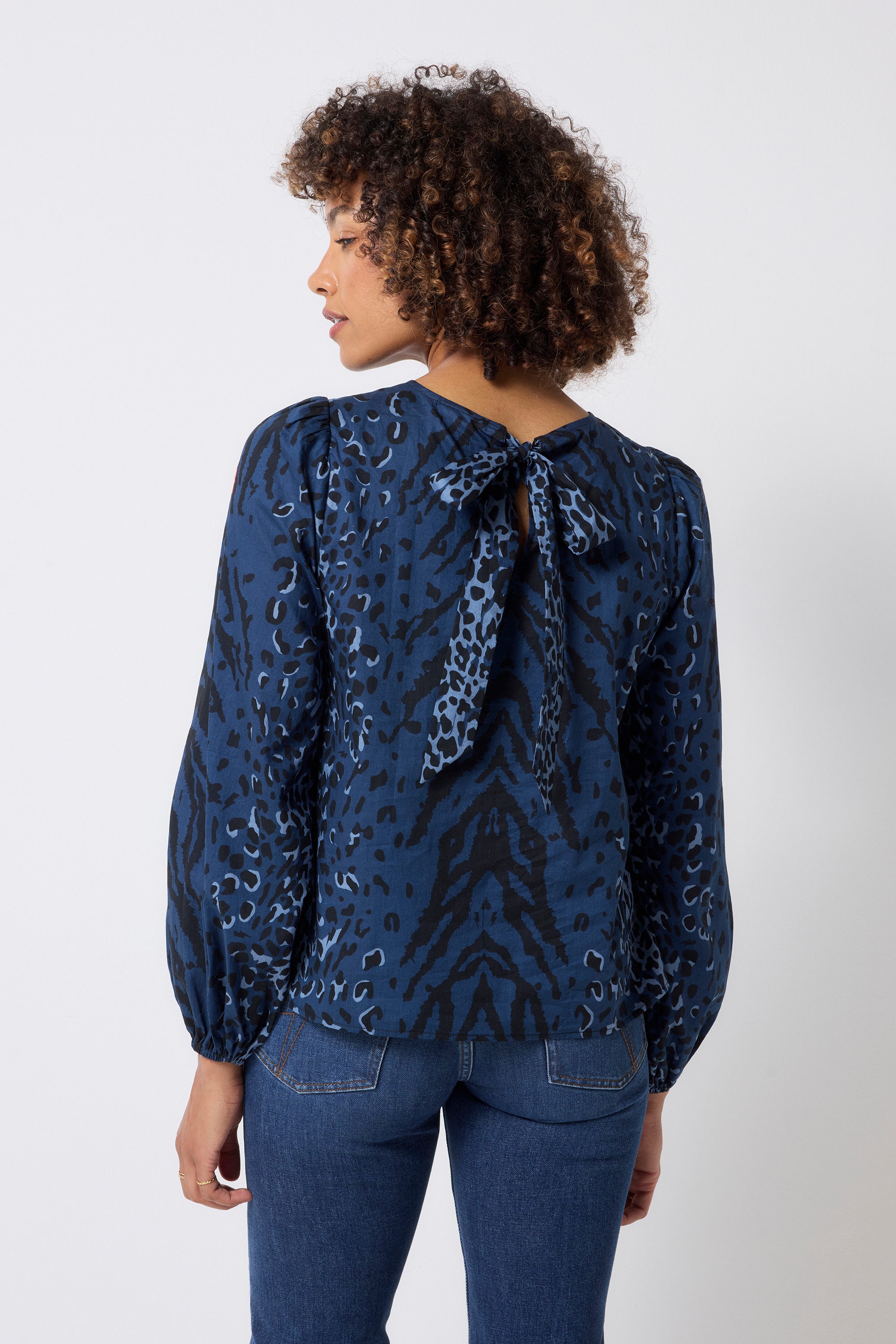 Our navy blouse is made from super-soft cotton and has wild zebra engineered placement print. It comes with a statement tie at the back. It's the ultimate in day to night versatility, wear it to easily nail the 'jeans and a nice top' look.