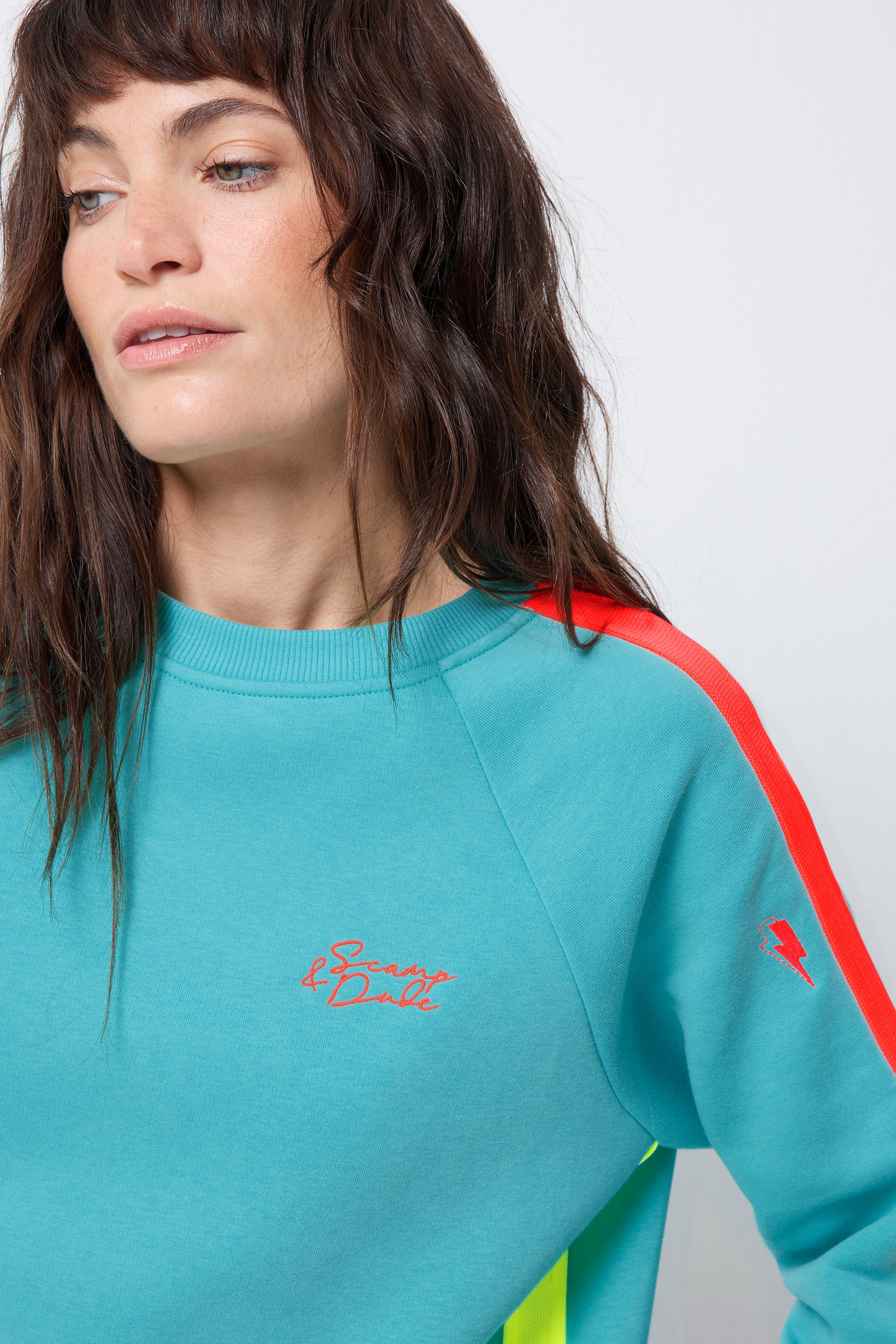 Amp up your casual collection with our bright green with coral colourblock relaxed sweatshirt. It's oversized fit makes it easy to layer, while the raglan sleeve adds to the relaxed feel.