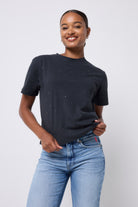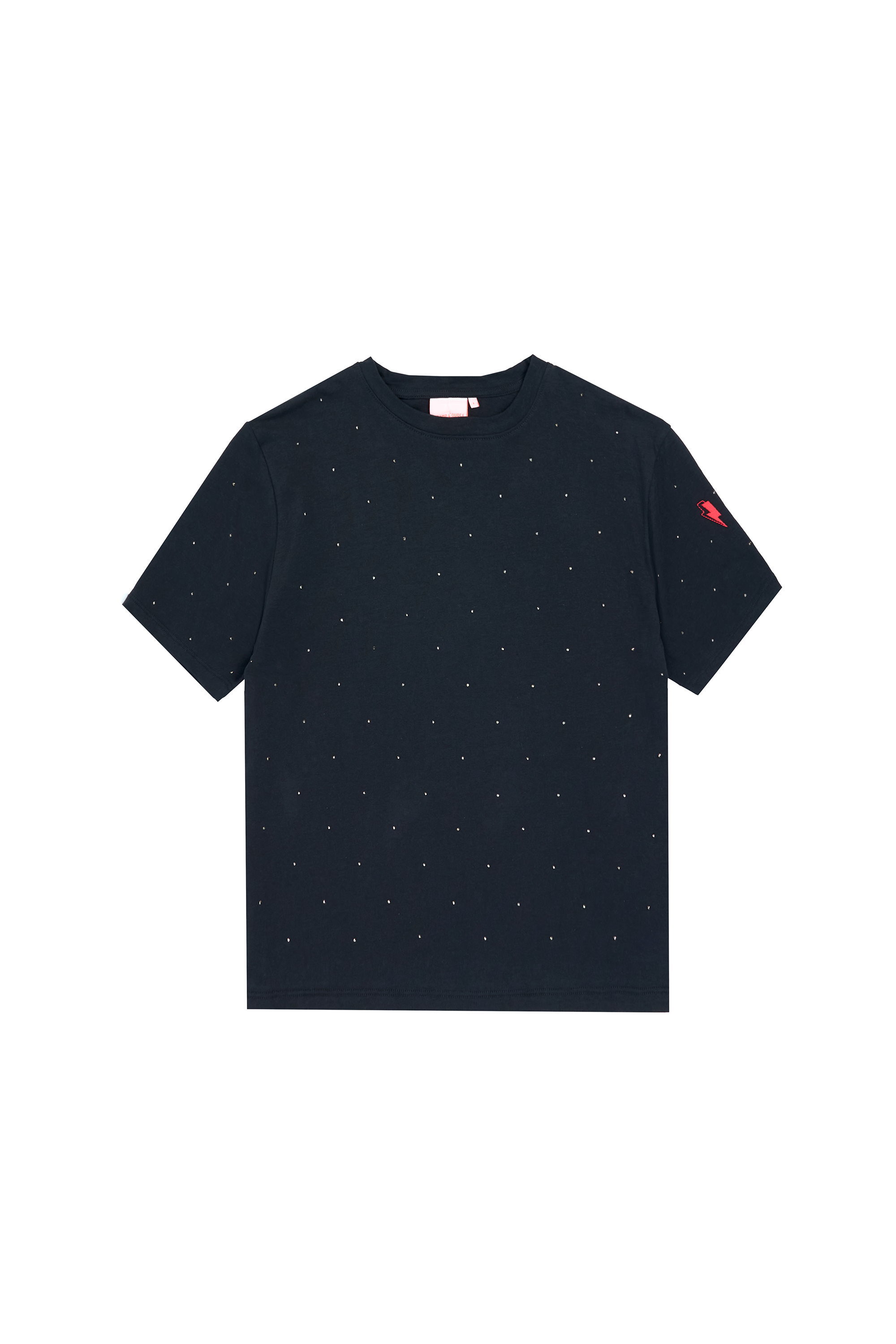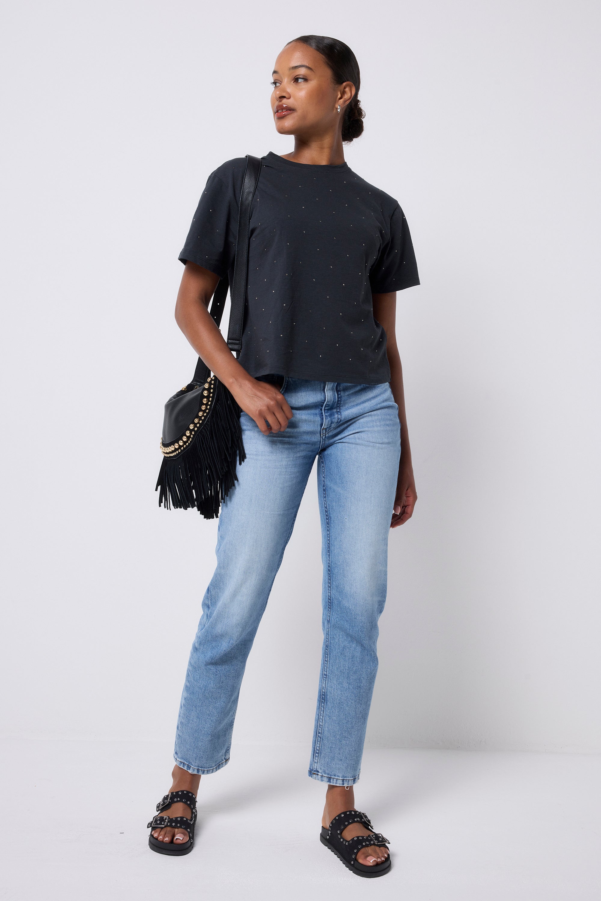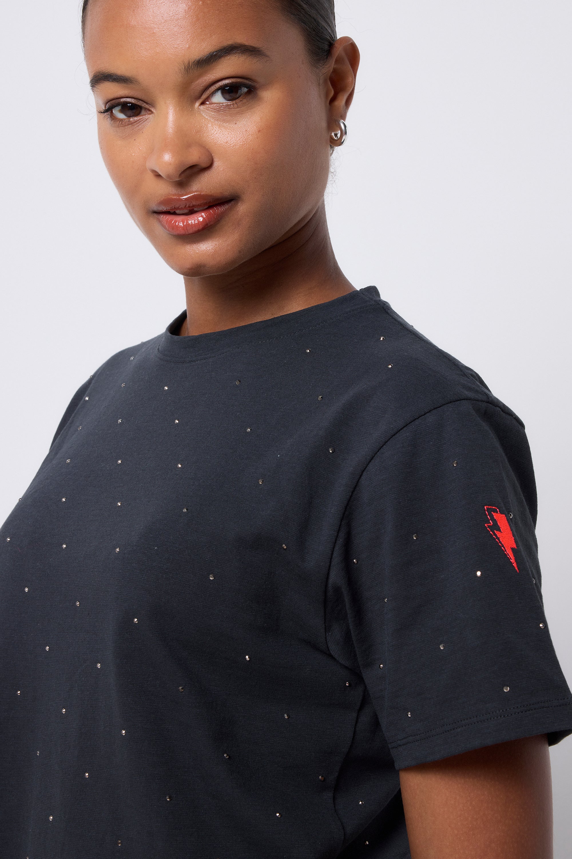 Our dark grey T-shirt with studs will become your off-duty staple. It's stylish, comfy and filled with superpowers. Complete the look with a pair of flattering Scamp & Dude jeans.