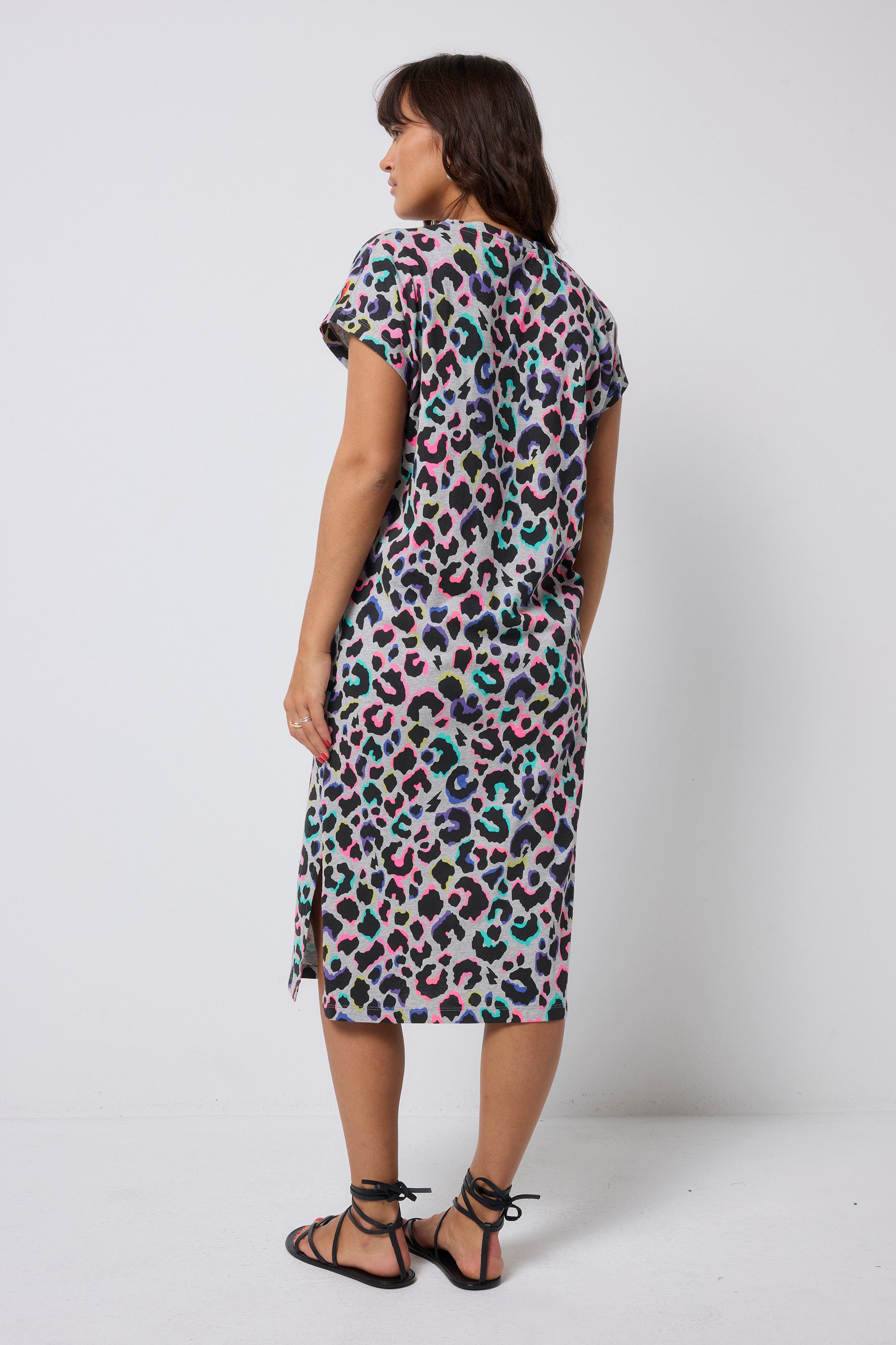 Our grey with rainbow shadow leopard midi oversized T-shirt dress was created with comfort and style in mind. Cut from super-soft organic cotton which is incredibly comfortable to wear and will keep you cool in warmer weather, it also features side splits which allow for extra movement and comfort. Wear with sandals or trainers and your favourite pair of sunglasses.