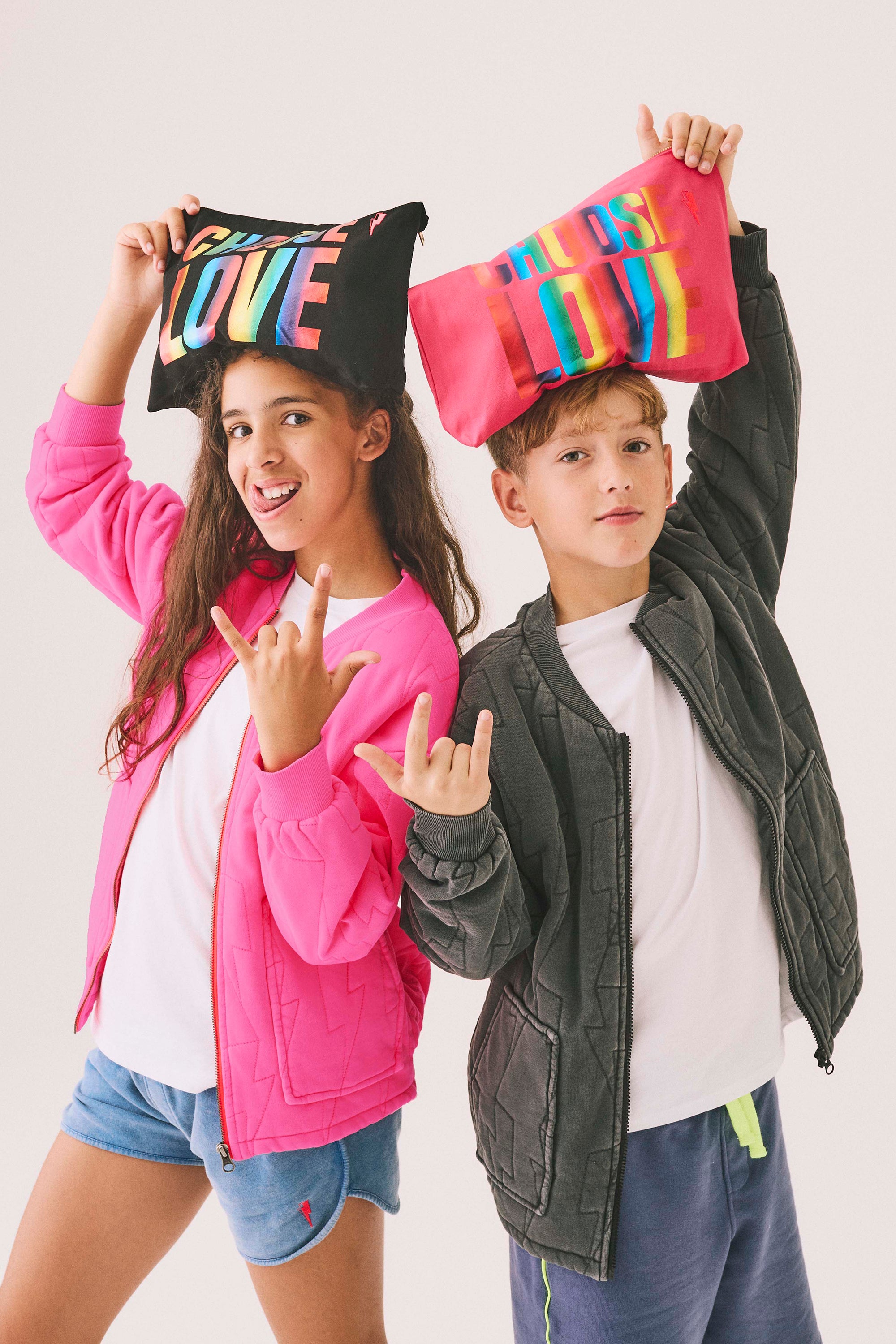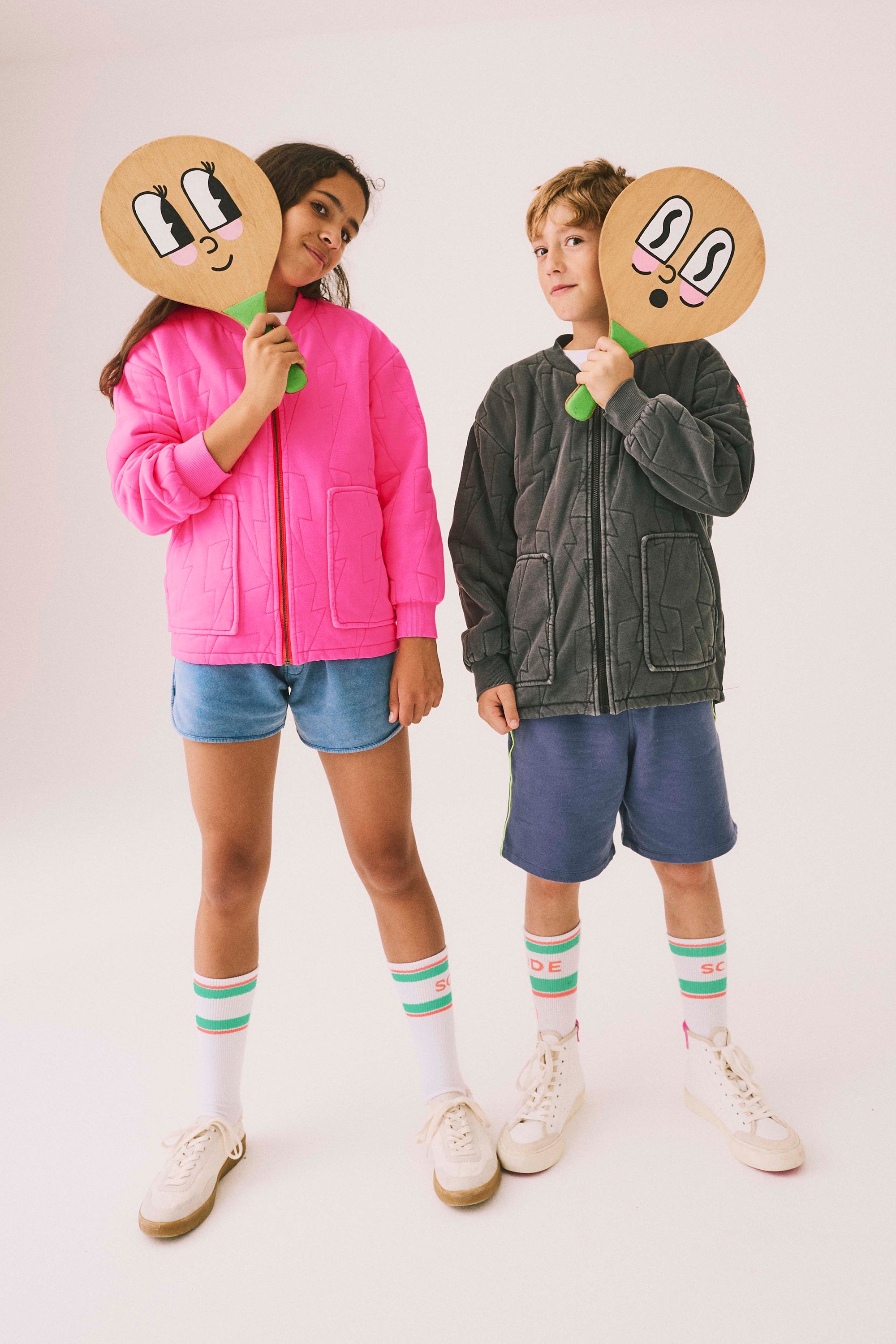 Our kids washed black organic cotton quilted lightning bolt bomber jacket can be easily thrown on when the weather's being unpredictable. It has a comfy oversized fit and a zipper fastening.