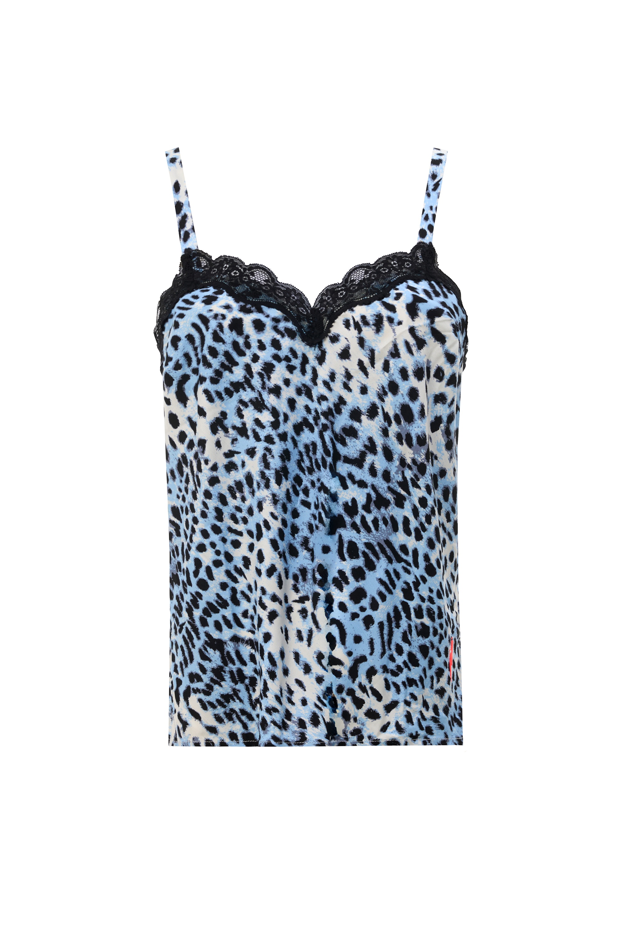 White with Blue and Grey Cheetah Lace Trim Cami Top