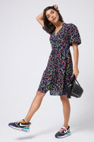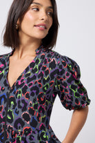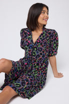Crafted from soft viscose crepe this grey with rainbow shadow leopard zip detail tiered short dress is all about off-duty charm. It's crafted with romantic short blouson sleeves, a smart v-neckline and a contrast zip fastening. For a flattering silhouette, the short length skirt fall in tiers in a flattering fit and flare style.