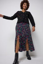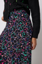 Spruce up your skirts collection with this grey with rainbow leopard and lightning bolt print split front skirt. This statement making piece can be amped up for special occasions or dressed down easily. It's designed with an elasticated waist on the back for easy comfort.