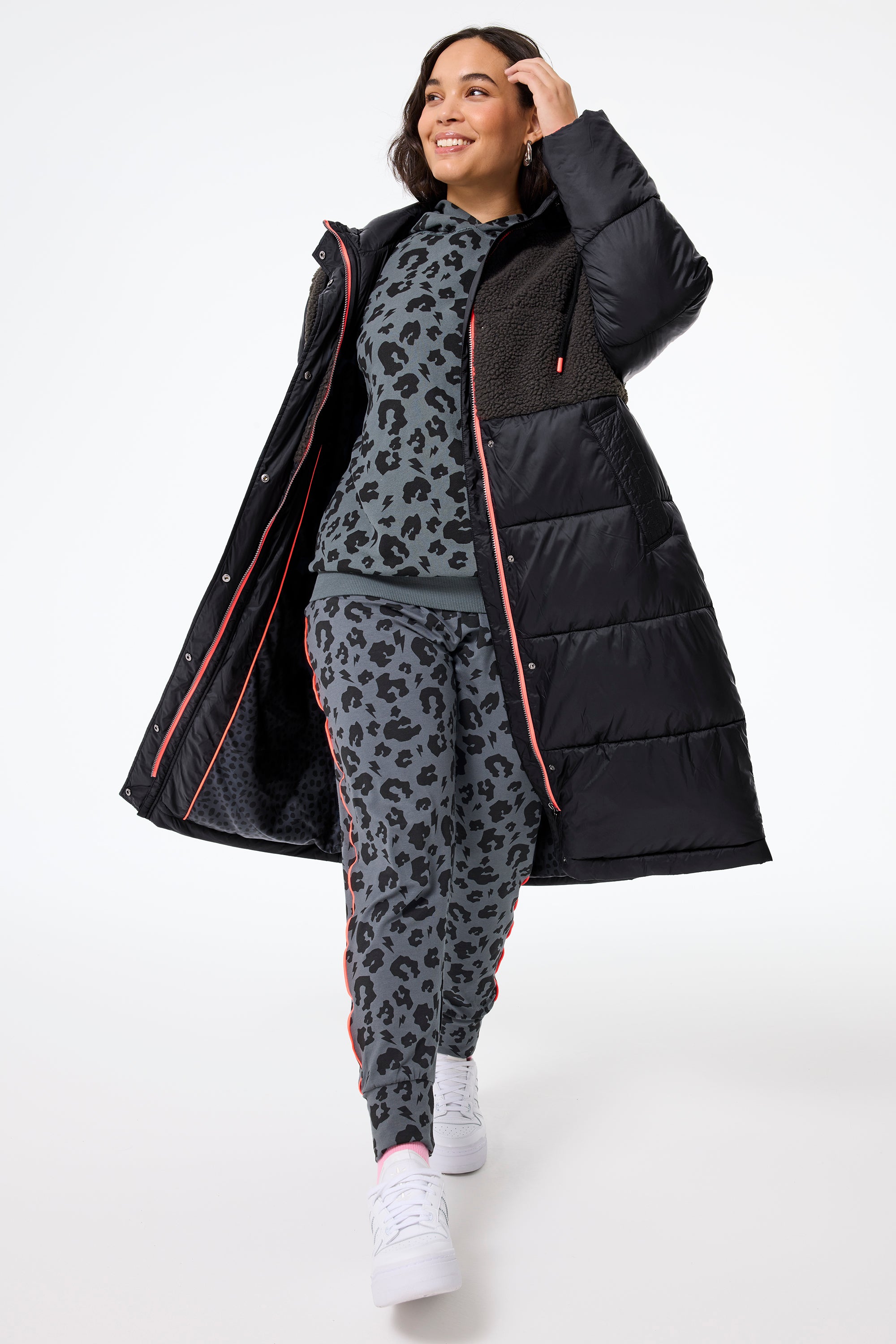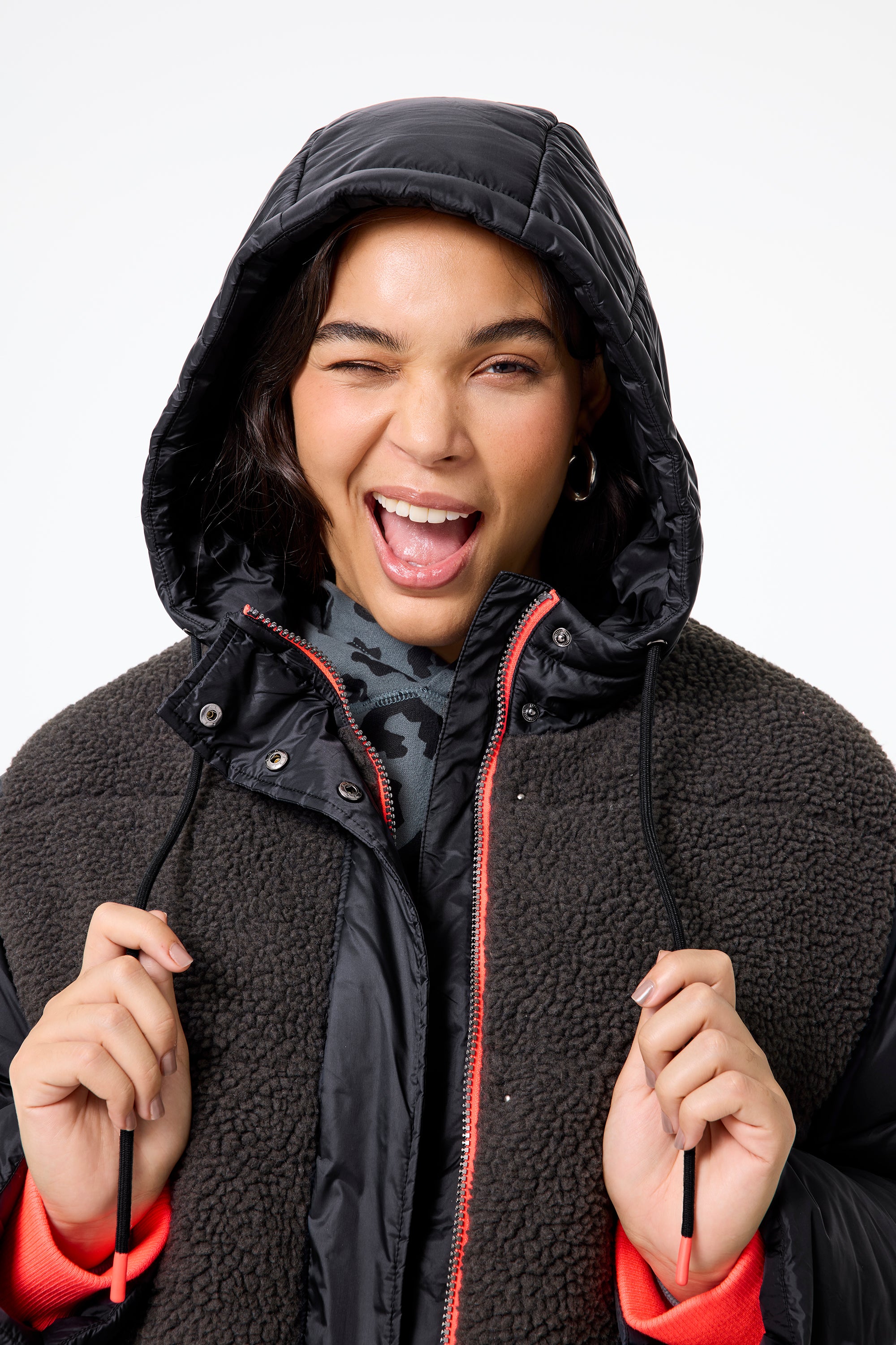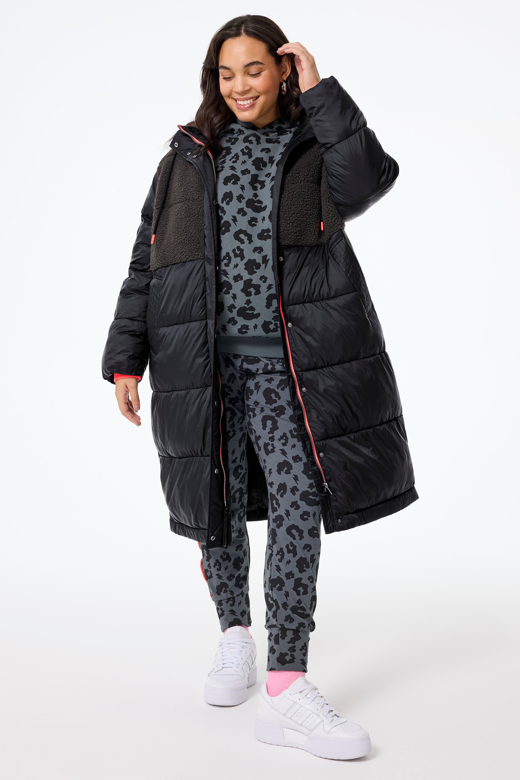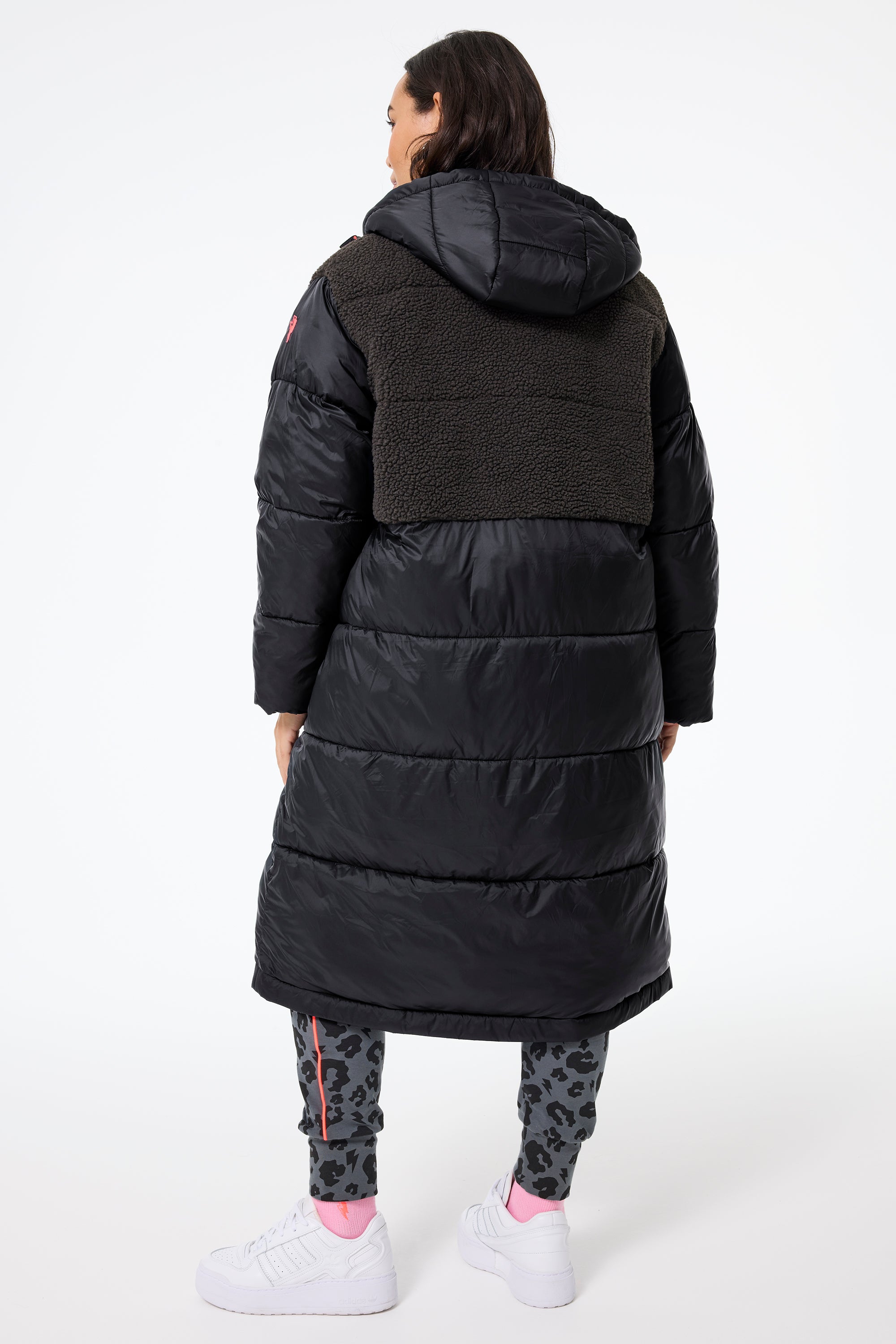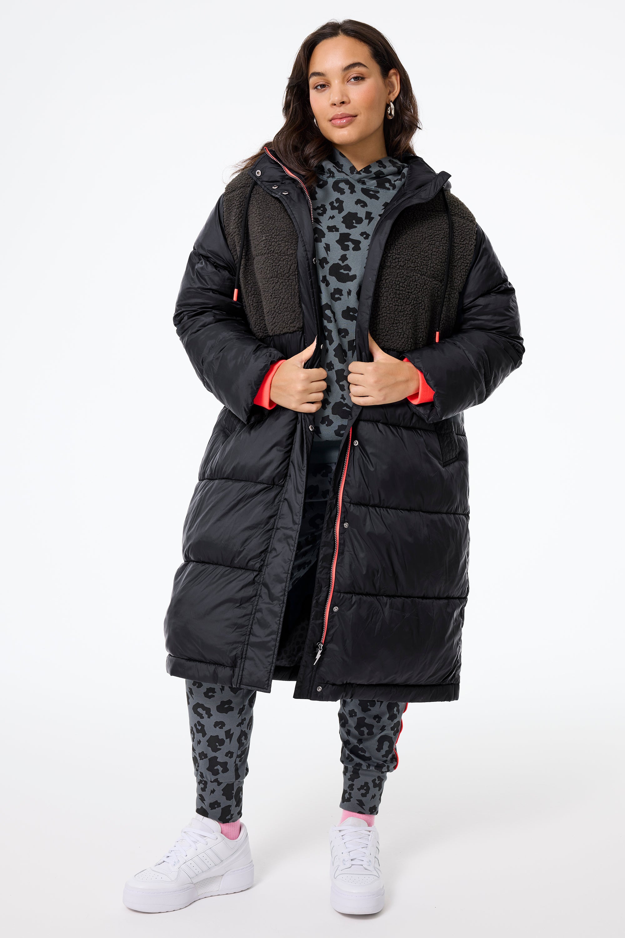 Take cover and cosy up in this black quilted longline puffer coat, your Autumn/Winter wardrobe staple. Adorned with borg detail, the long length style can be layered over your loungewear, jumpers and jeans or dresses to keep you warm and stylish all day long.