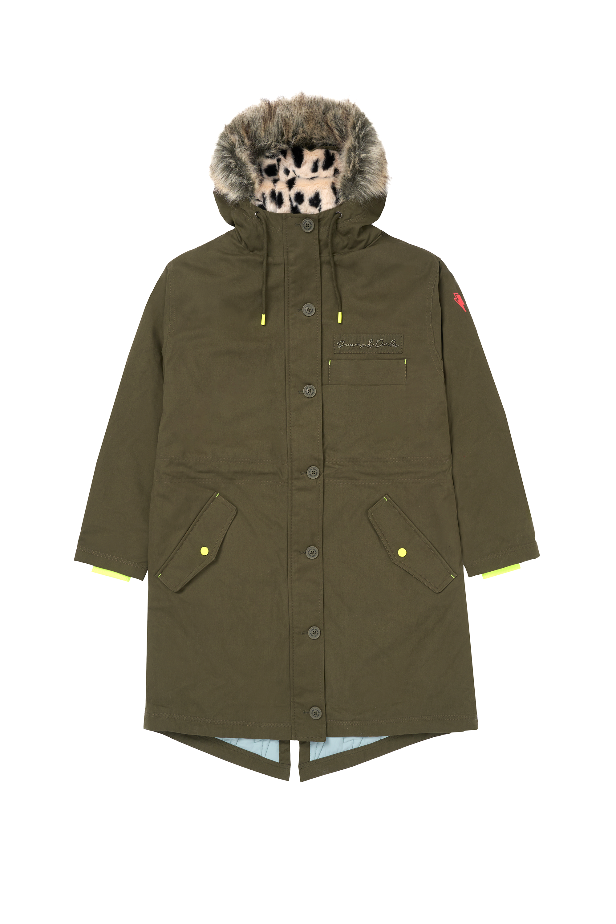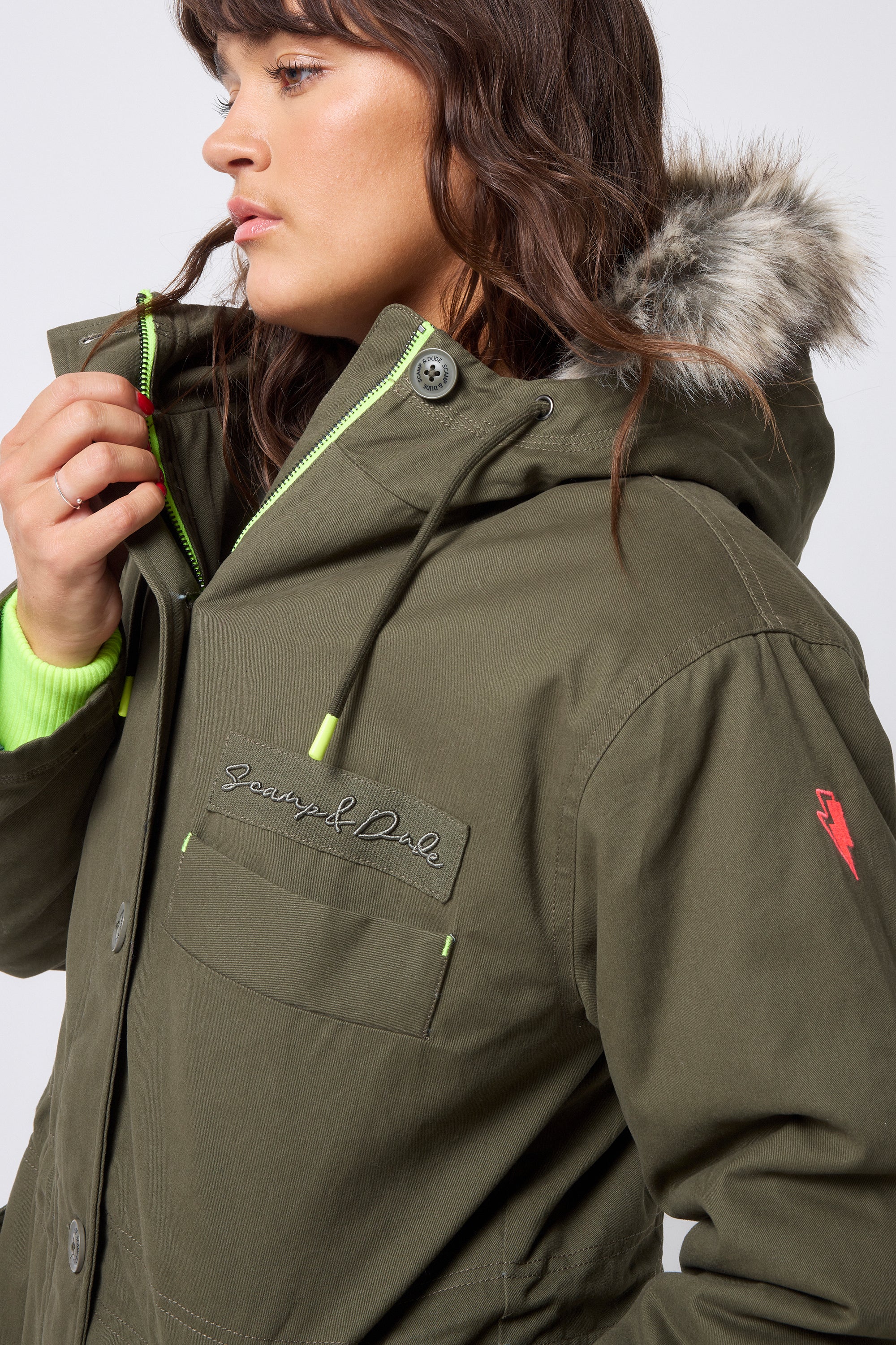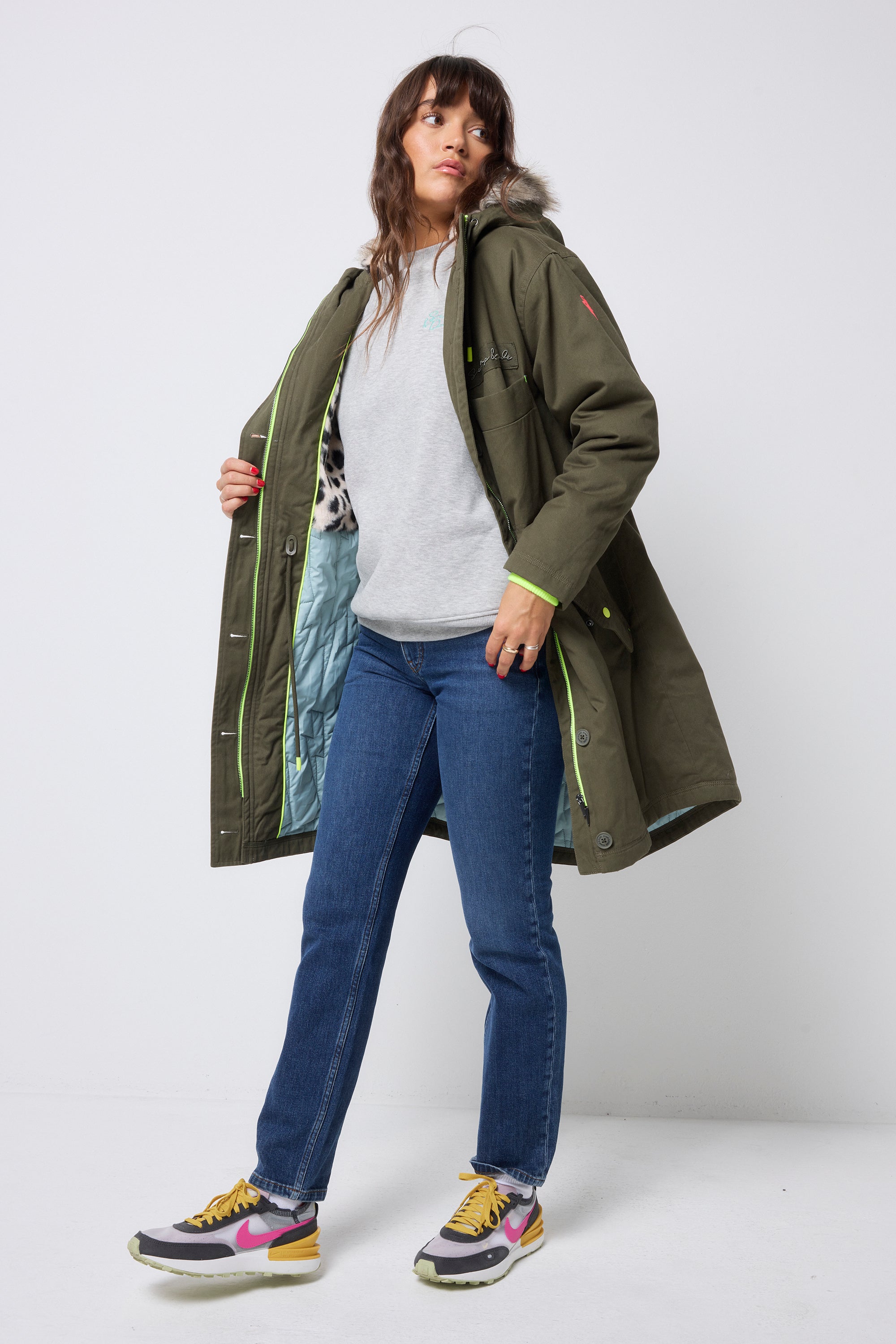 Keep the cold weather at bay. Cosy up in our khaki parka, complete with faux fur hood. This style boasts button fastenings and side pockets to provide versatile styling and practicality all year round.