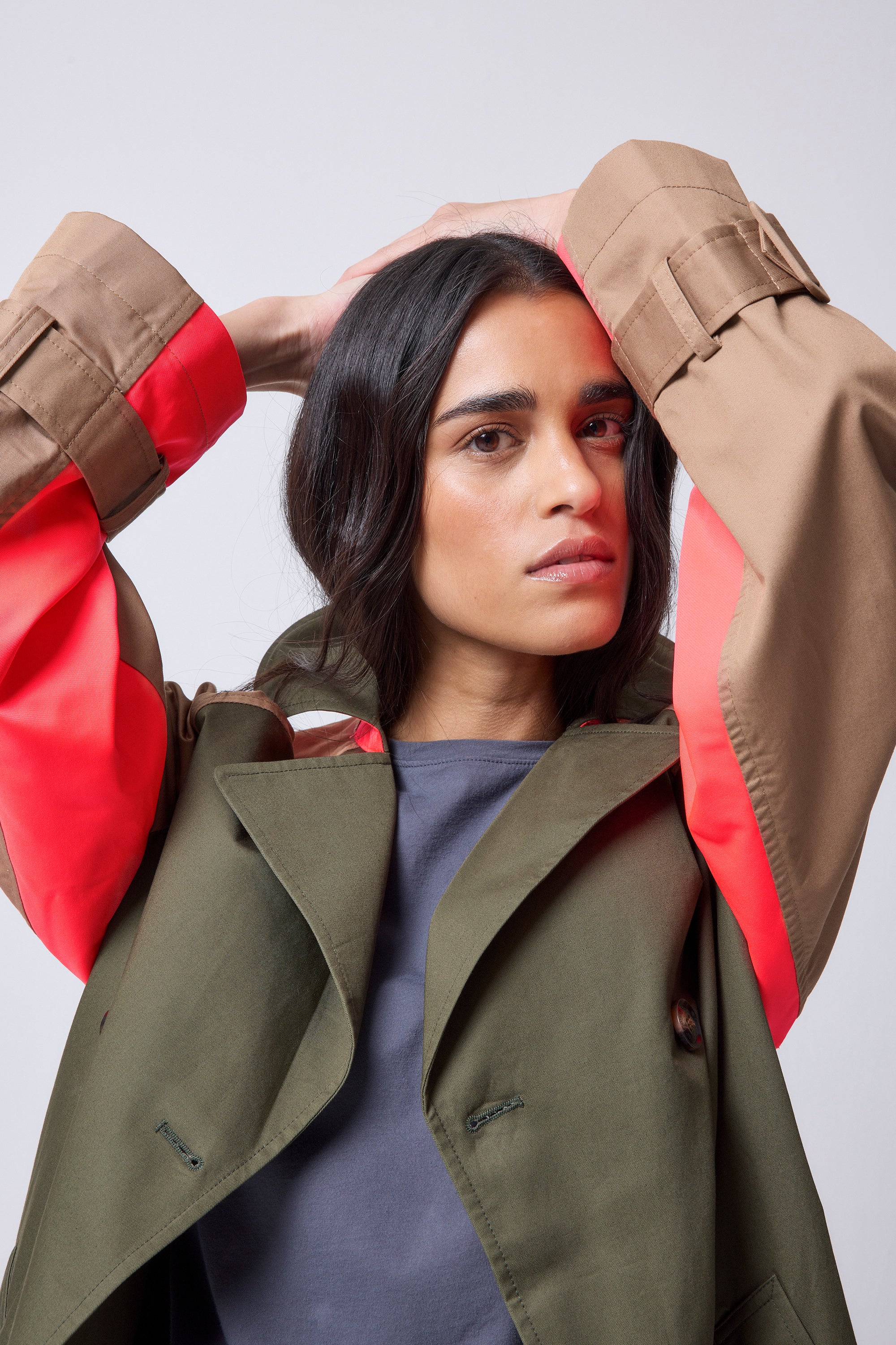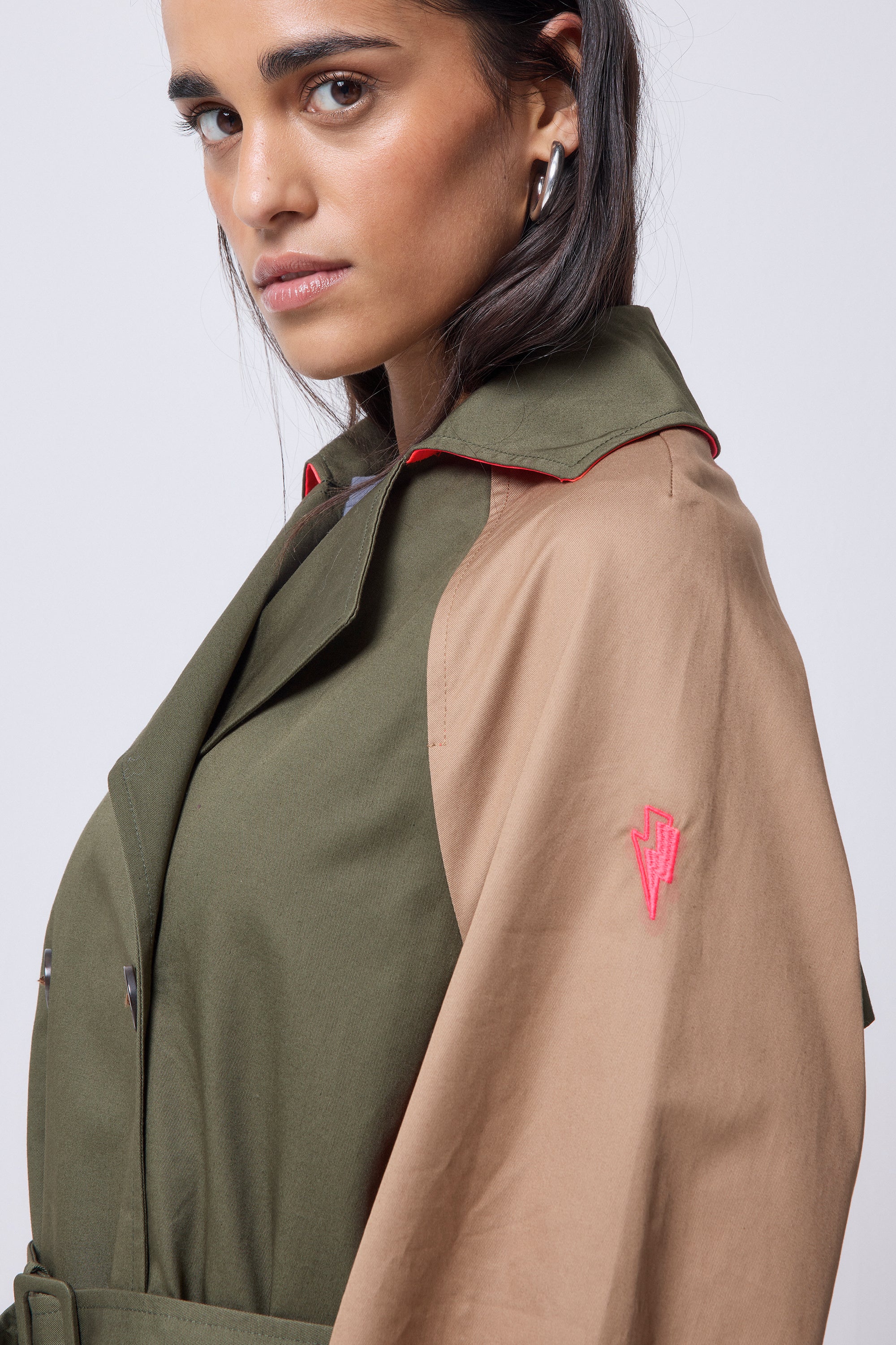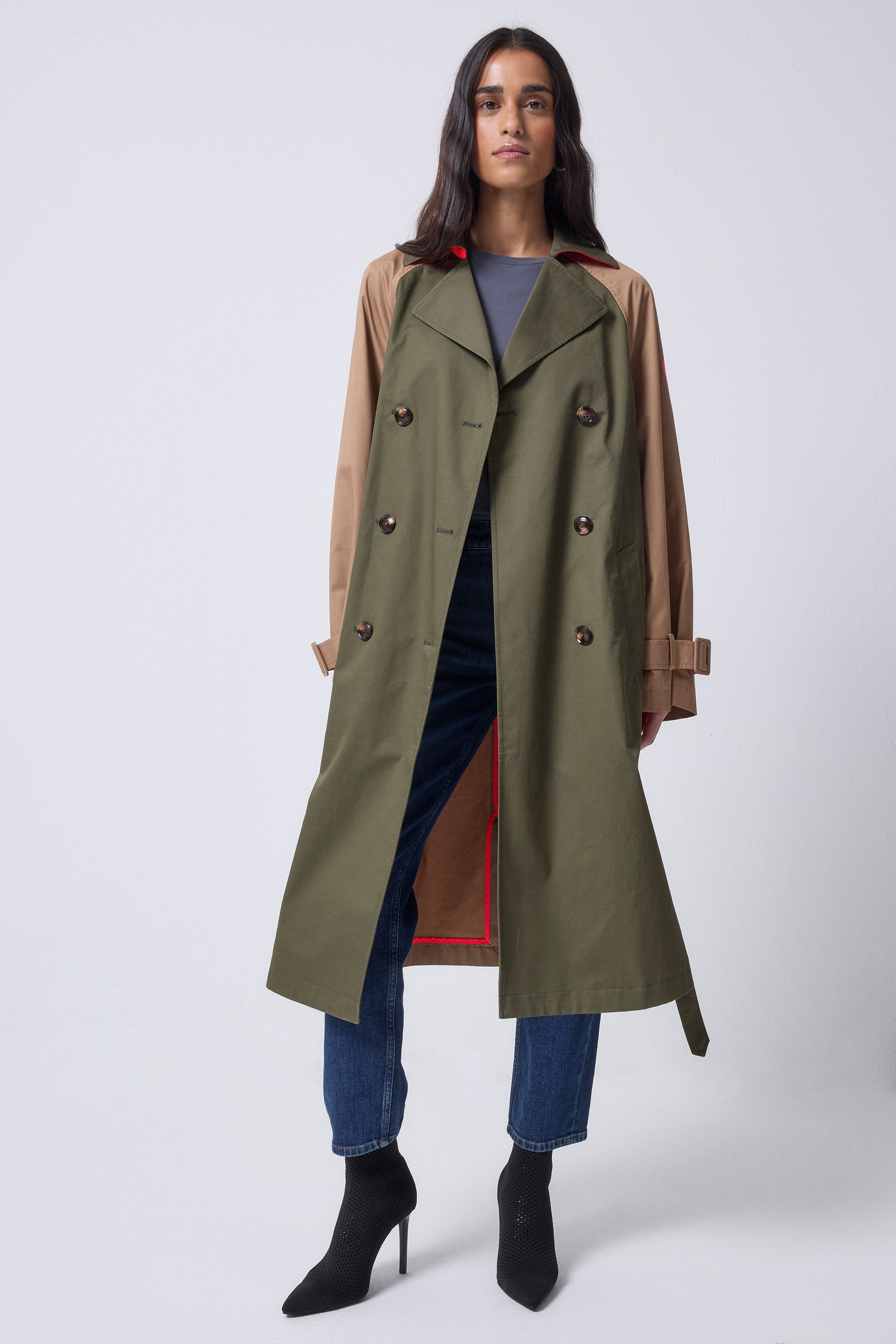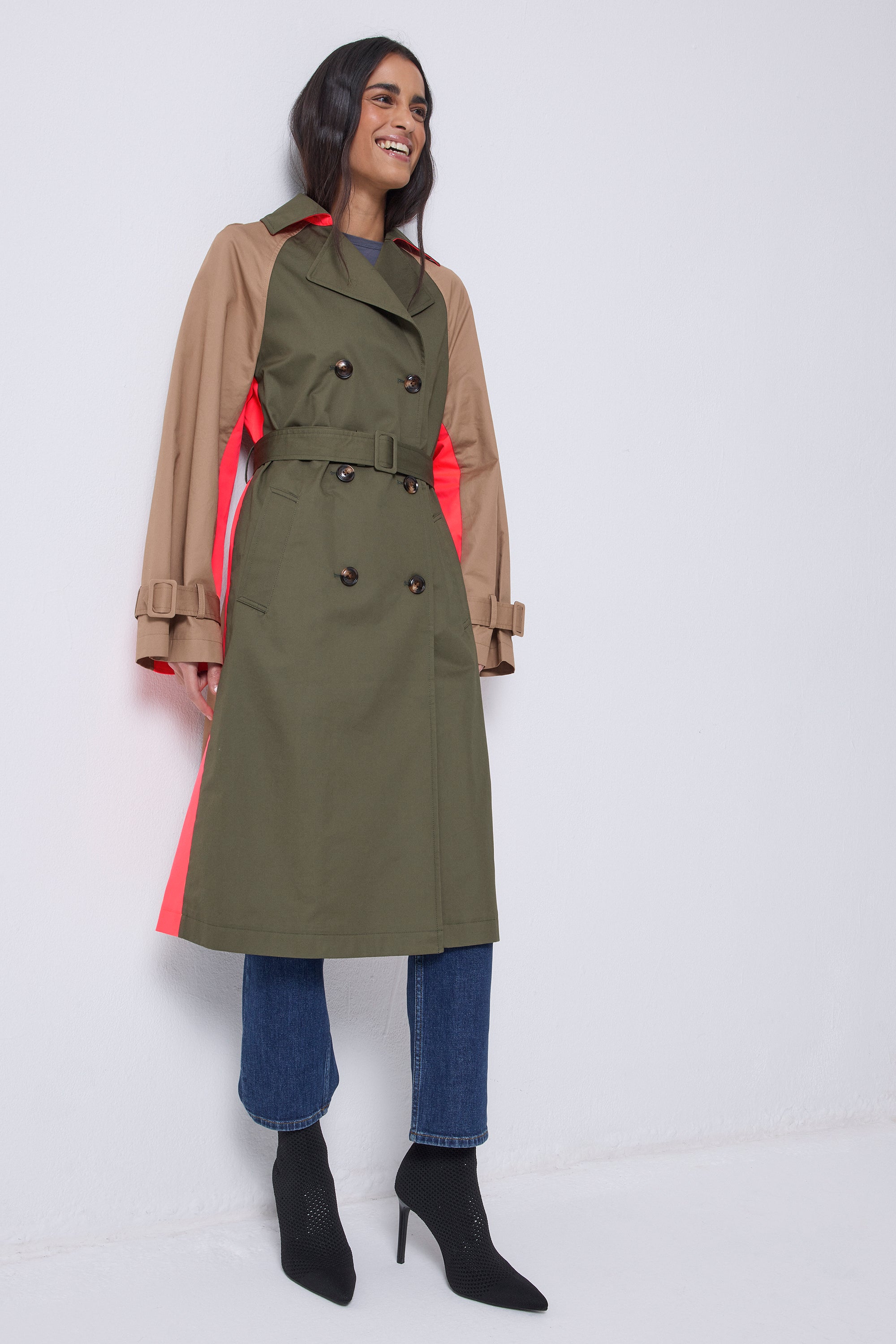 Khaki with Camel and Coral Colourblock Trench Coat