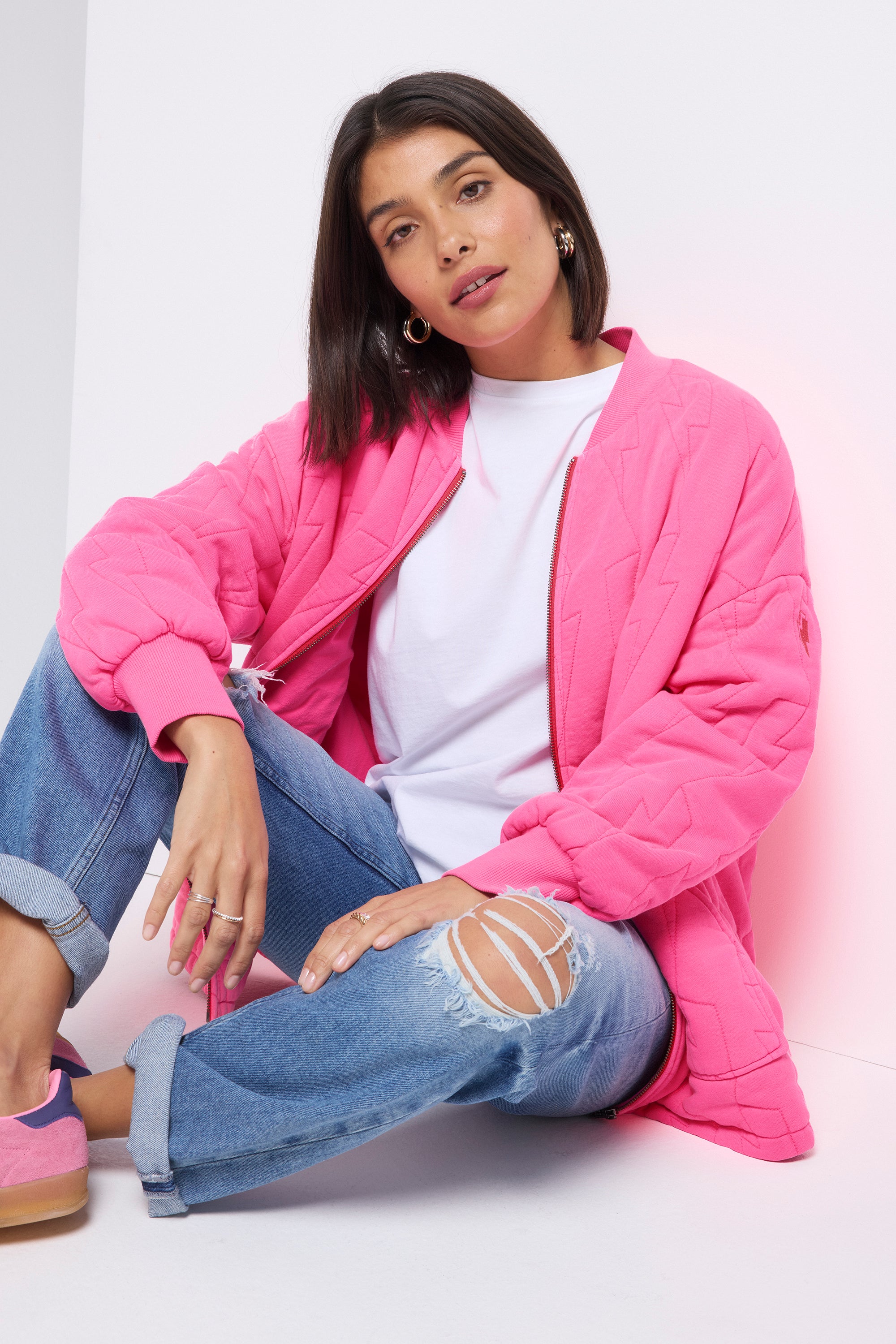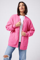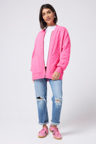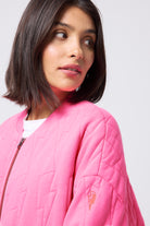 Repeat after us: you need this neon pink quilted bomber jacket in your life. It's the ultimate light layer, designed to become your go-to. With its distinctive elasticated back hem, roomy fit, and handy side pockets, you might just find yourself leaving your other jackets behind.