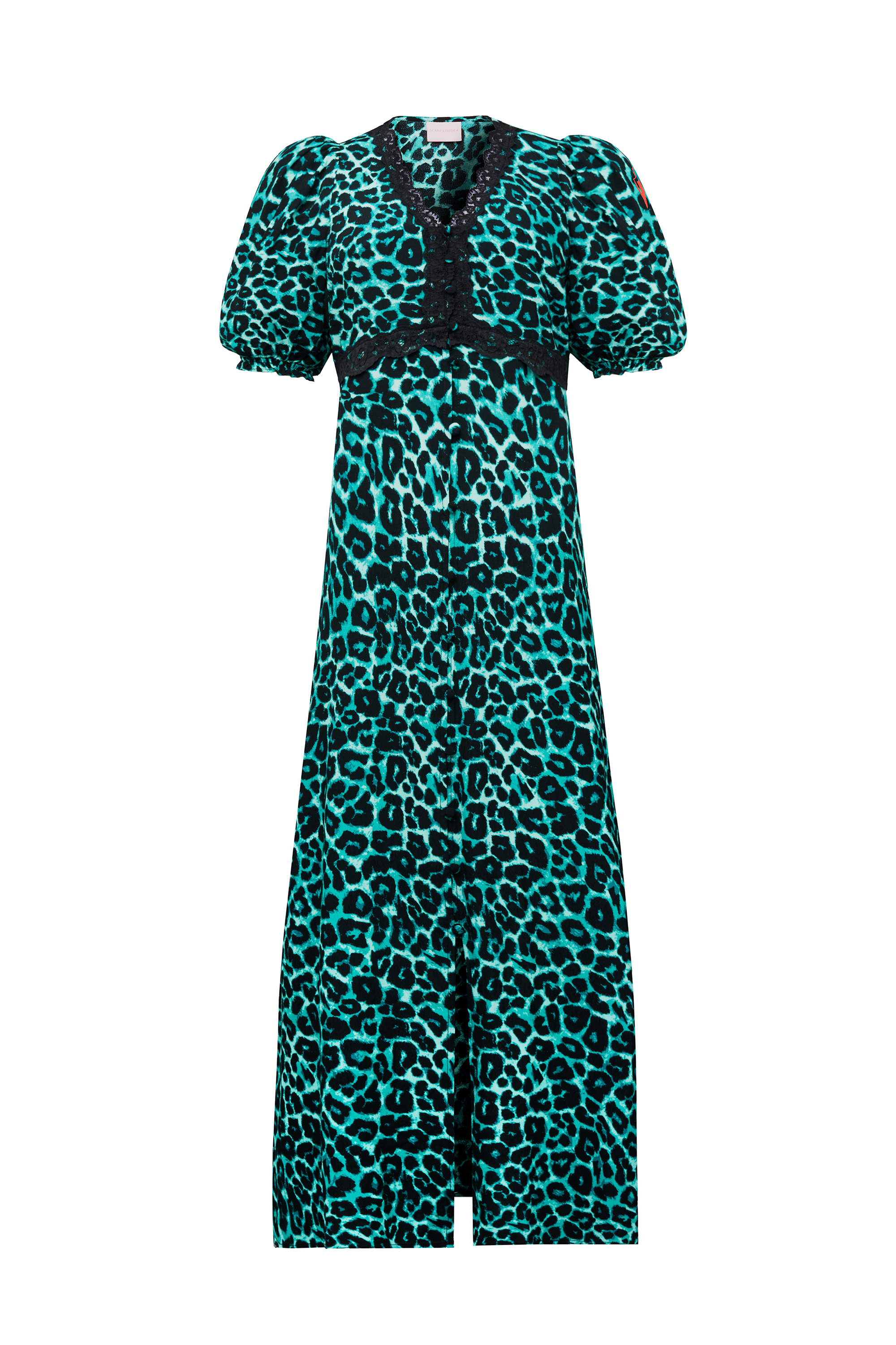 Green Jaguar Lace Trim Puff Sleeve Midi Tea Dress