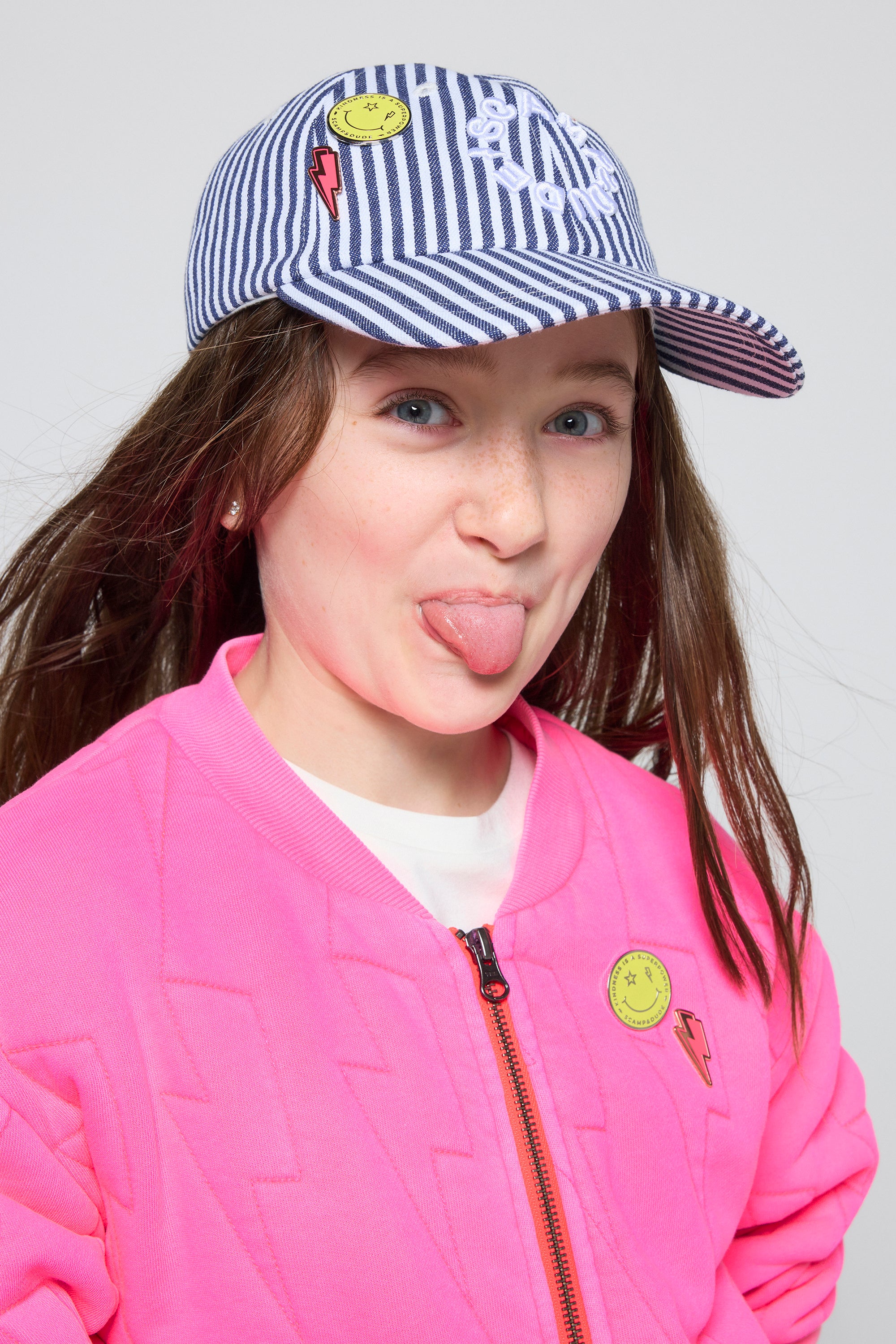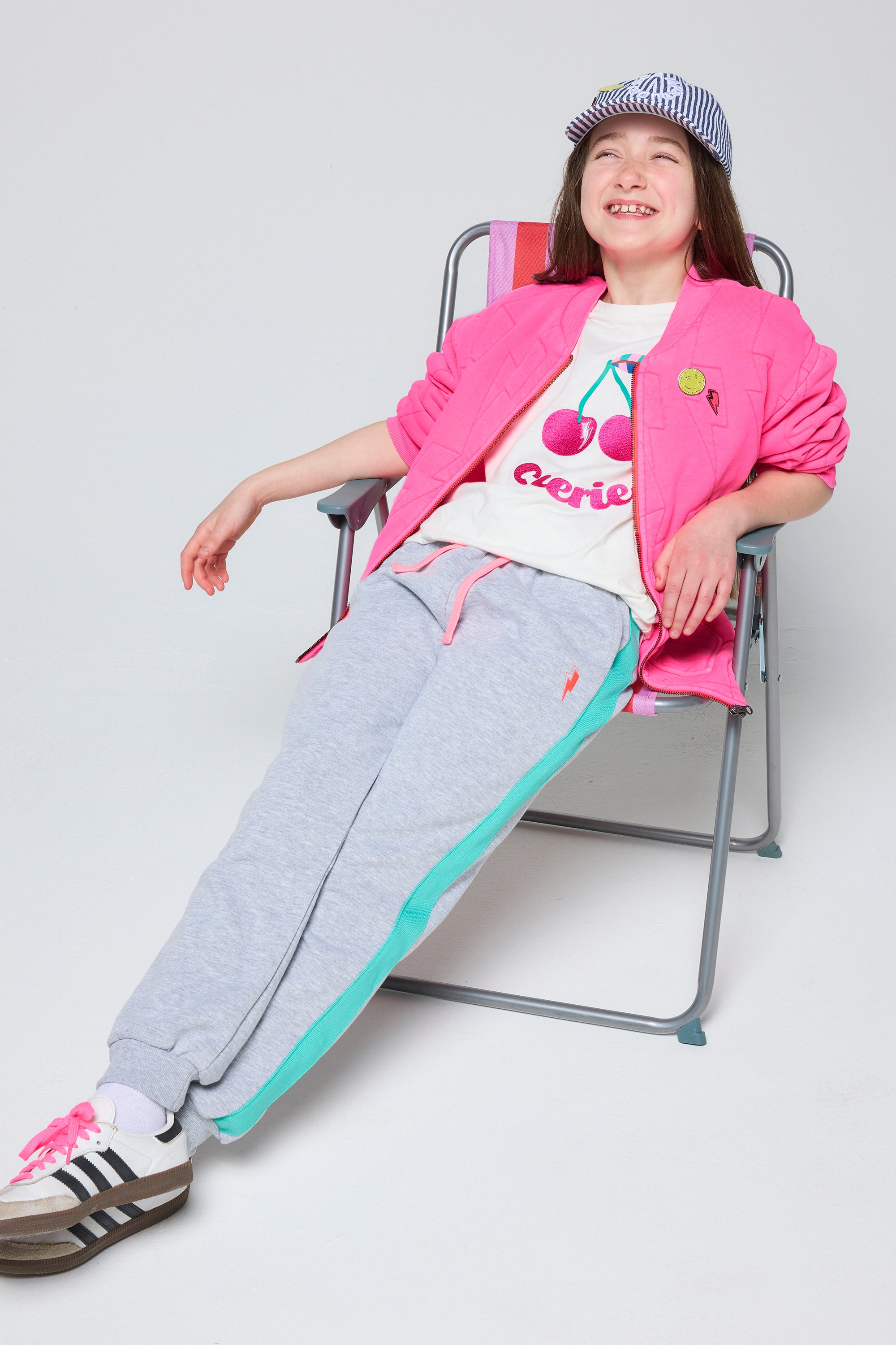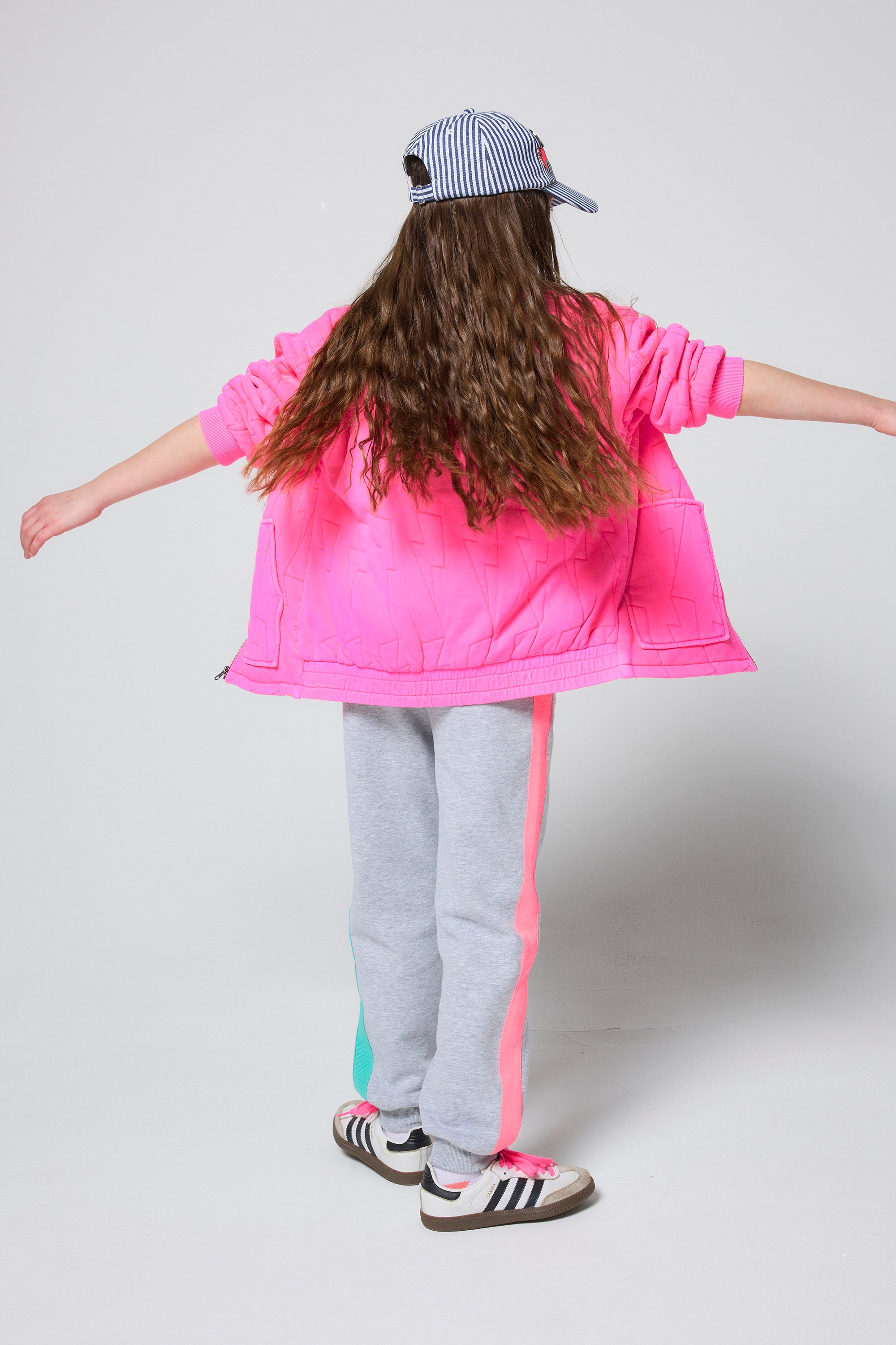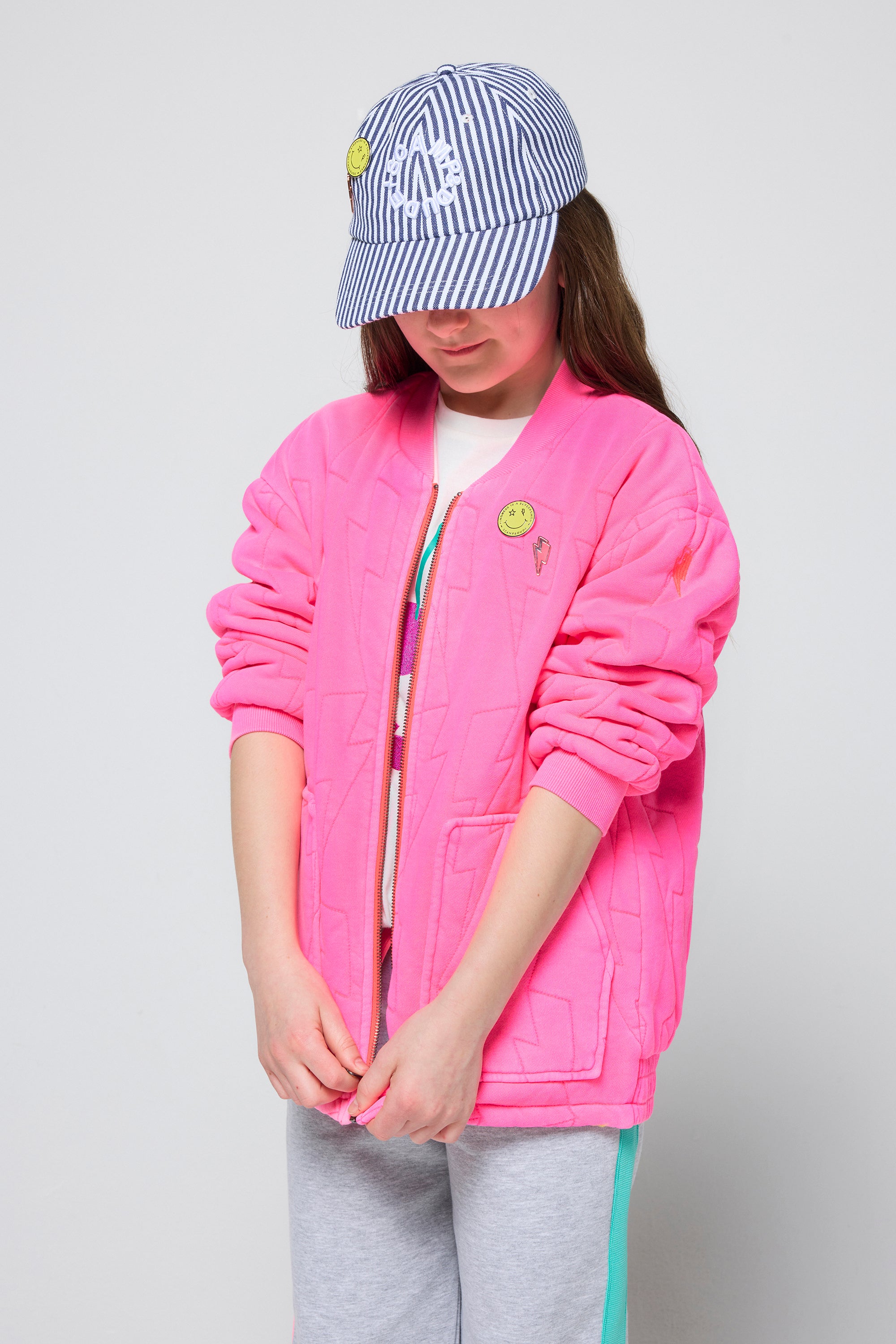 Our kids neon pink organic cotton quilted lightning bolt bomber jacket can be easily thrown on when the weather's being unpredictable. It has a comfy oversized fit and a zipper fastening.