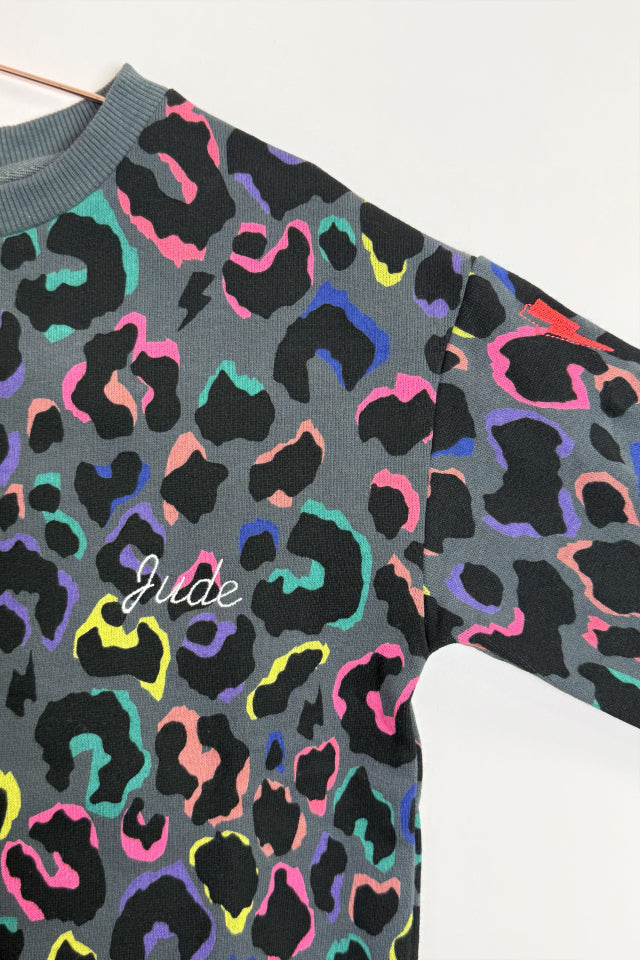 Kids will love this bright and playful grey with rainbow shadow leopard and lightning bolt print oversized sweatshirt. It's oversized fit makes it easy to layer, while dropped shoulder seams add to the relaxed feel, it's all they need for day-long style and comfort.