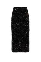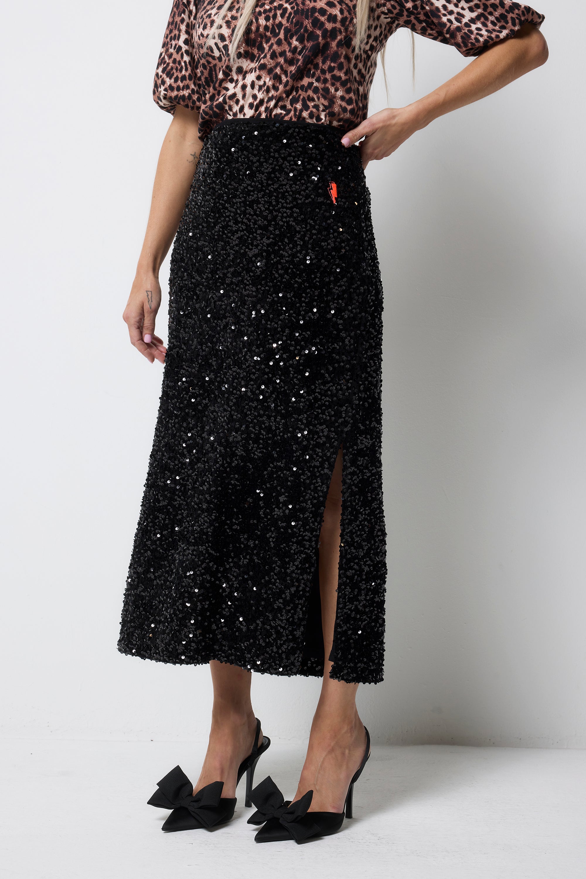 Shine bright in our sparkling black sequin velvet midi skirt. With all-over twinkling sequins, it is sure to have you dance floor ready.