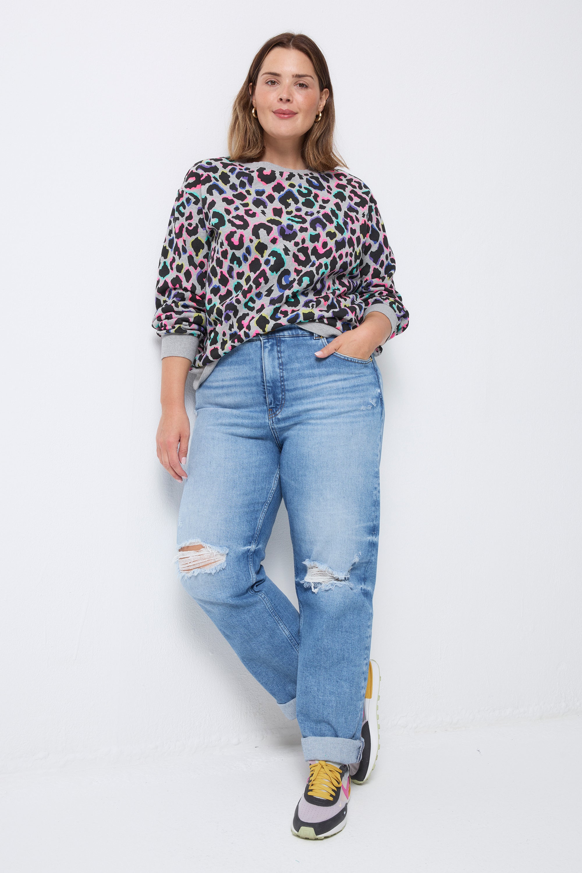 Amp up your casual collection with this light grey with rainbow shadow leopard and lightning bolt print oversized sweatshirt. It's oversized fit makes it easy to layer, while dropped shoulder seams add to the relaxed feel. The eye-catching design is bound to draw attention wherever you go.