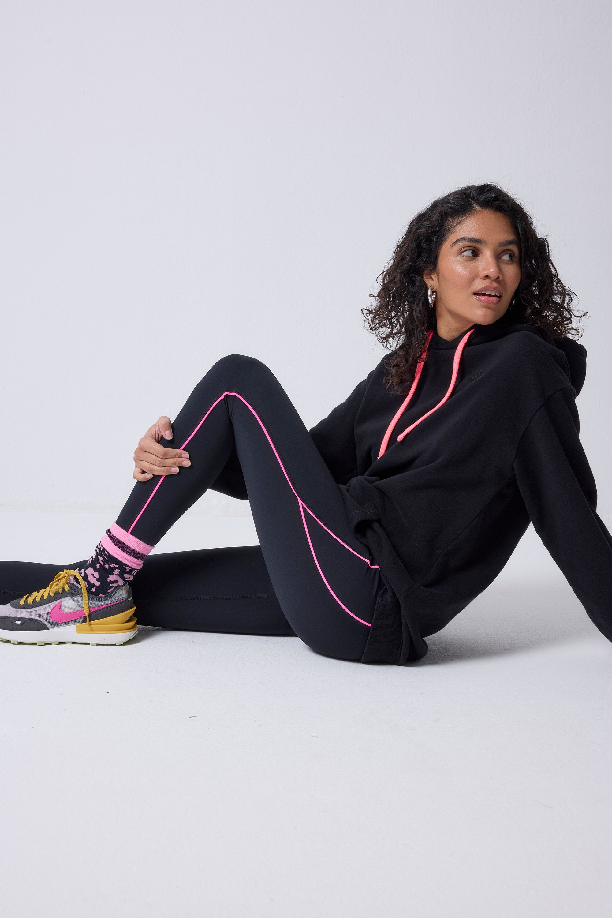 Go from studio to street in prints that perform. Our black with neon piping gym leggings are designed with sculpting four-way stretch fabric and a flattering high-rise waistband. Crafted to cinch and lift in all the right places, these leggings are set to be the show-stopping heroes of your activewear wardrobe.
