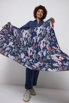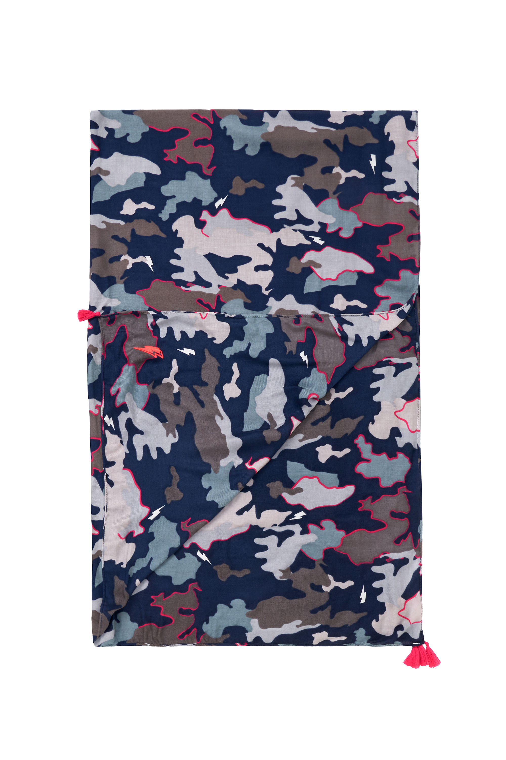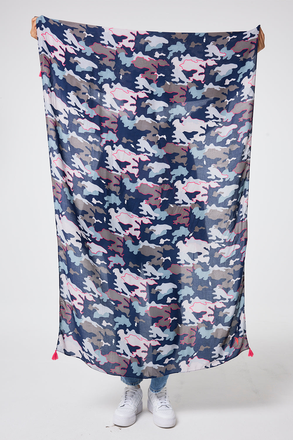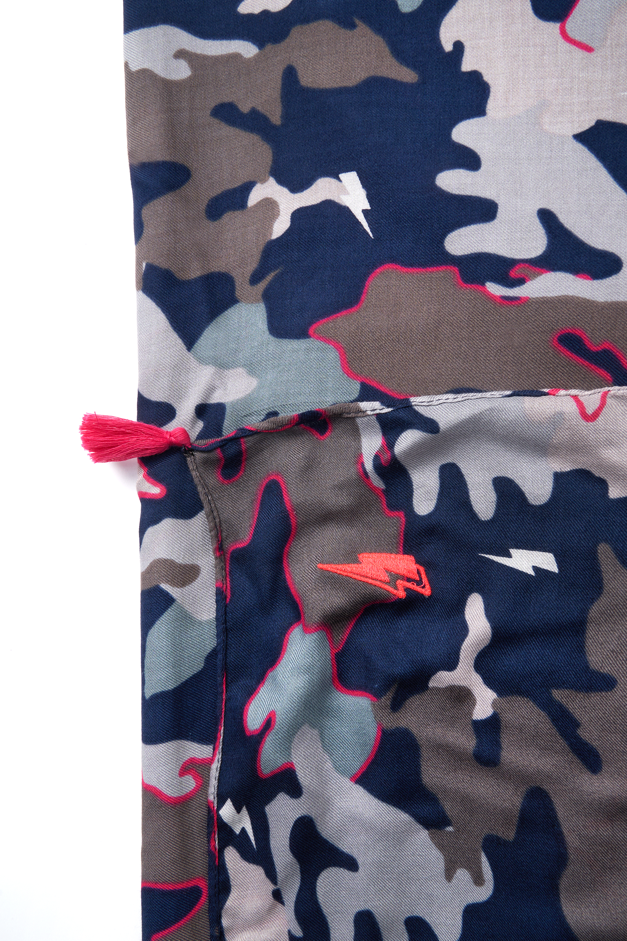 A super-soft, superpower-infused scarf in our Navy with Pink Camo Print featuring a pink tassel trim and neon pink embroidered lightning bolt Superpower Button.