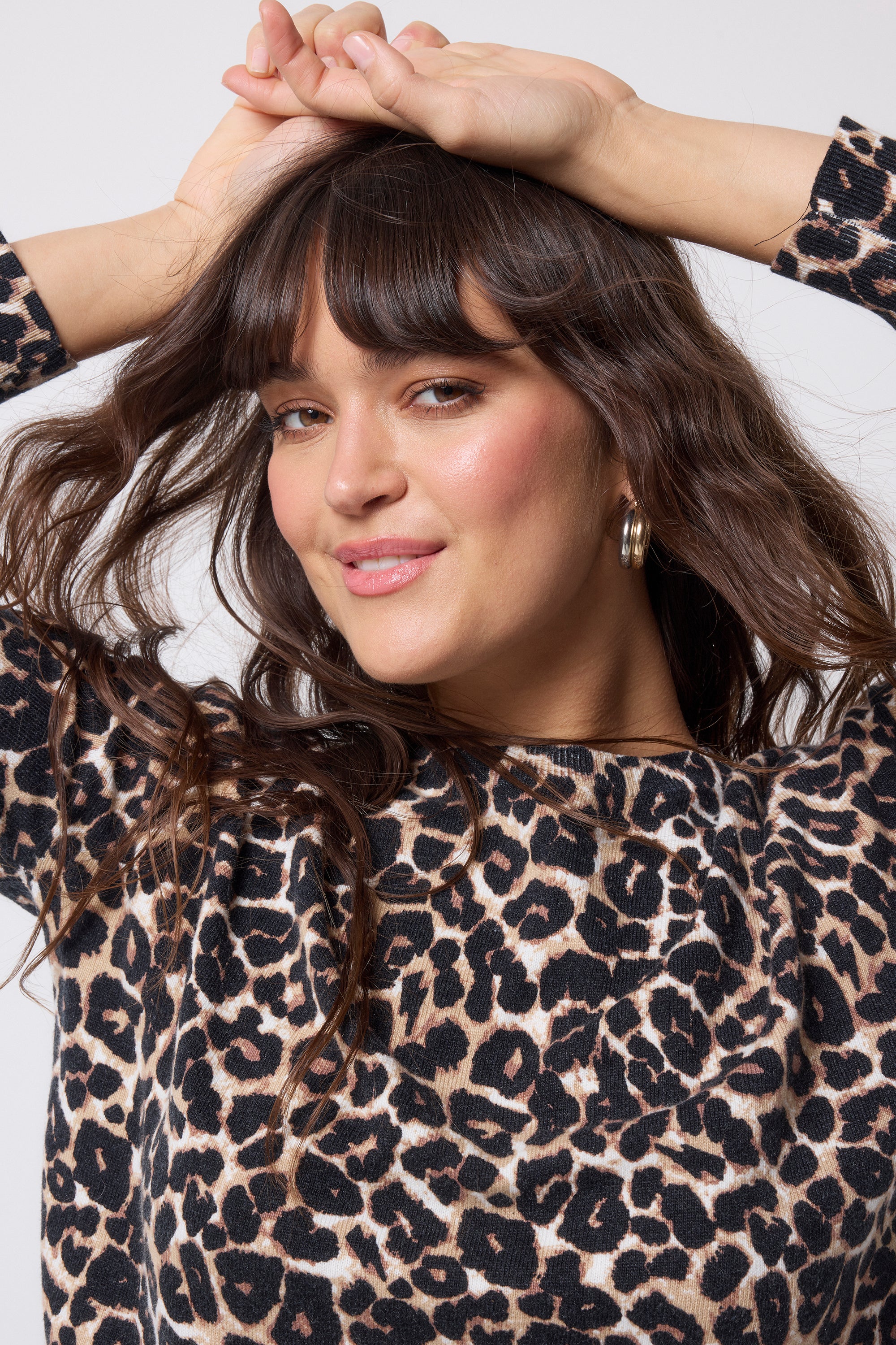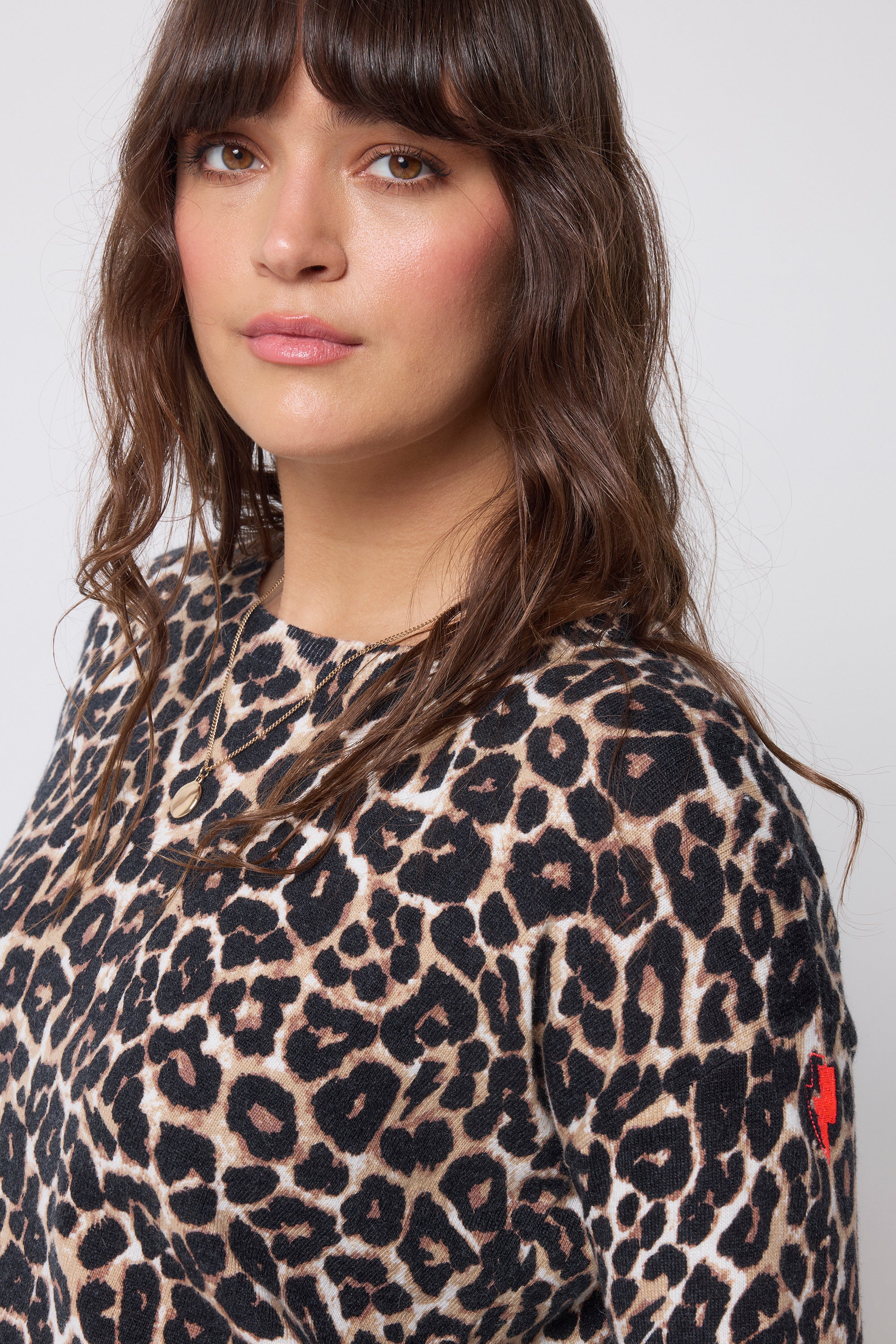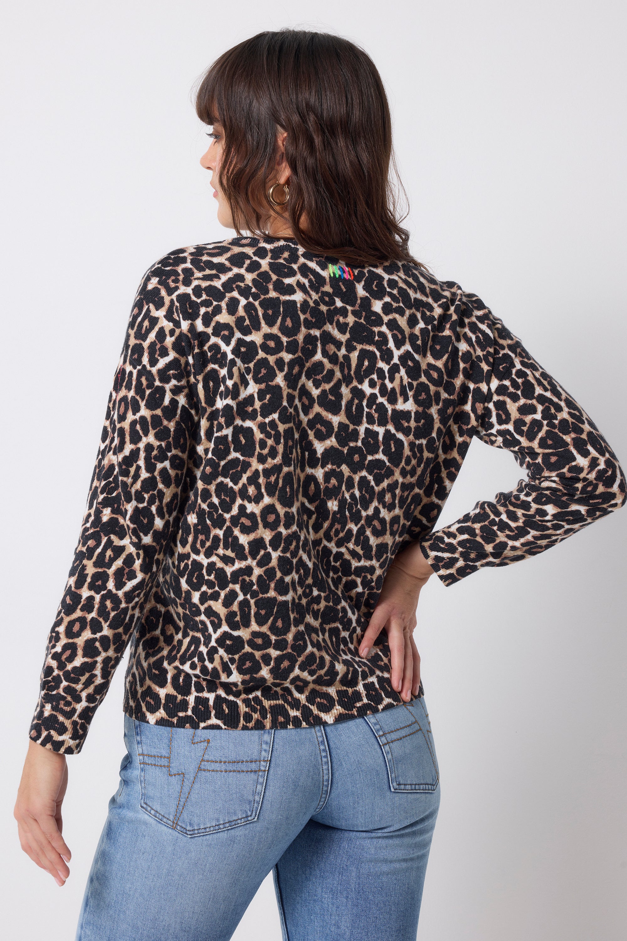 Our soft, neutral jaguar printed knit jumper is a wardrobe staple and a must-have for snuggling up. This charming soft knit boasts eye-catching hues. For seasonal chic pair with a denim skirt or jeans.