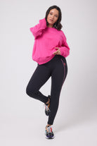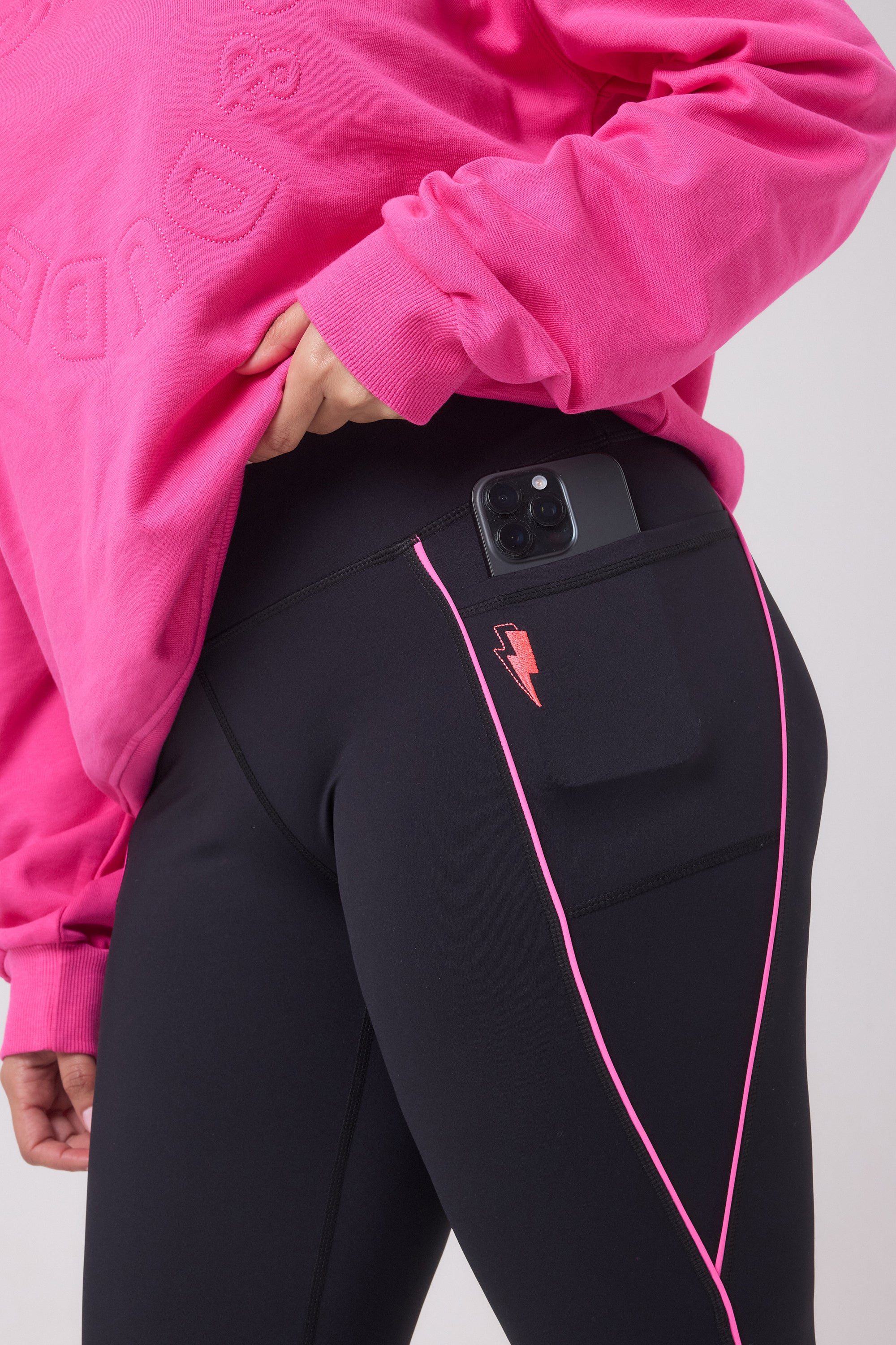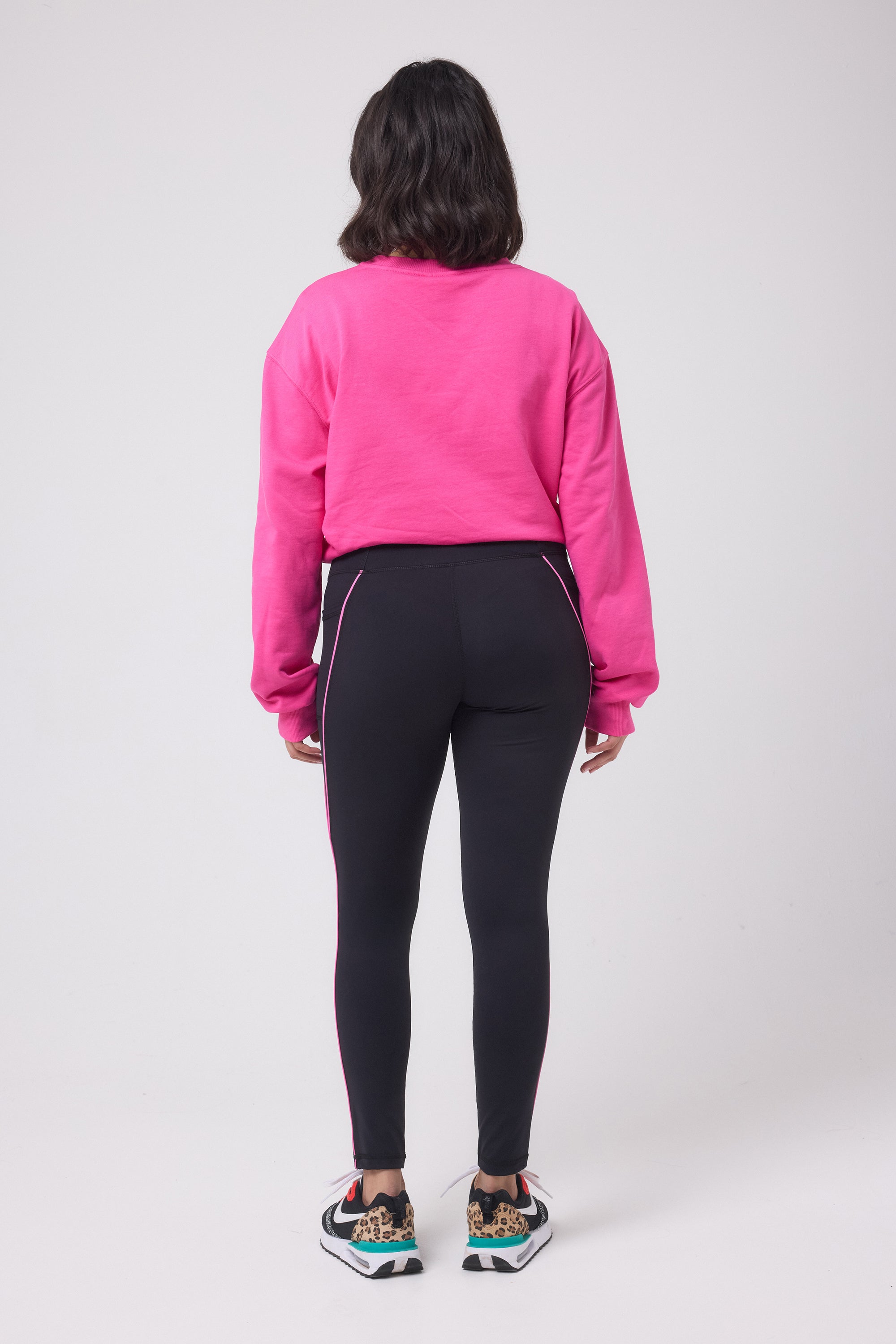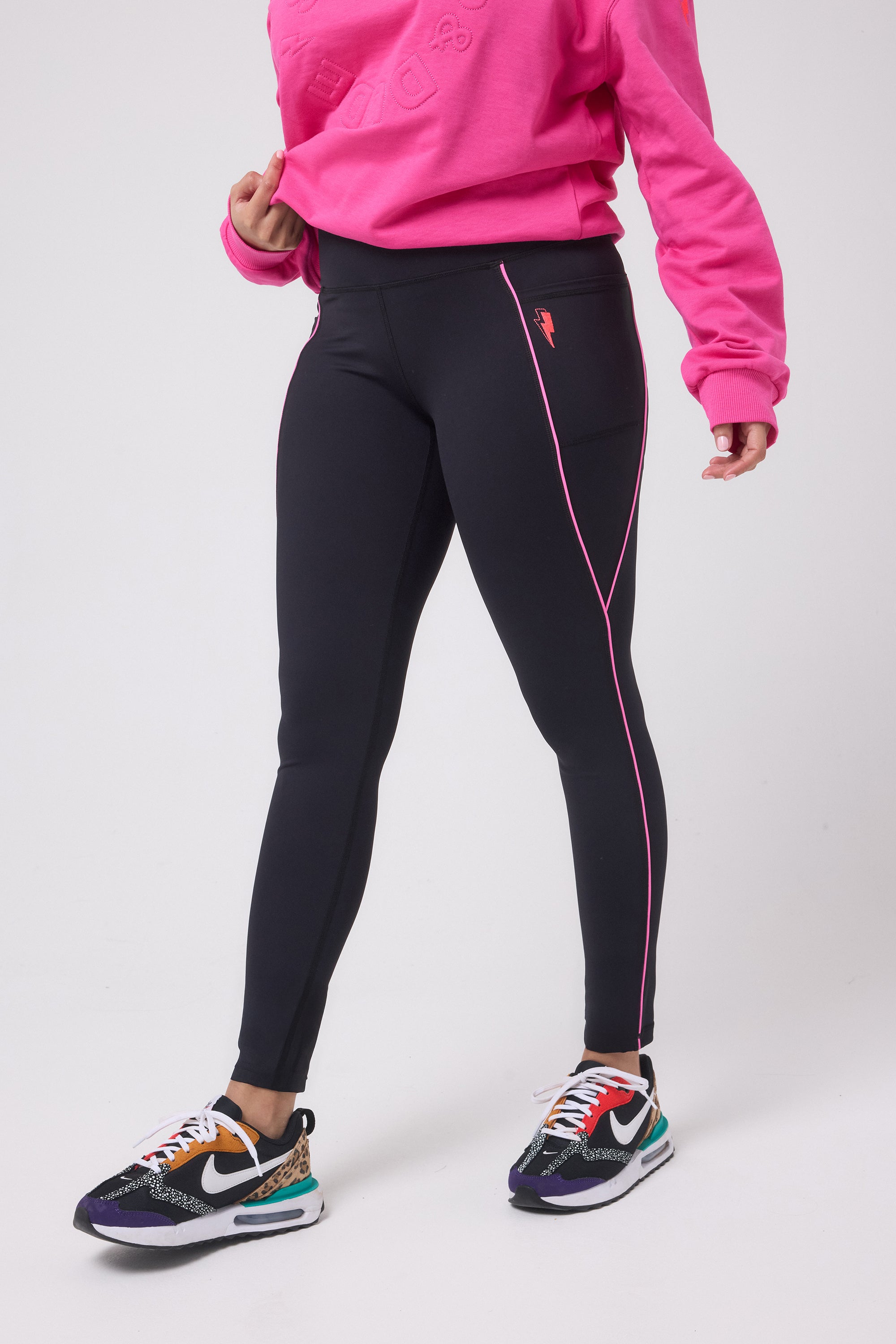 Go from studio to street in prints that perform. Our black with pink neon piping gym leggings are designed with sculpting four-way stretch fabric and a flattering high-rise waistband. Designed with two deep side pockets to keep your phone and essentials secure. Crafted to cinch and lift in all the right places, these leggings are set to be the show-stopping heroes of your activewear wardrobe.