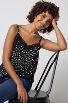 Slip into our star print lace cami top, a blend of playful polish and comfort. Perfect for adding a touch of soft sophistication to your wardrobe.