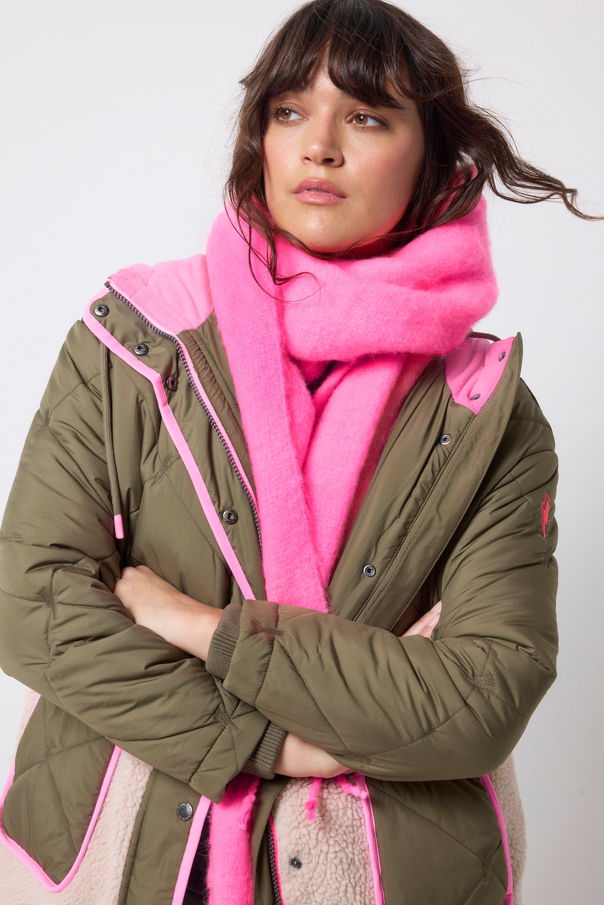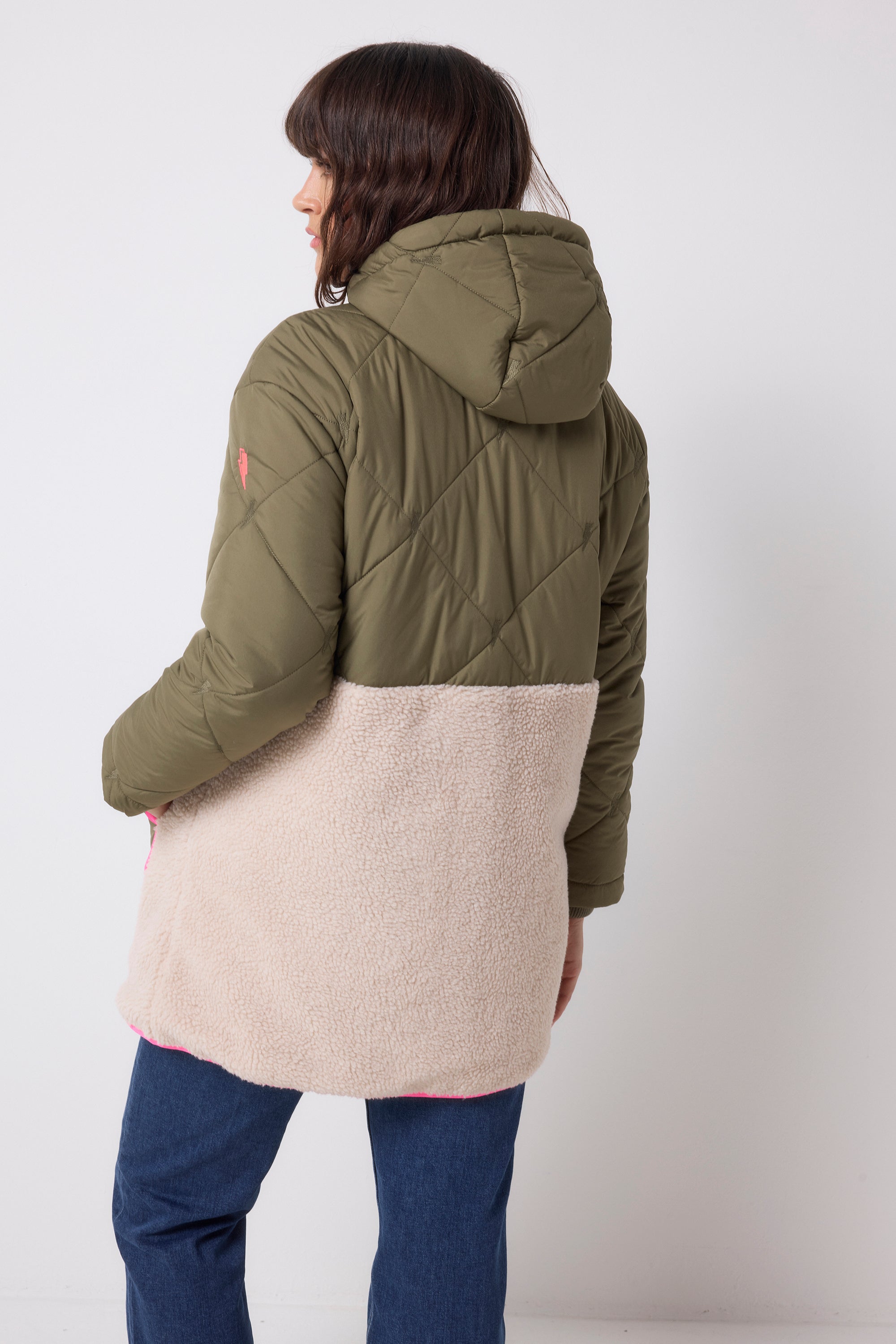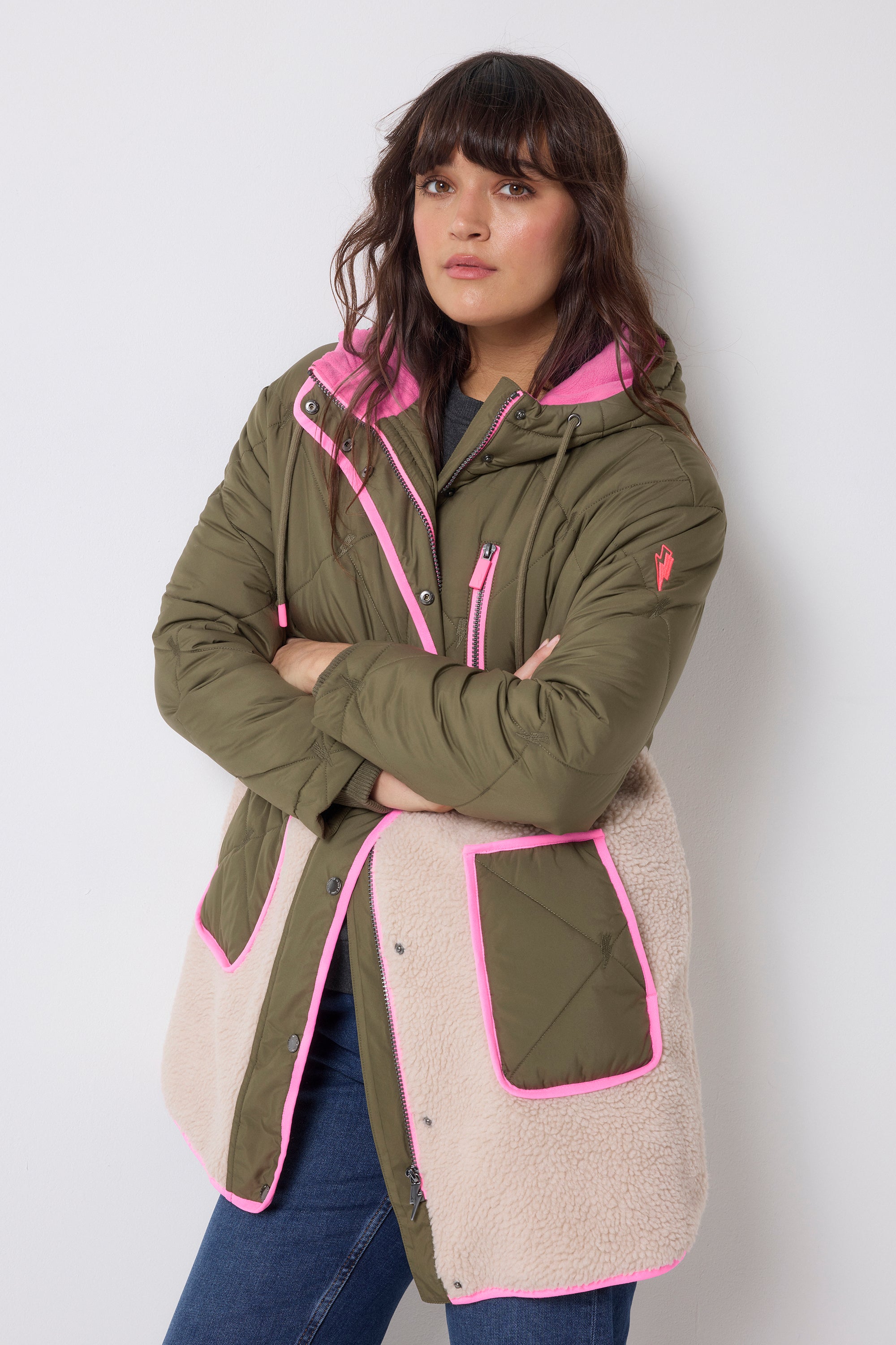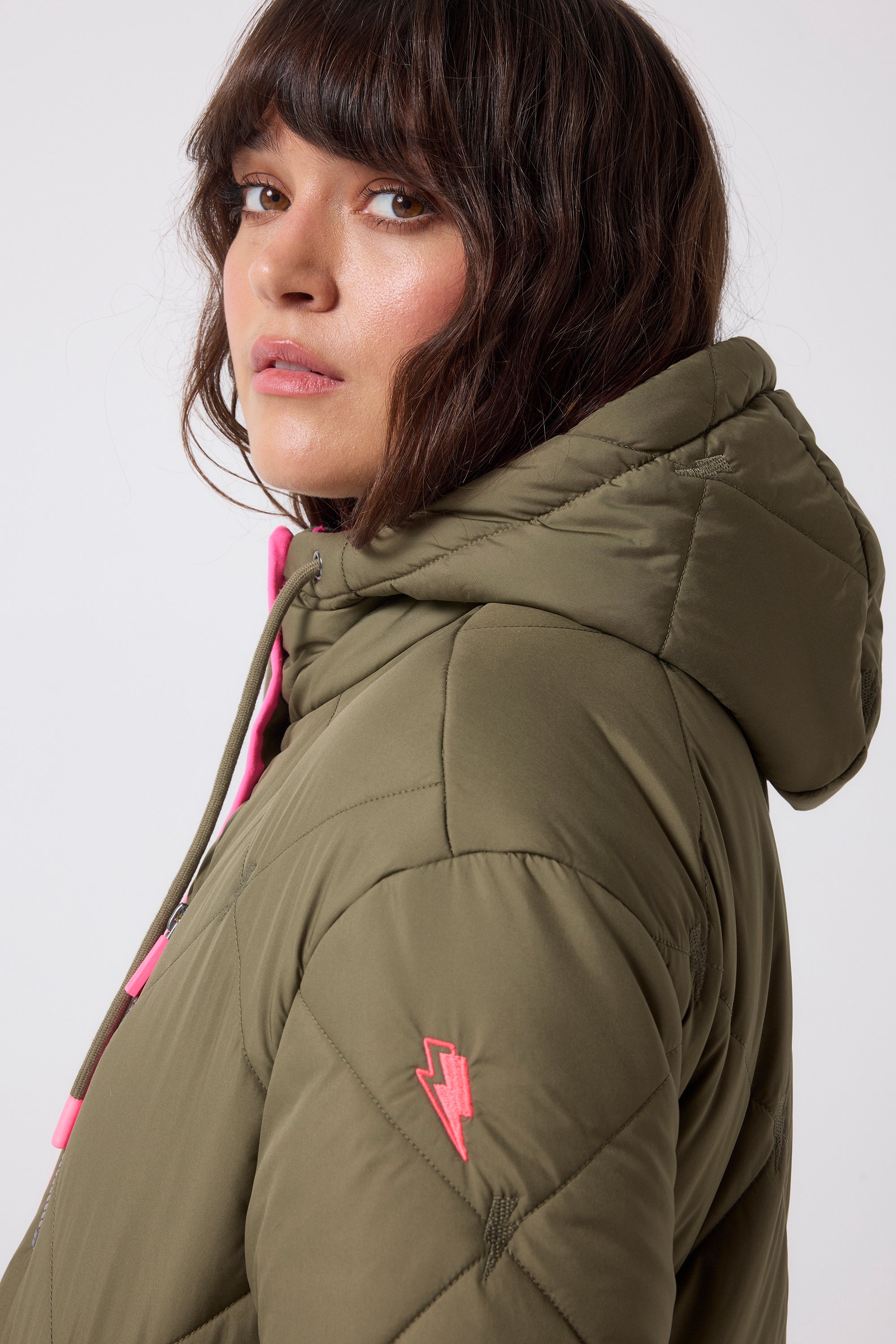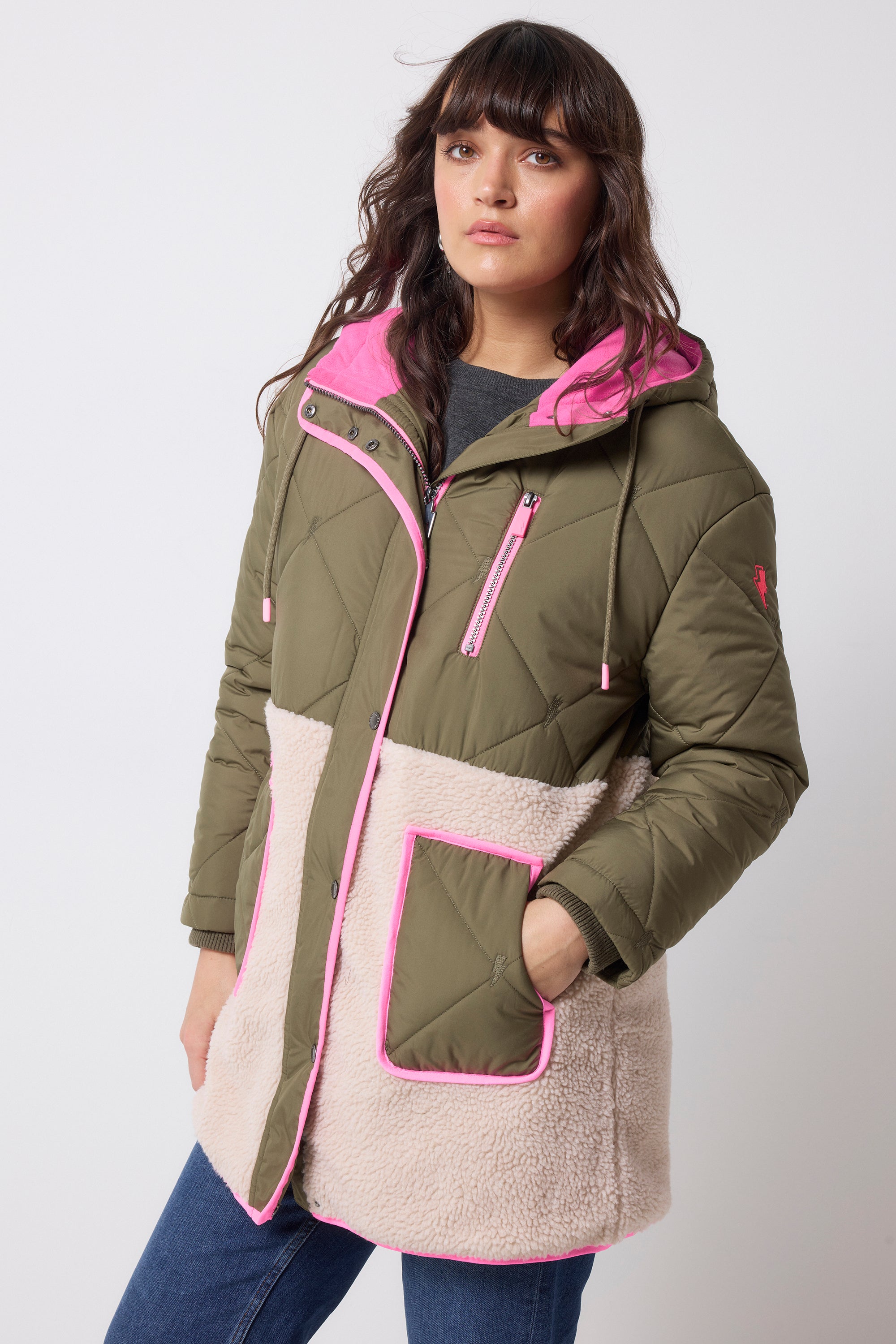 Keep the cold weather at bay. Cosy up in our quilted khaki coat, complete with soft borg panelling. This style boasts a pink fleece lined hood, popper fastenings and pockets to provide versatile styling and practicality all year round.