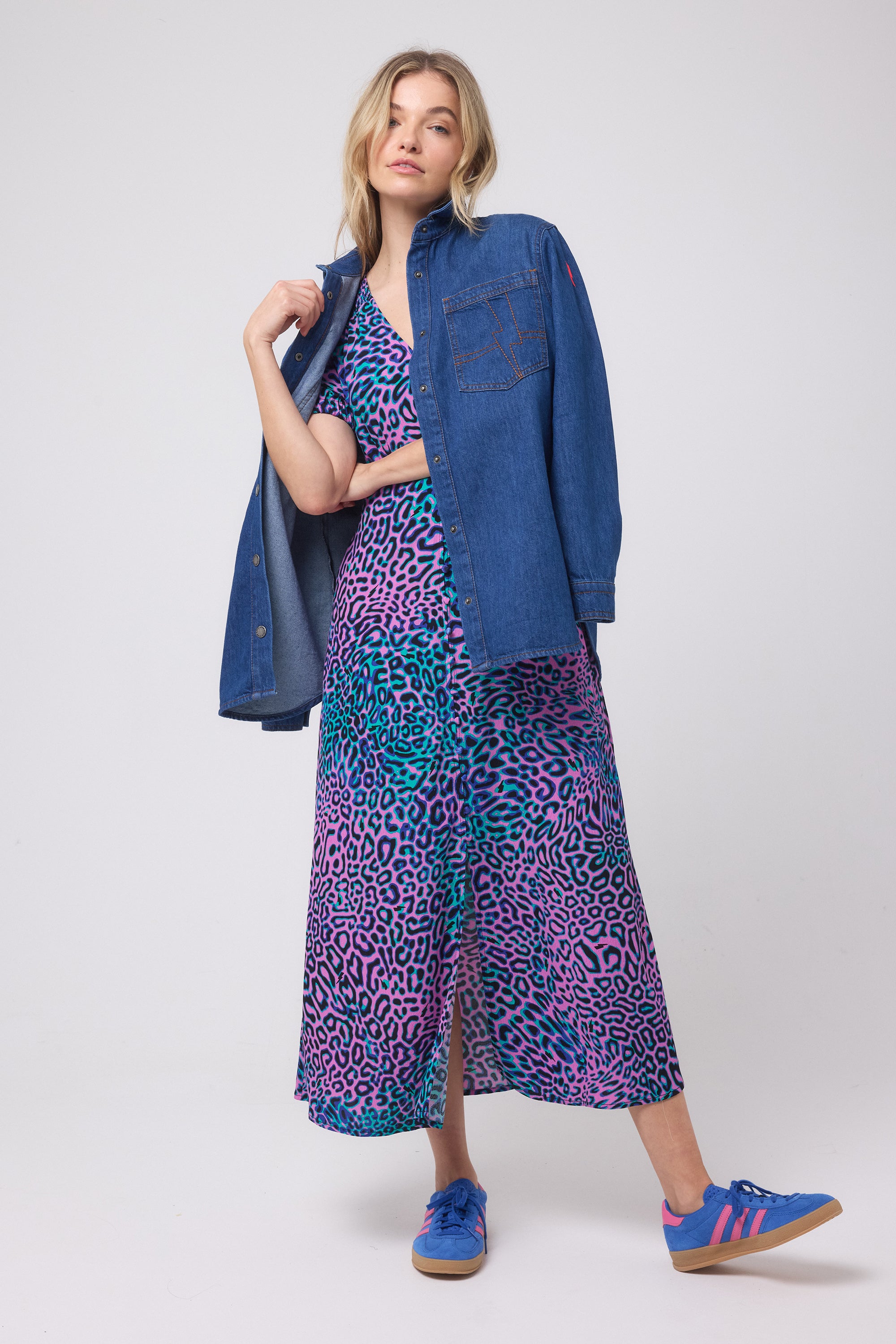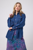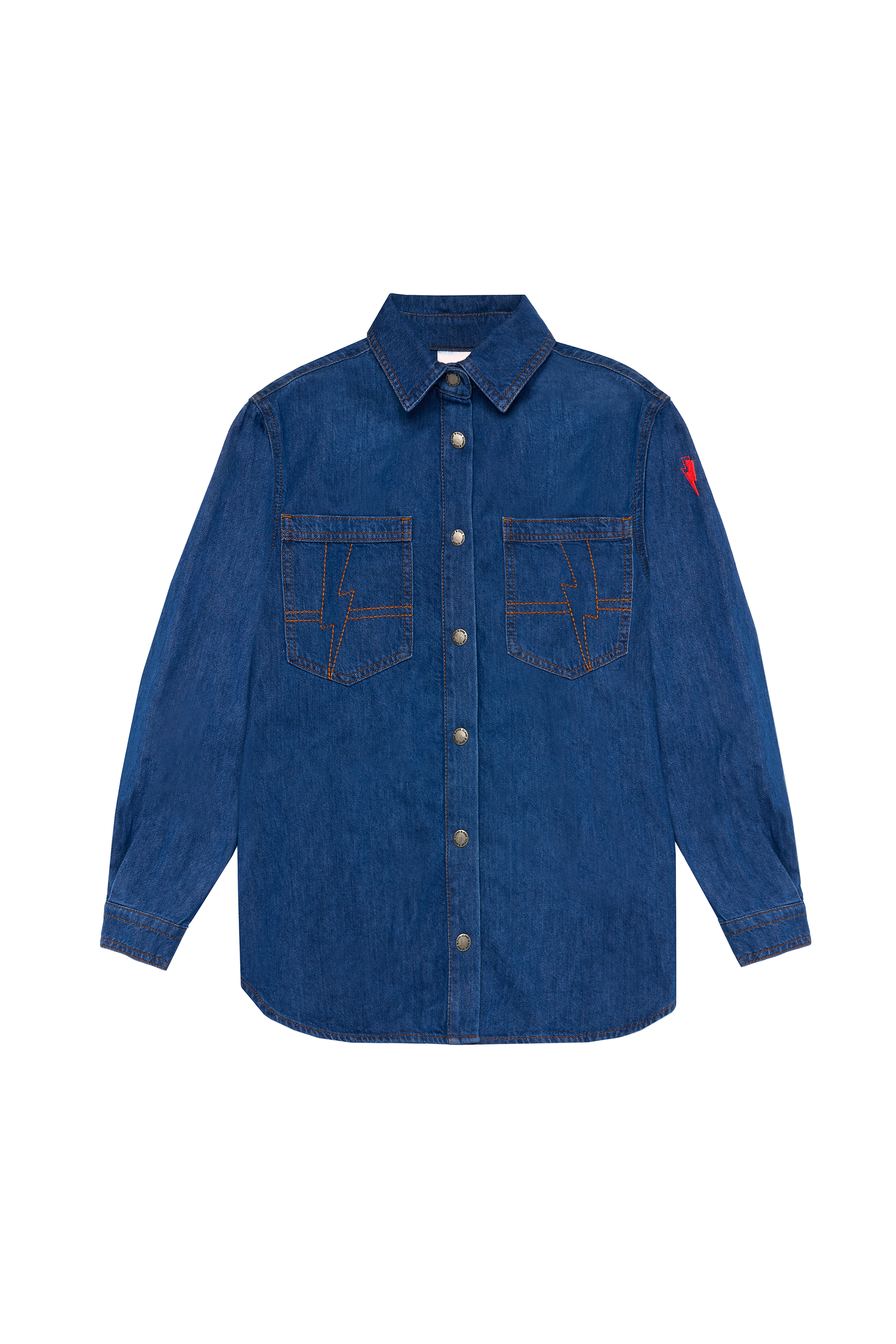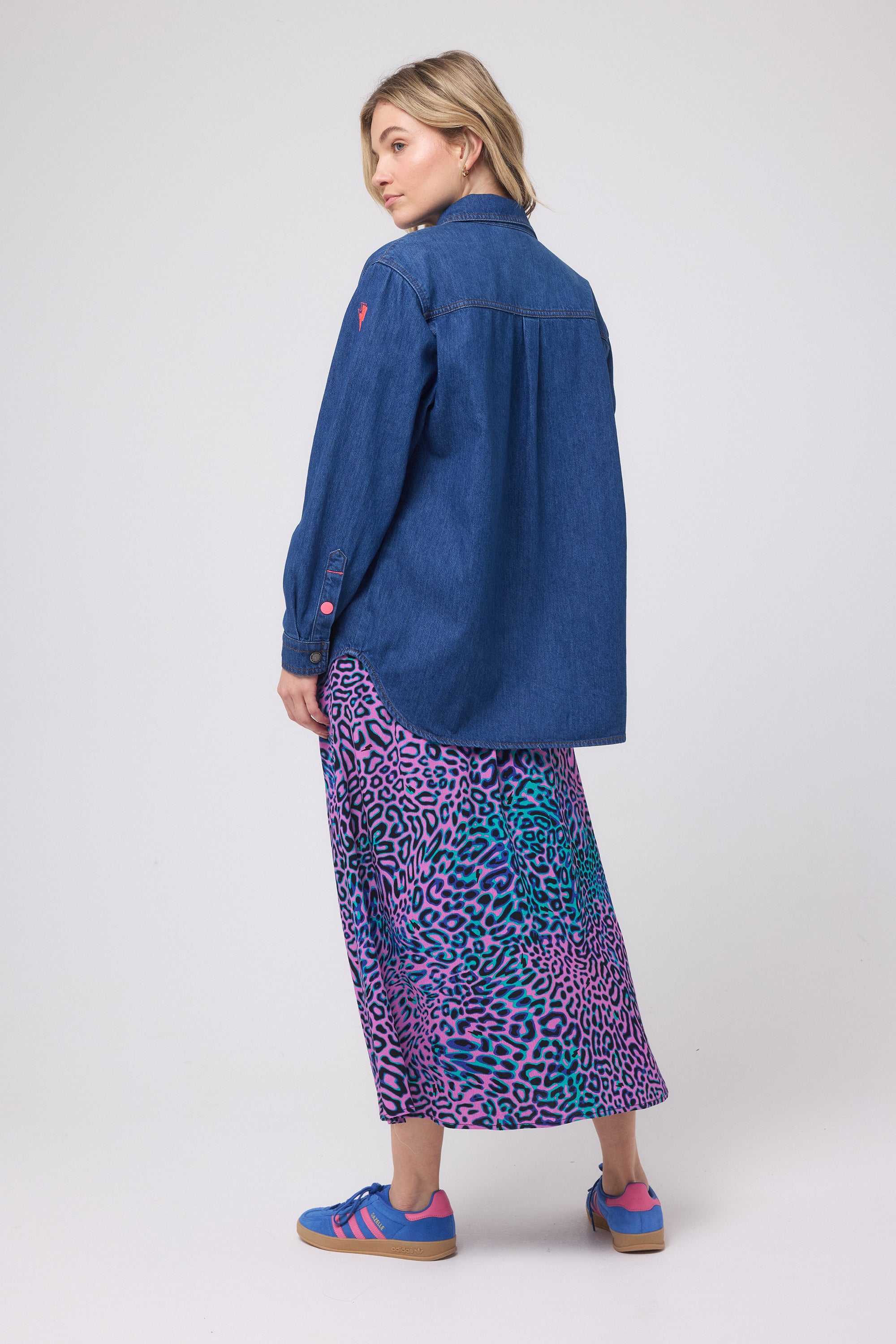 You asked, we delivered – our best selling denim shirt is back in a new wash. The pockets feature our signature embroidered lightning bolt design for a superpowered finish. Pair yours with a leopard skirt for a cool but comfortable look.