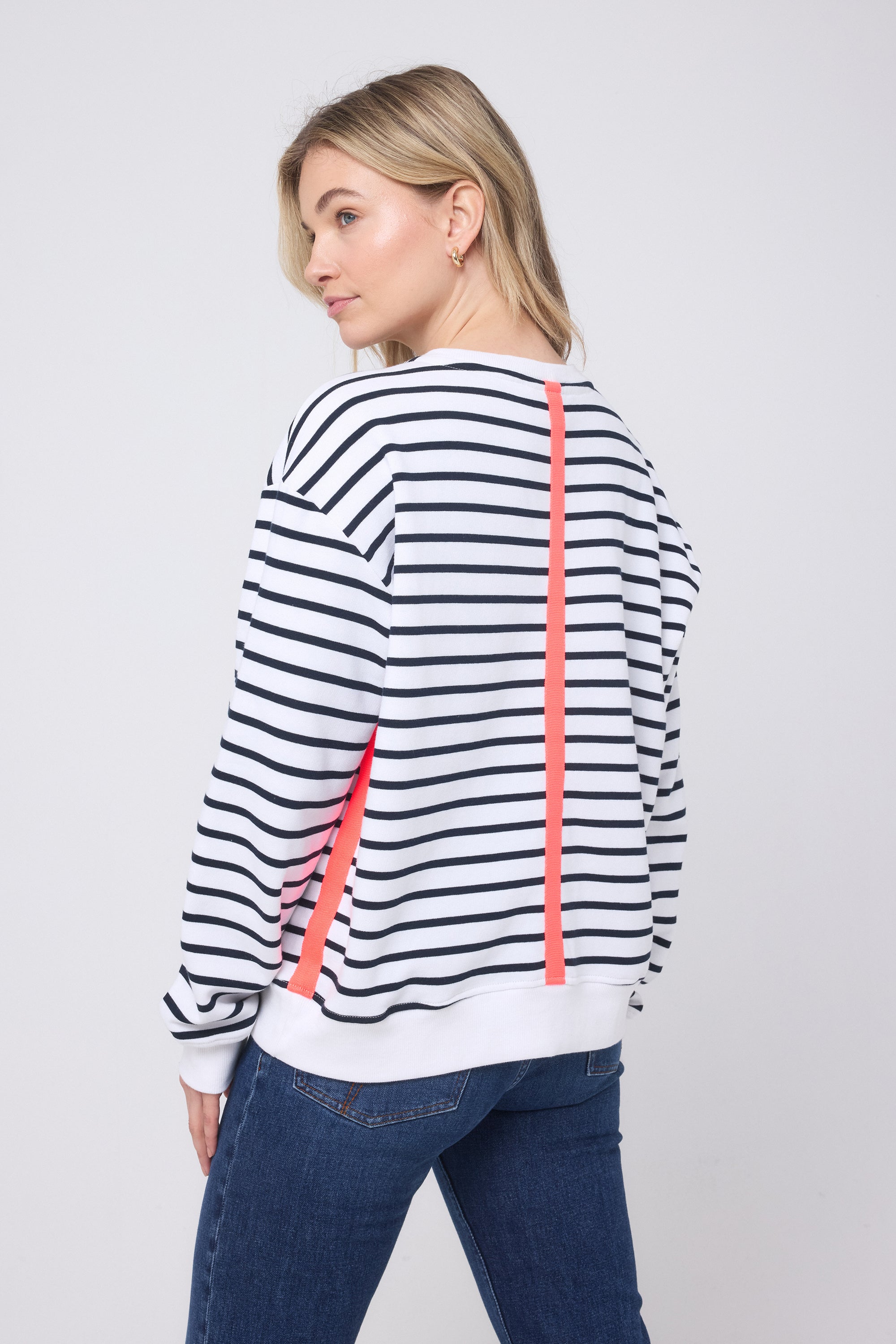 Our new navy and ecru striped sweatshirt is elevated with neon coral side and back stripe detailing for a bold, modern edge and is finished with an embroidered chest logo. This Ultimate Sweat is cut to a slightly shorter, more versatile length than our classic sweat, making it easy to layer and style across your wardrobe.