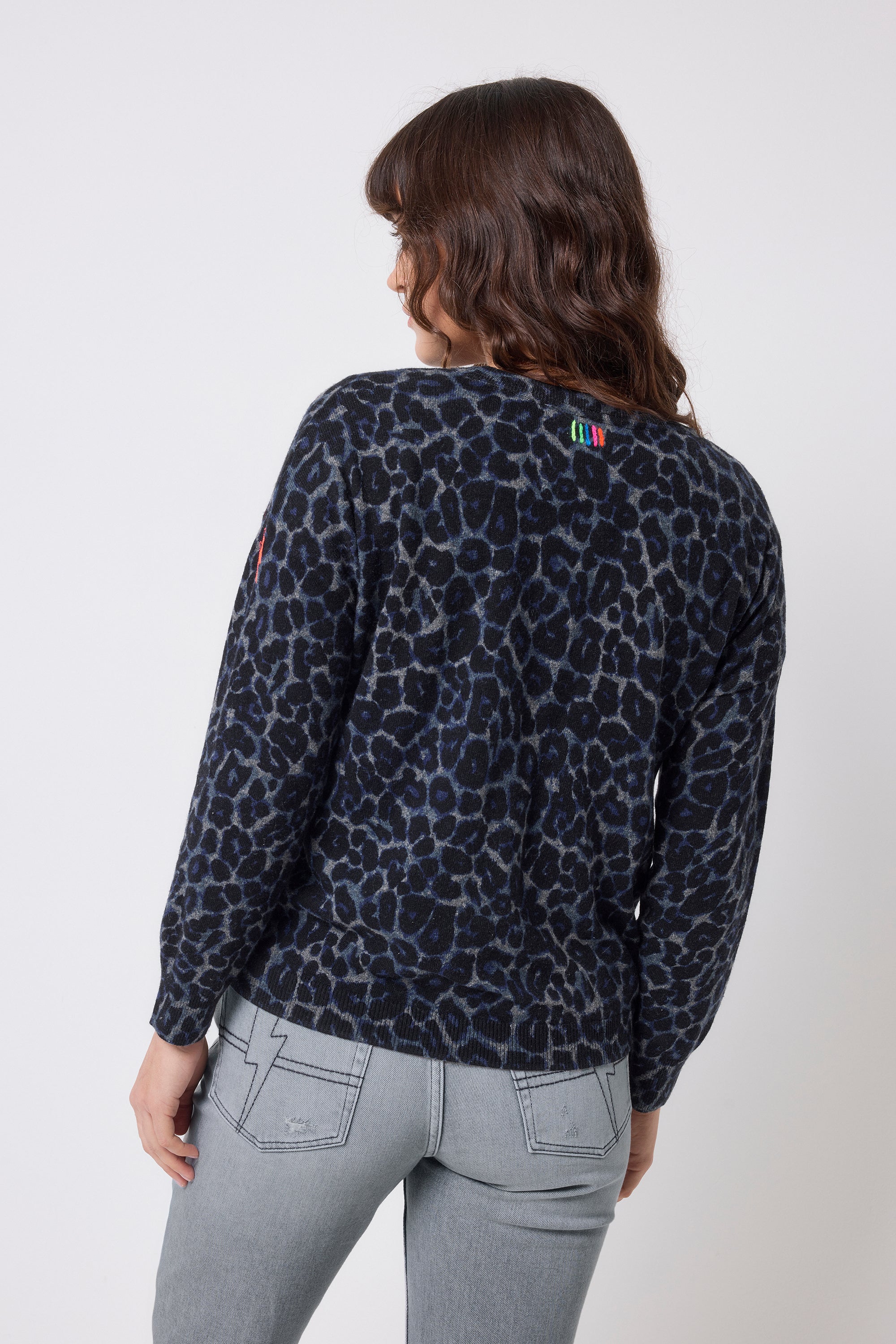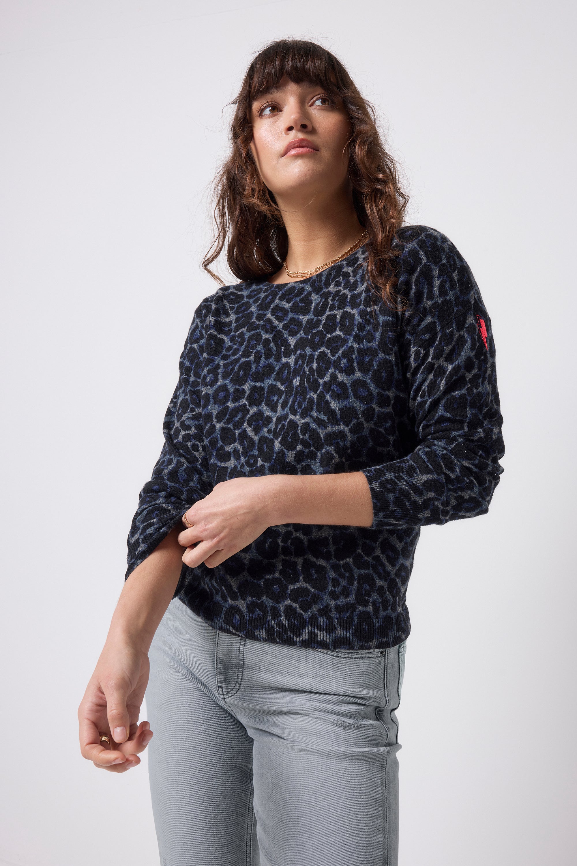Our soft, navy jaguar printed knit jumper is a wardrobe staple and a must-have for snuggling up. This charming soft knit boasts eye-catching hues. For seasonal chic pair with a denim skirt or jeans.