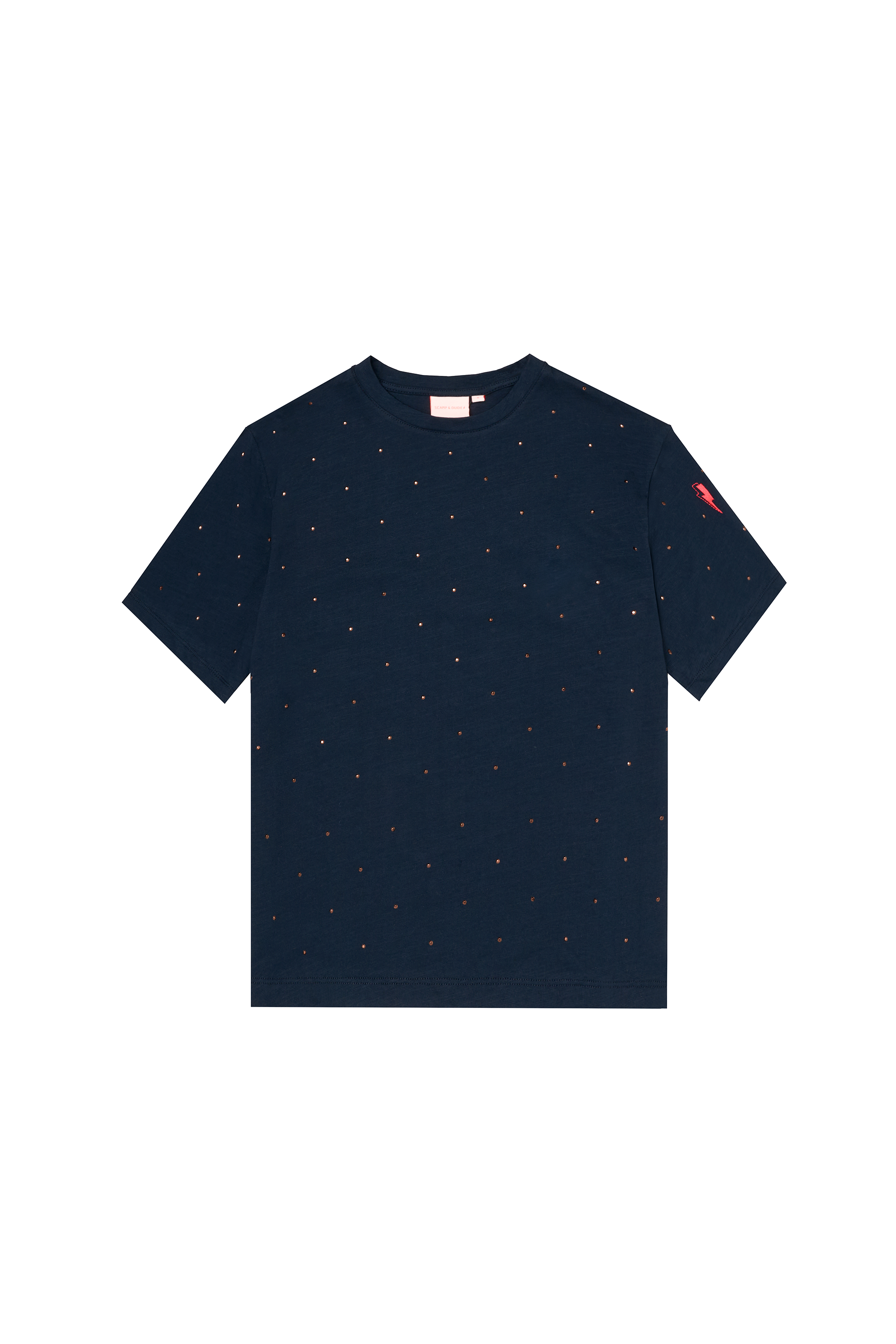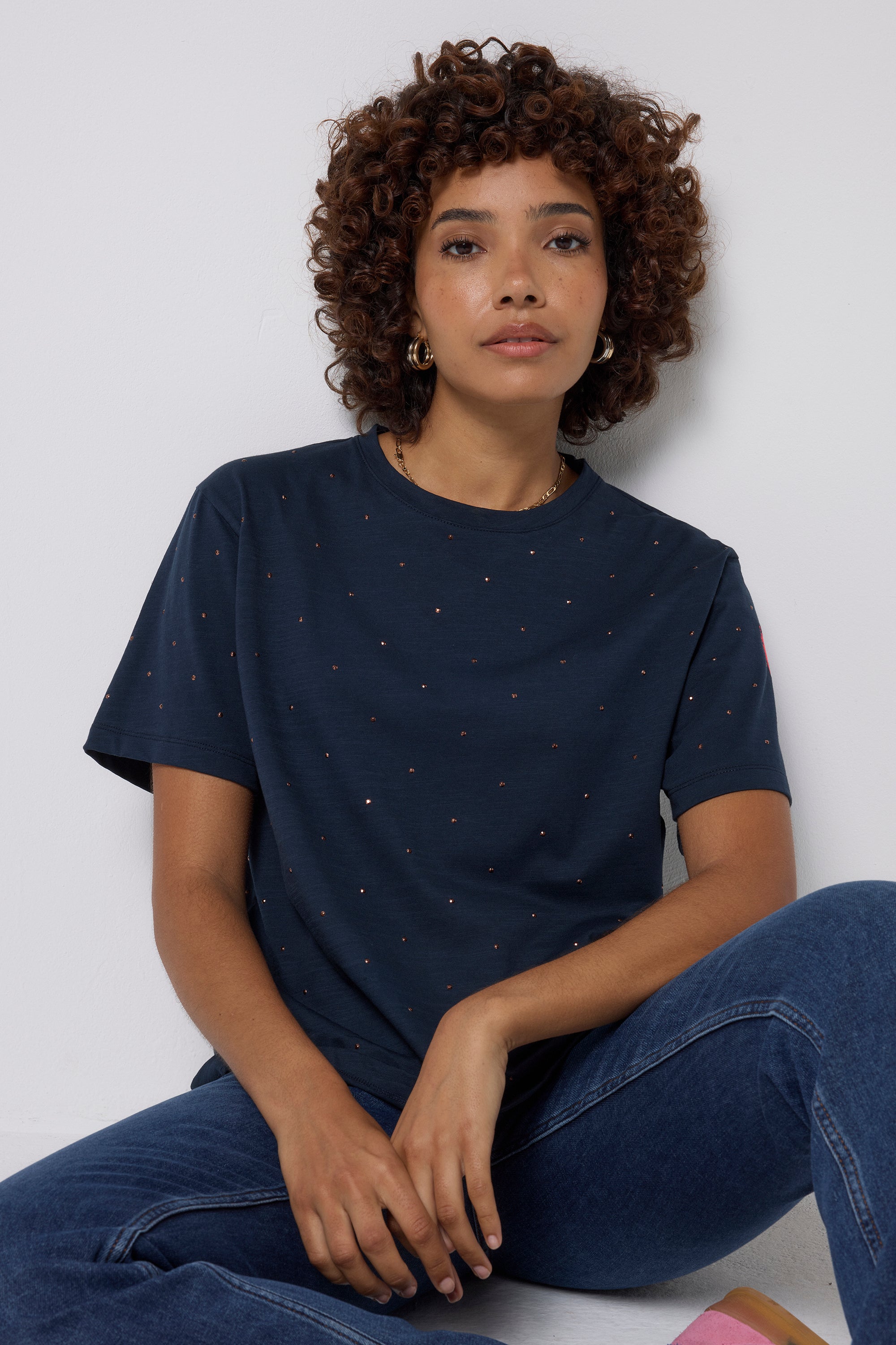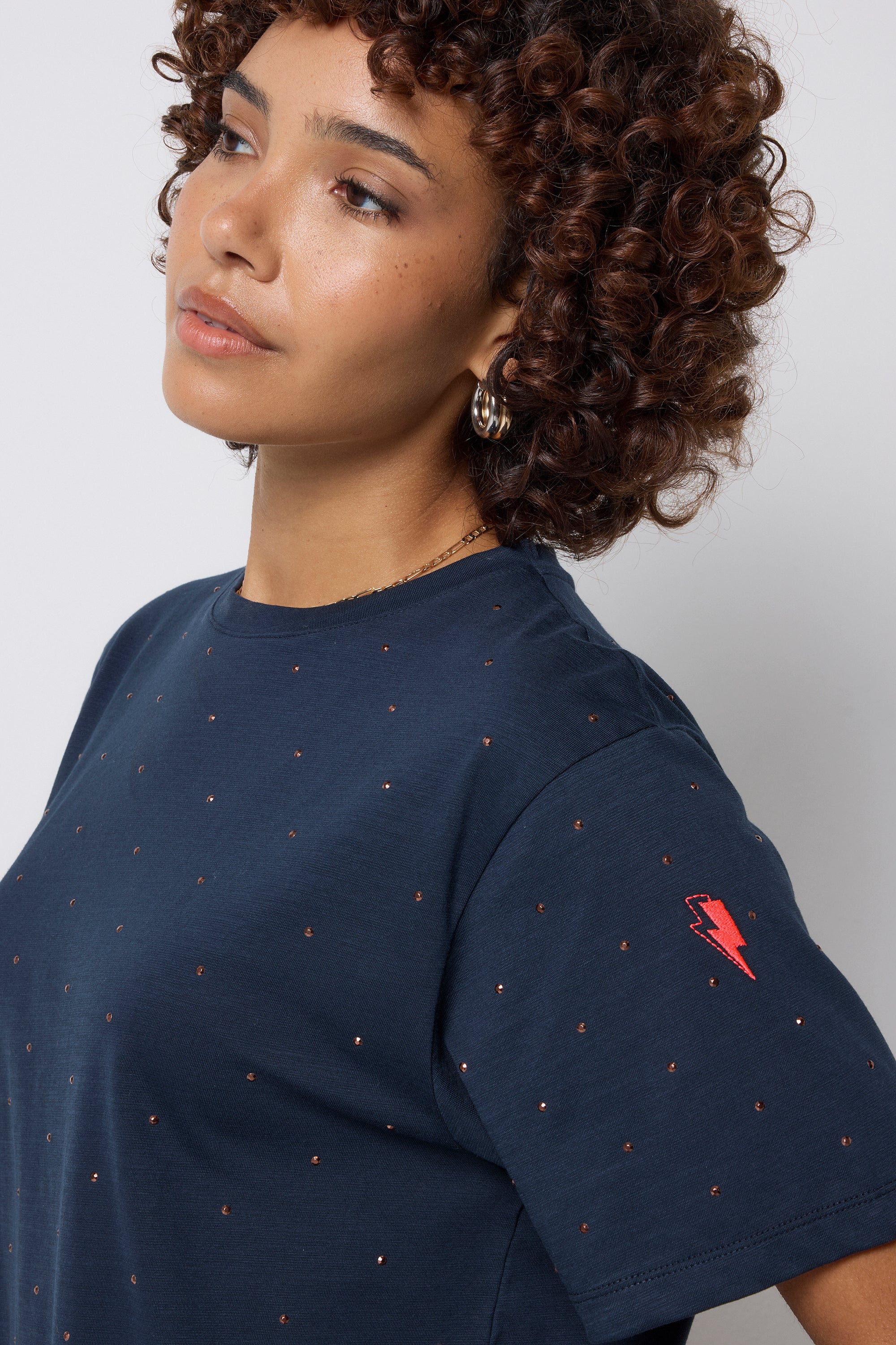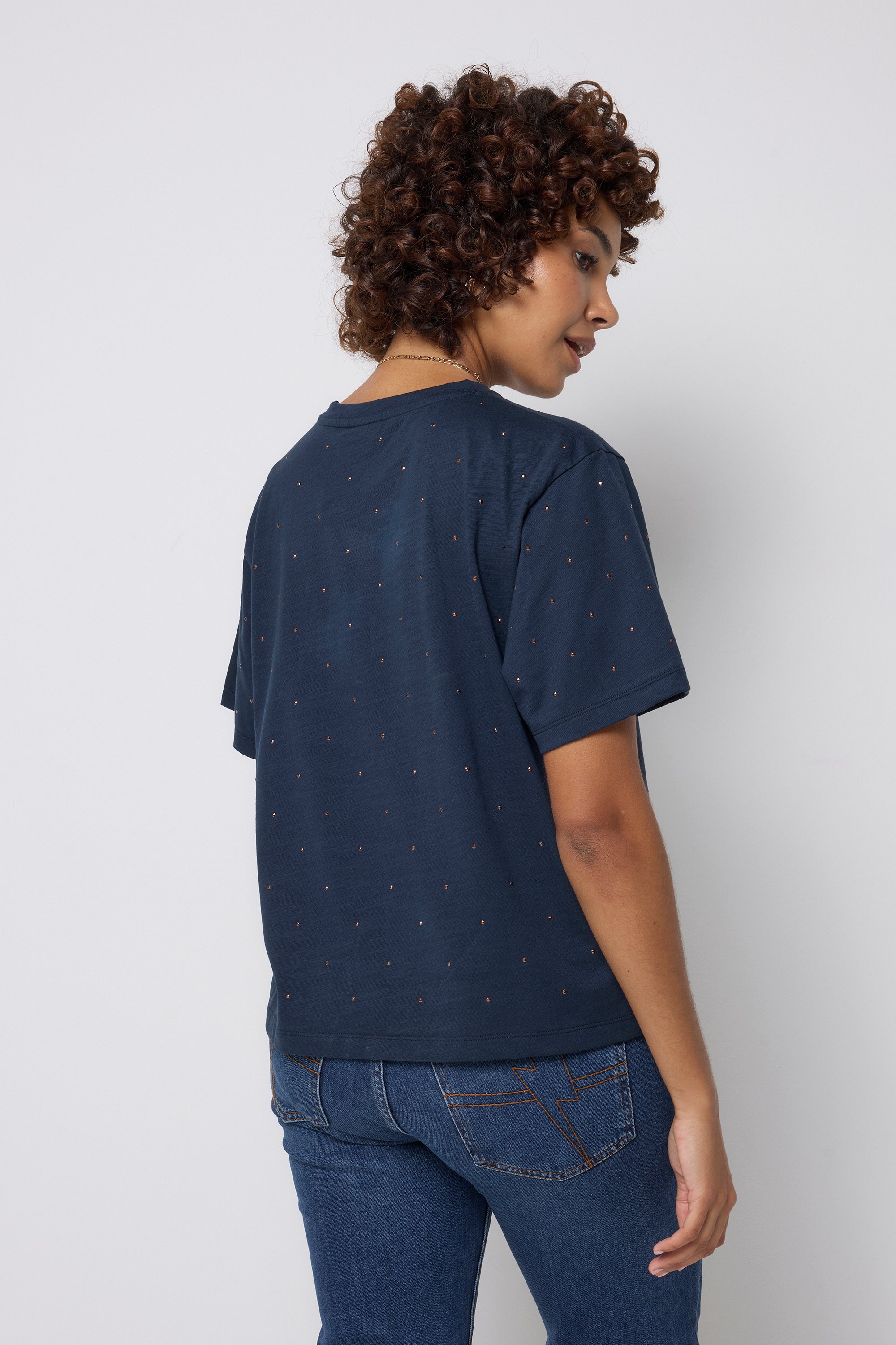 Our navy T-shirt with studs will become your off-duty staple. It's stylish, comfy and filled with superpowers. Complete the look with a pair of flattering Scamp & Dude jeans.
