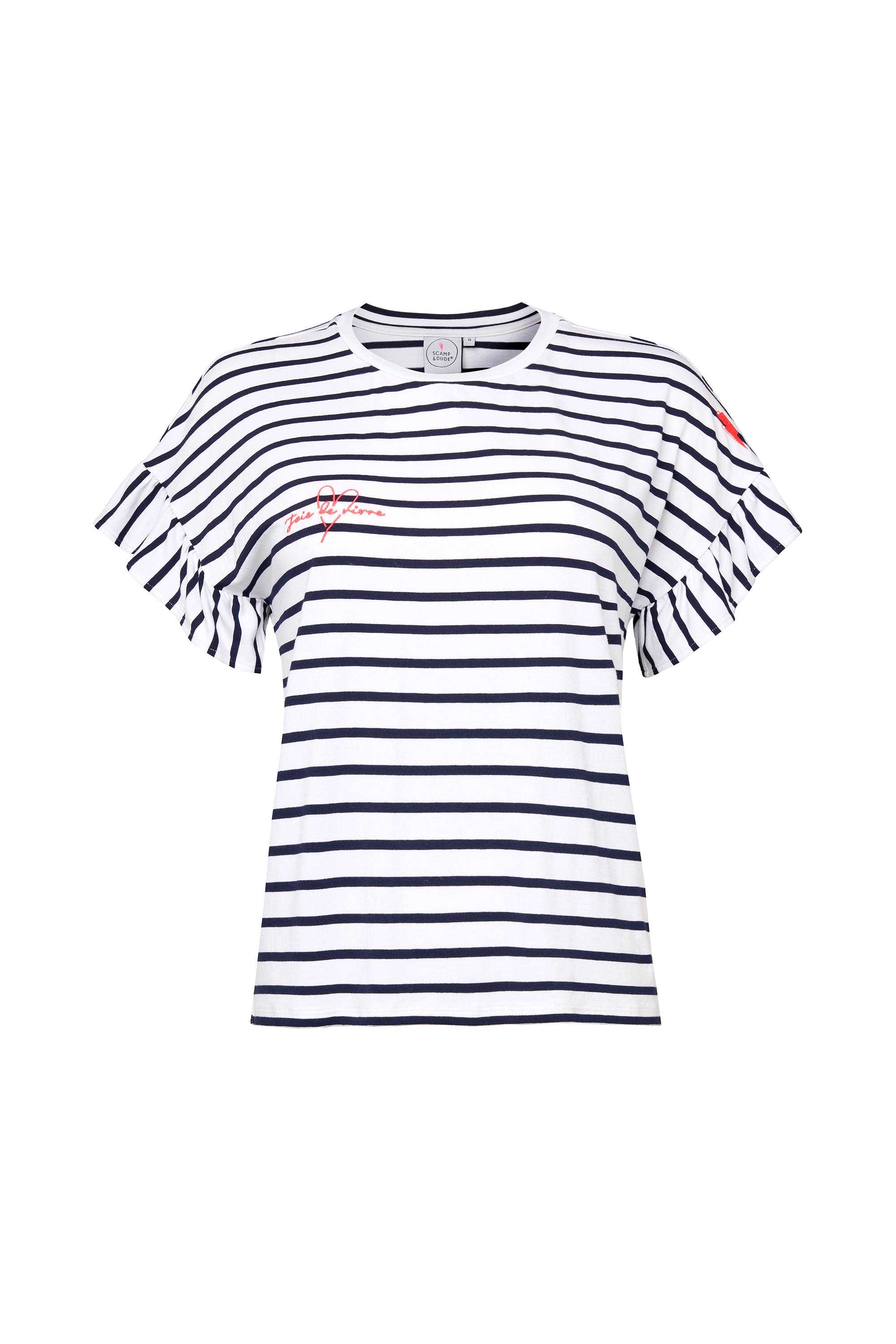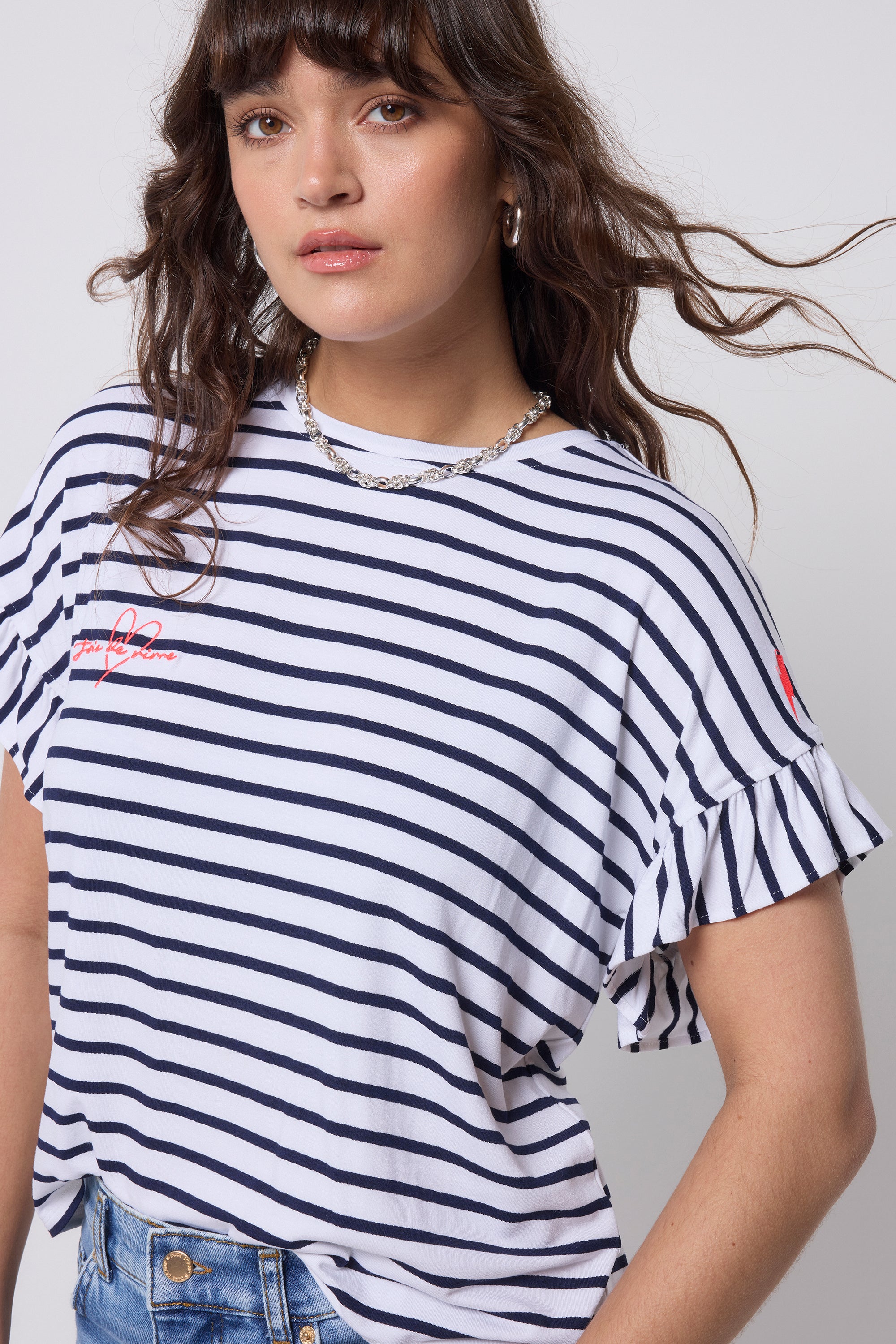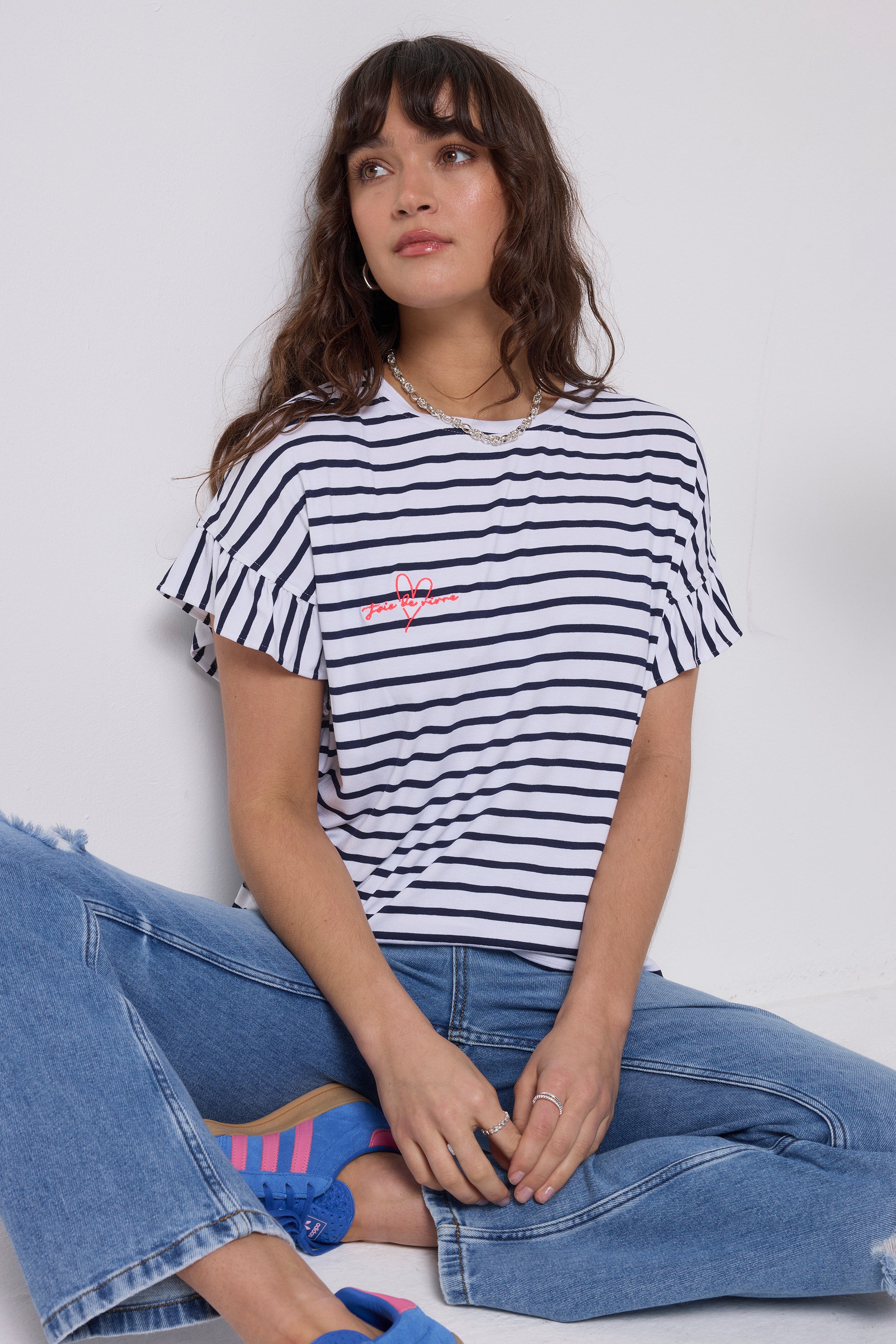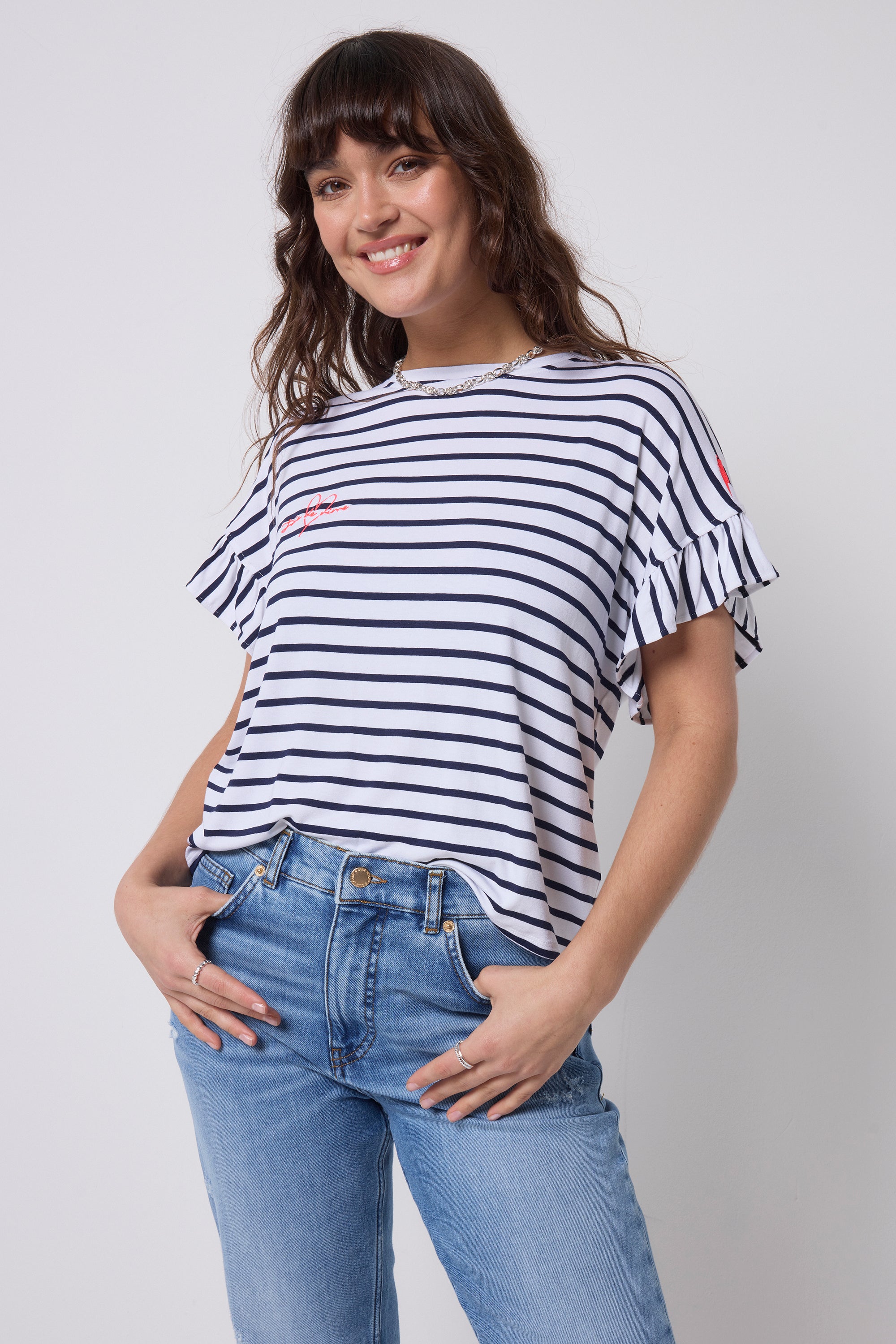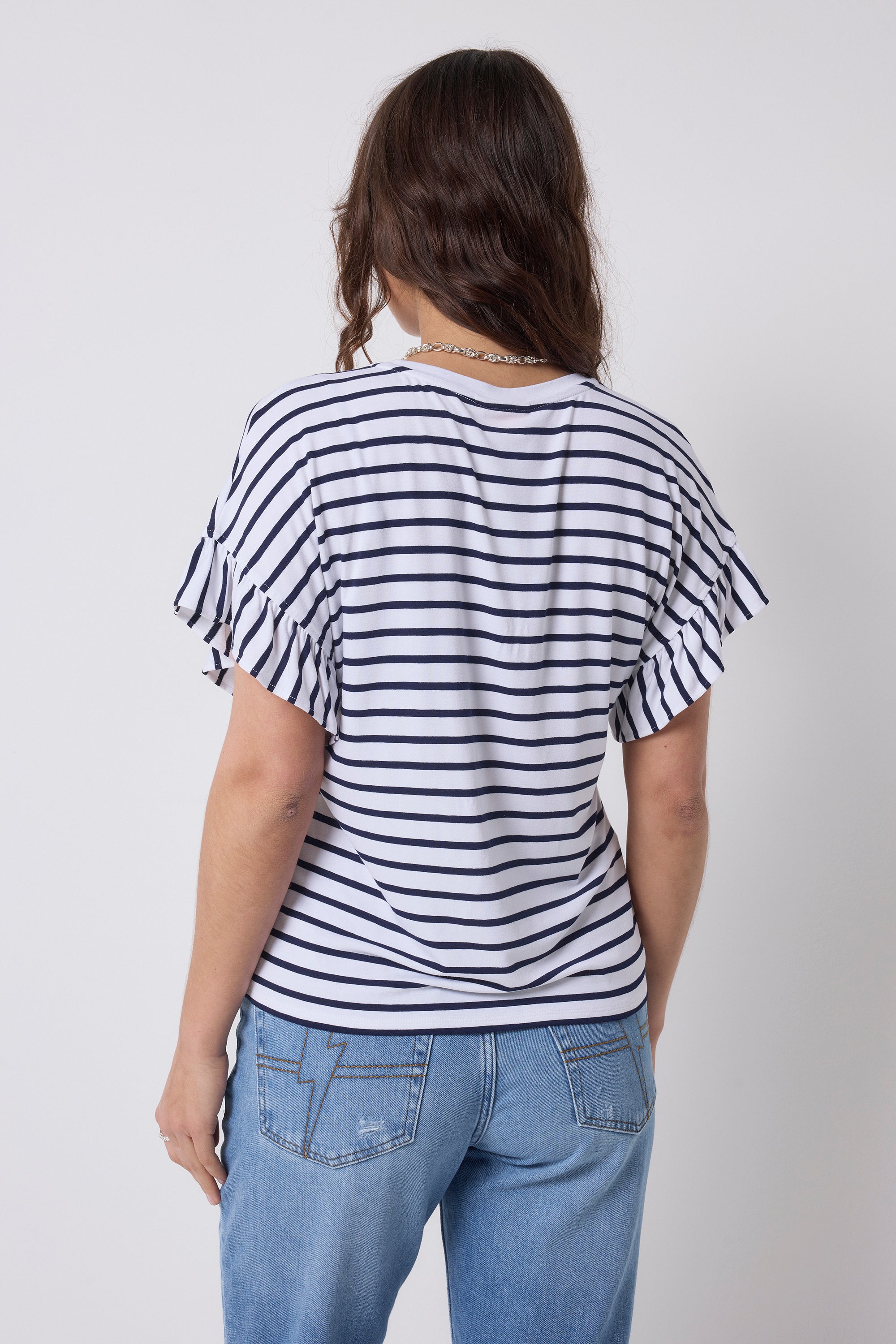 White with Navy Stripe Frill Sleeve T-Shirt