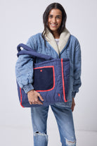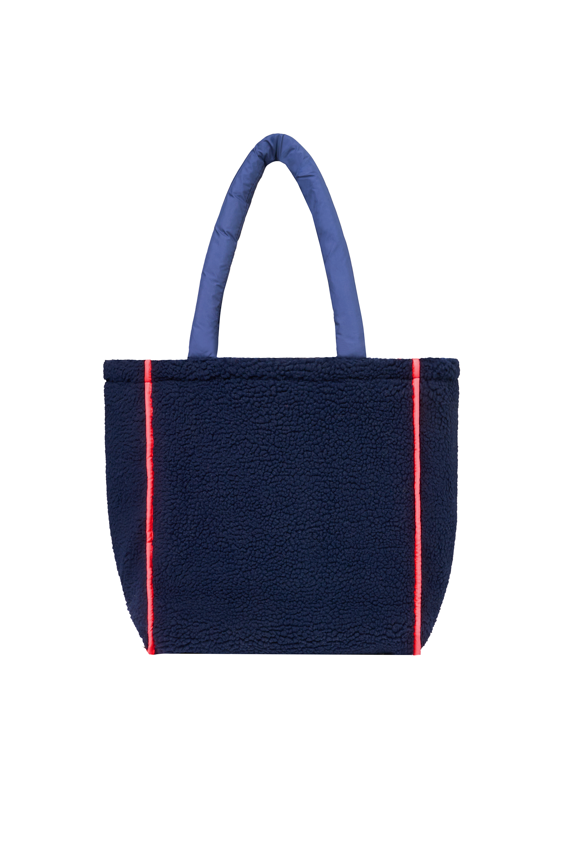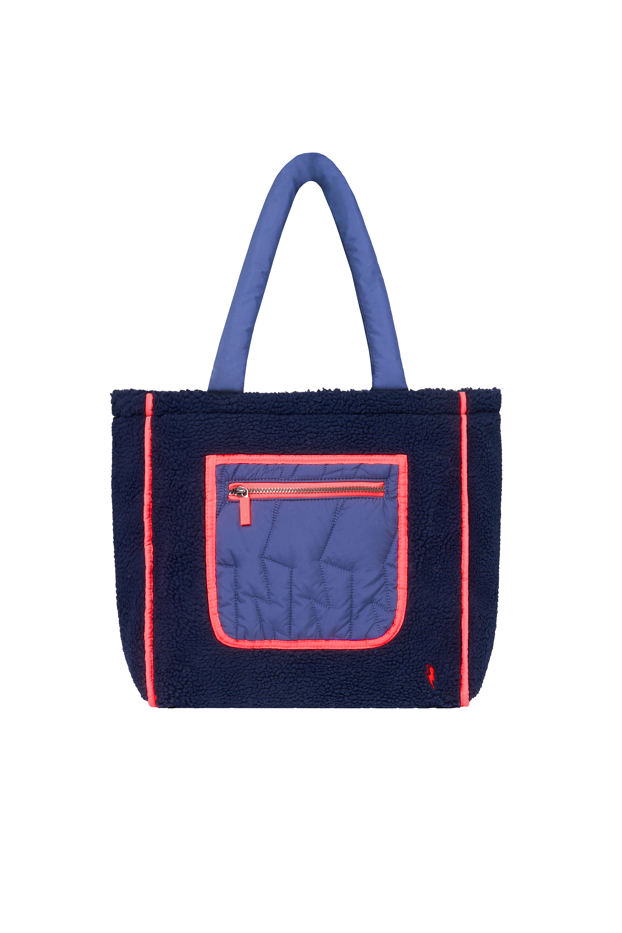 - Soft navy borg with navy quilted pocket with neon coral zipper