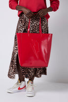 - Patent red tote bag