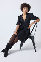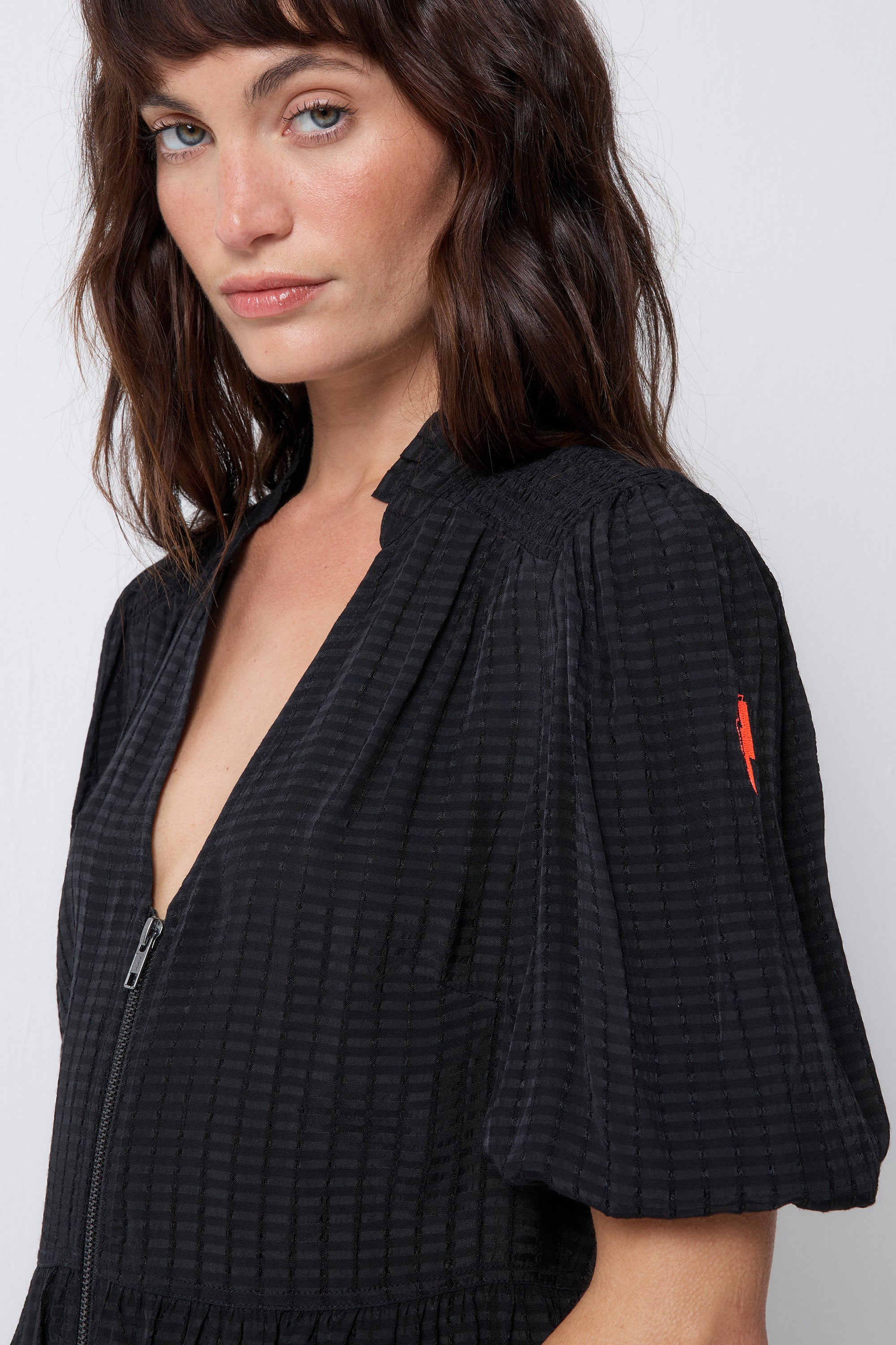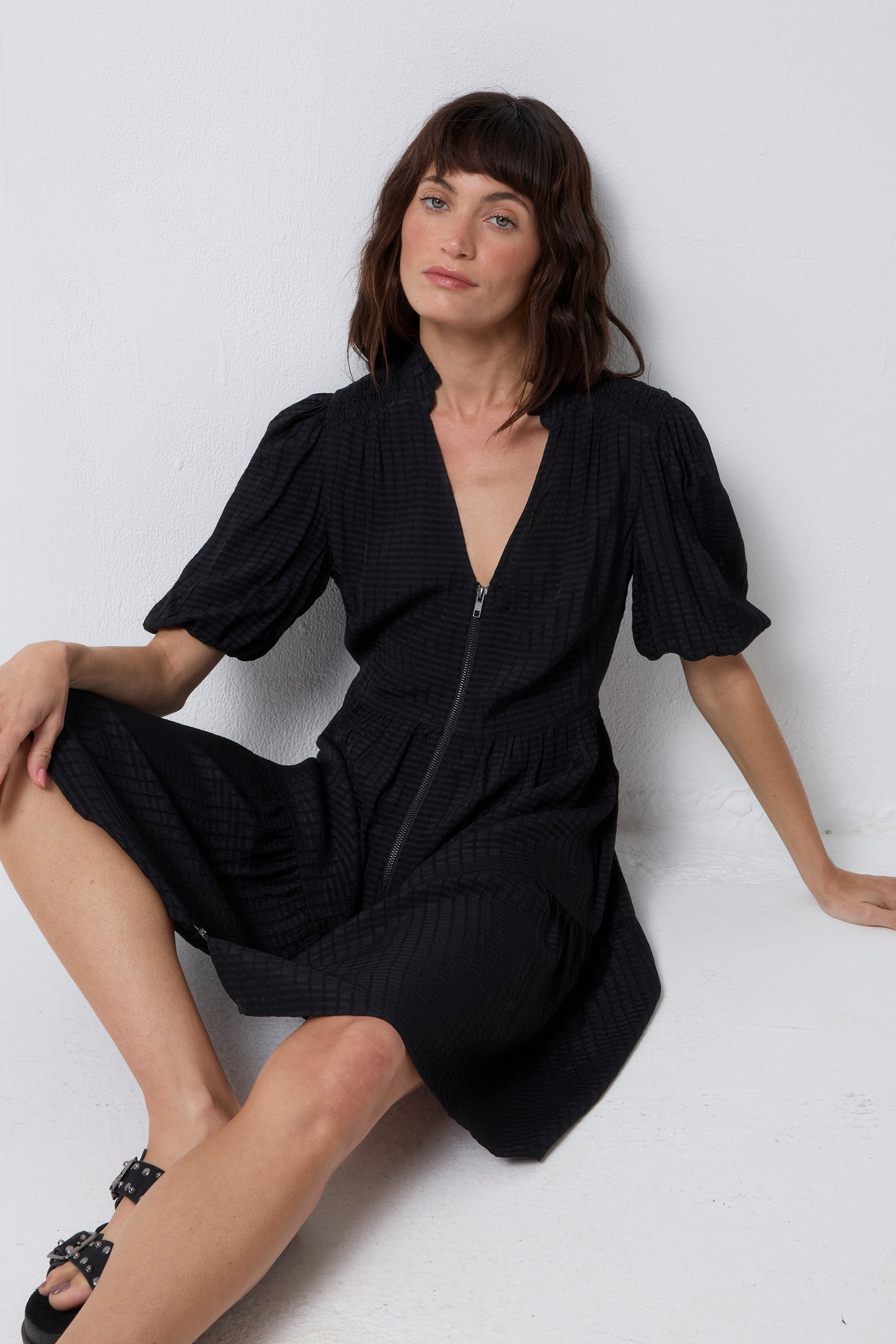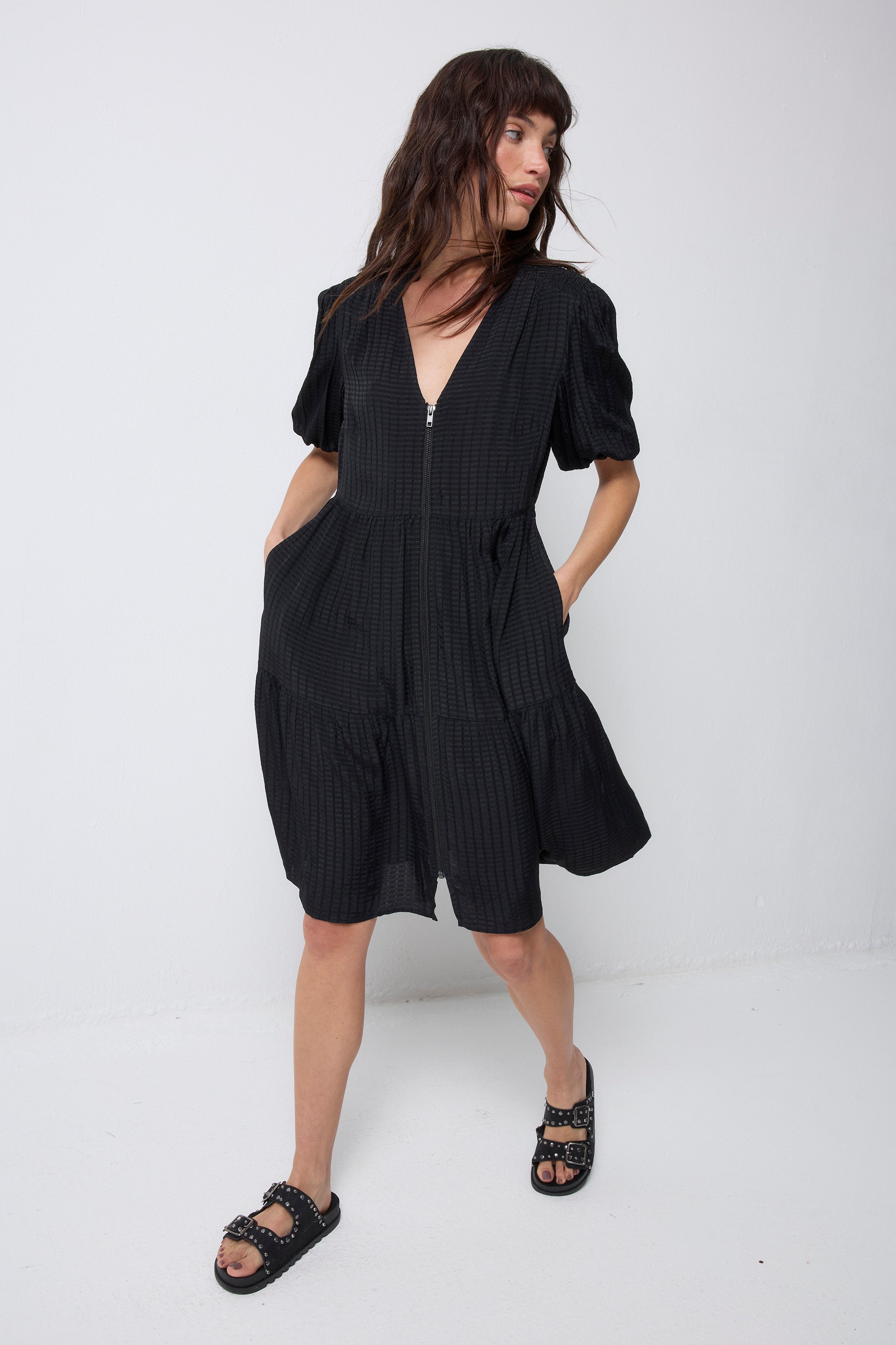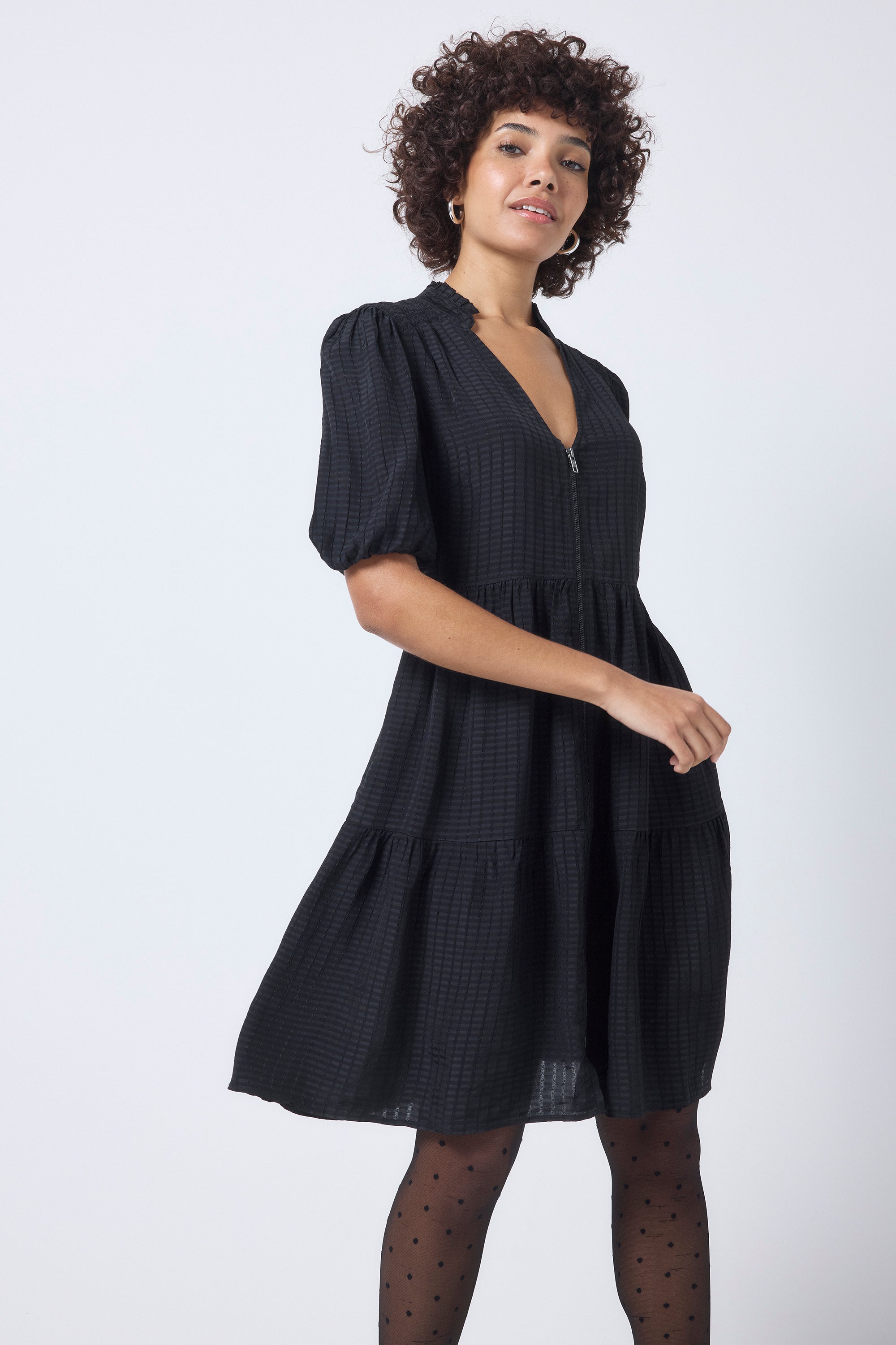 Crafted from soft viscose crepe this black zip detail tiered short dress is all about off-duty charm. It's crafted with romantic short blouson sleeves, a smart v-neckline and a feature front zip fastening. For a flattering silhouette, the short length skirt fall in tiers in a flattering fit and flare style.