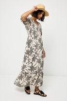 Neutral with Black Palm Spring Shirred Puff Sleeve Maxi Dress