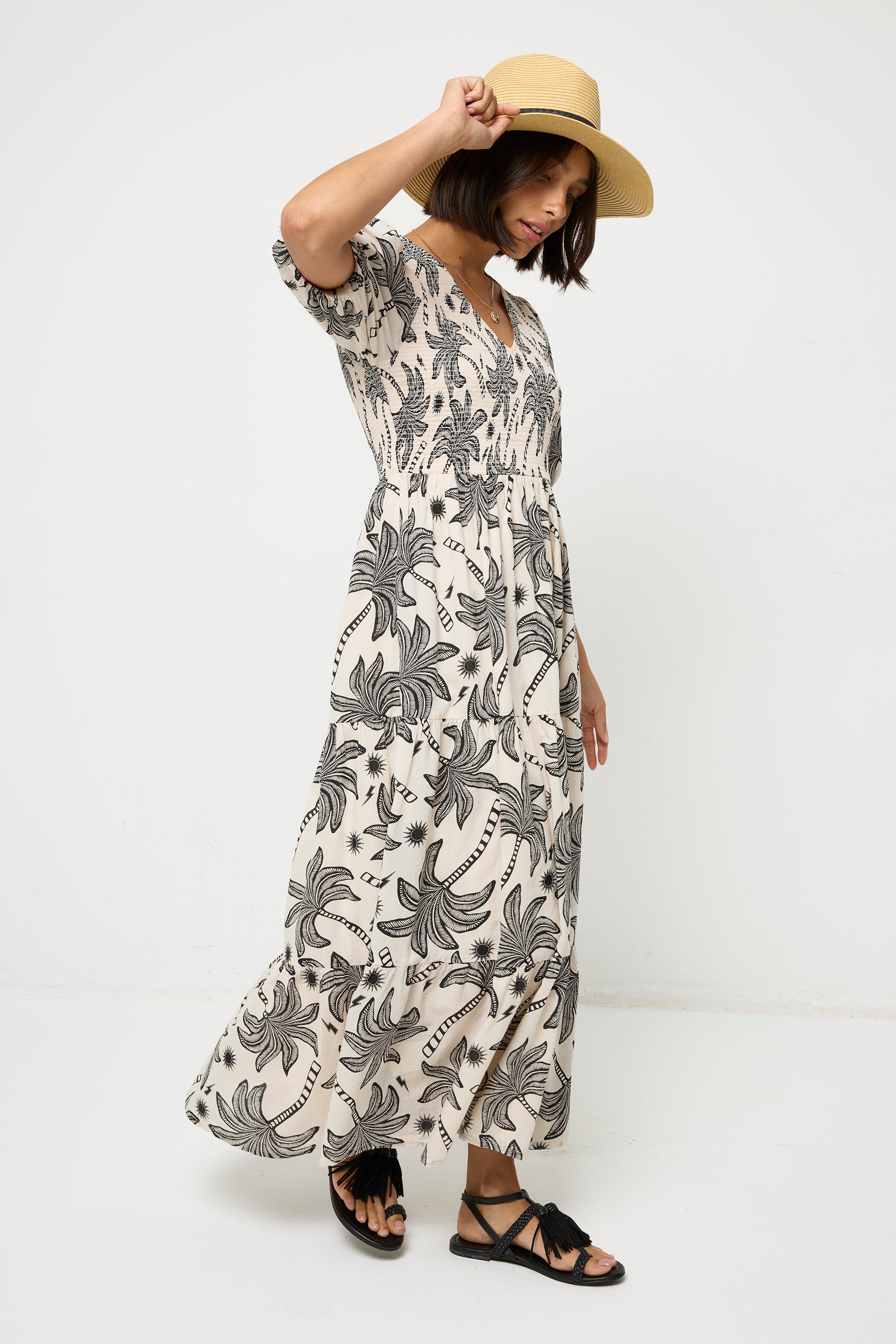 A timeless addition to your wardrobe, our neutral with black palm spring maxi dress was designed to impress. With short puffed sleeves, a tiered skirt and vintage-inspired shirred bust detailing, it's definitely a need - not a want.