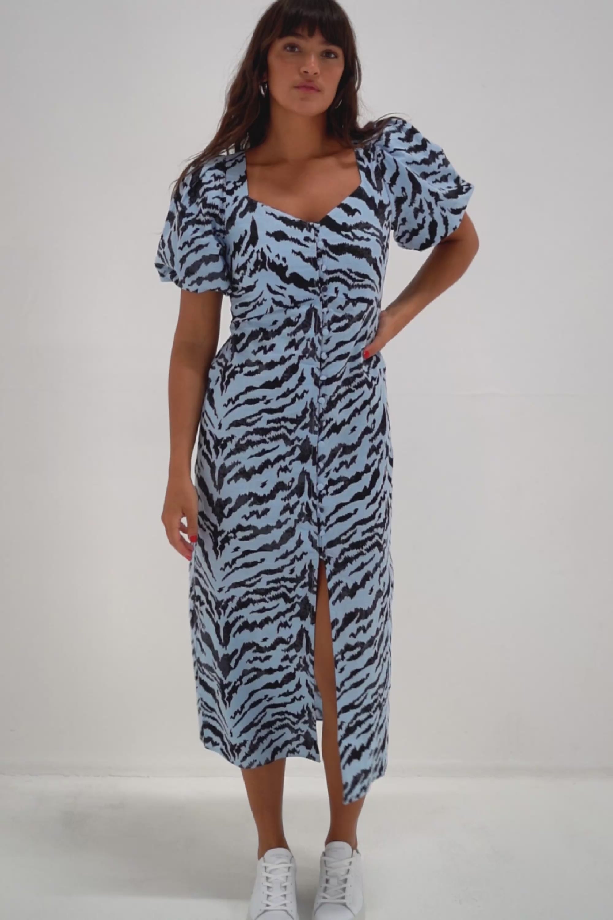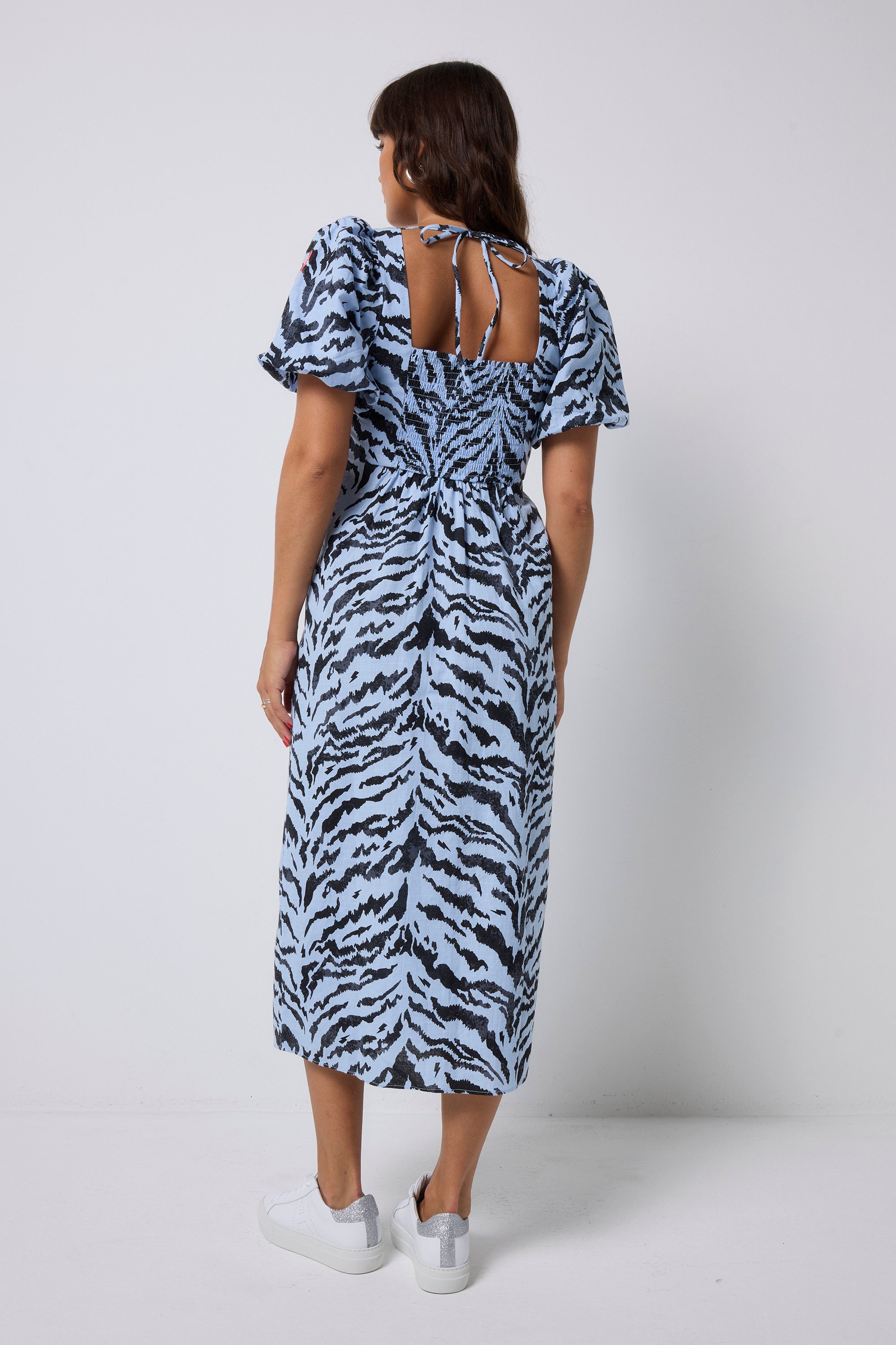 Pale Blue With Grey Texture Tiger Puff Sleeve Midi Tea Dress